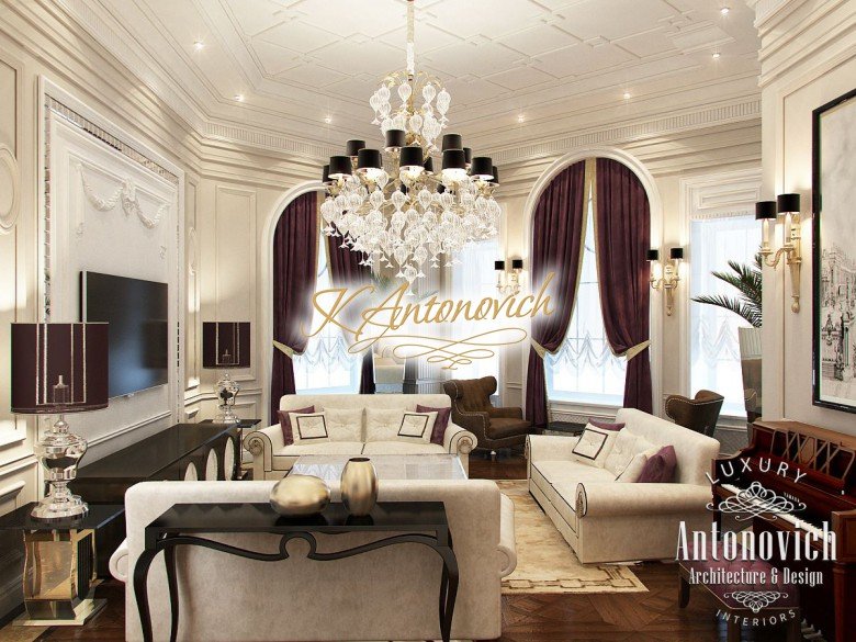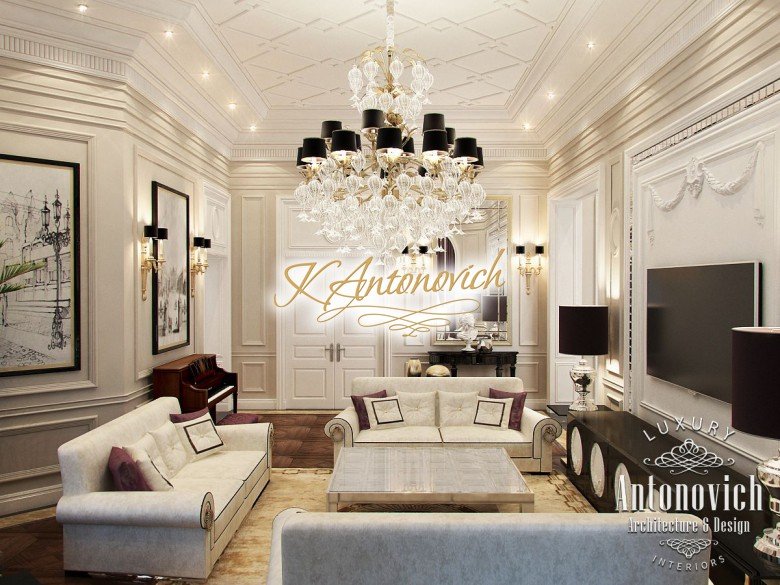Design for living room invariably becomes the culmination of great interior stories told in each project by Luxury Antonovich Design Studio in Dubai. Interior design in the style of neoclassicism has an exquisite and refined look. Aesthetic perfection is present in projects of the studio. These features combined with the authors genius ideas make works of the studio recognizable all over the world. Living room designs in the style of modern classics are intended to emphasize the refined taste of the house owners. The walls are decorated with stucco of monochrome creamy hue. Against this background, realistic paintings and beautiful lamps look very expressive. In laconic living room design, there are bright and rich accents. One of these bright and elegant accents became the beautiful chandelier with large crystal pendants. Luxurious velvet curtains of ruby color in the windows decoration look fascinating. Accents of softness and home warmth became the floor of precious dark wood with special impregnation, as well as soft natural carpet in the center of the room. Upholstered furniture sets a cozy mood in the living room interior. Sofas and chairs are upholstered in soft velvet of creamy hue. The luxurious dining room continues the comfortable living room interior. The dining table with a top made of natural marble is surrounded by elegant upholstered chairs and two luxury armchairs in the romantic style with high backs. Living room decoration by Luxury Antonovich Design Studio meets the highest international standards.