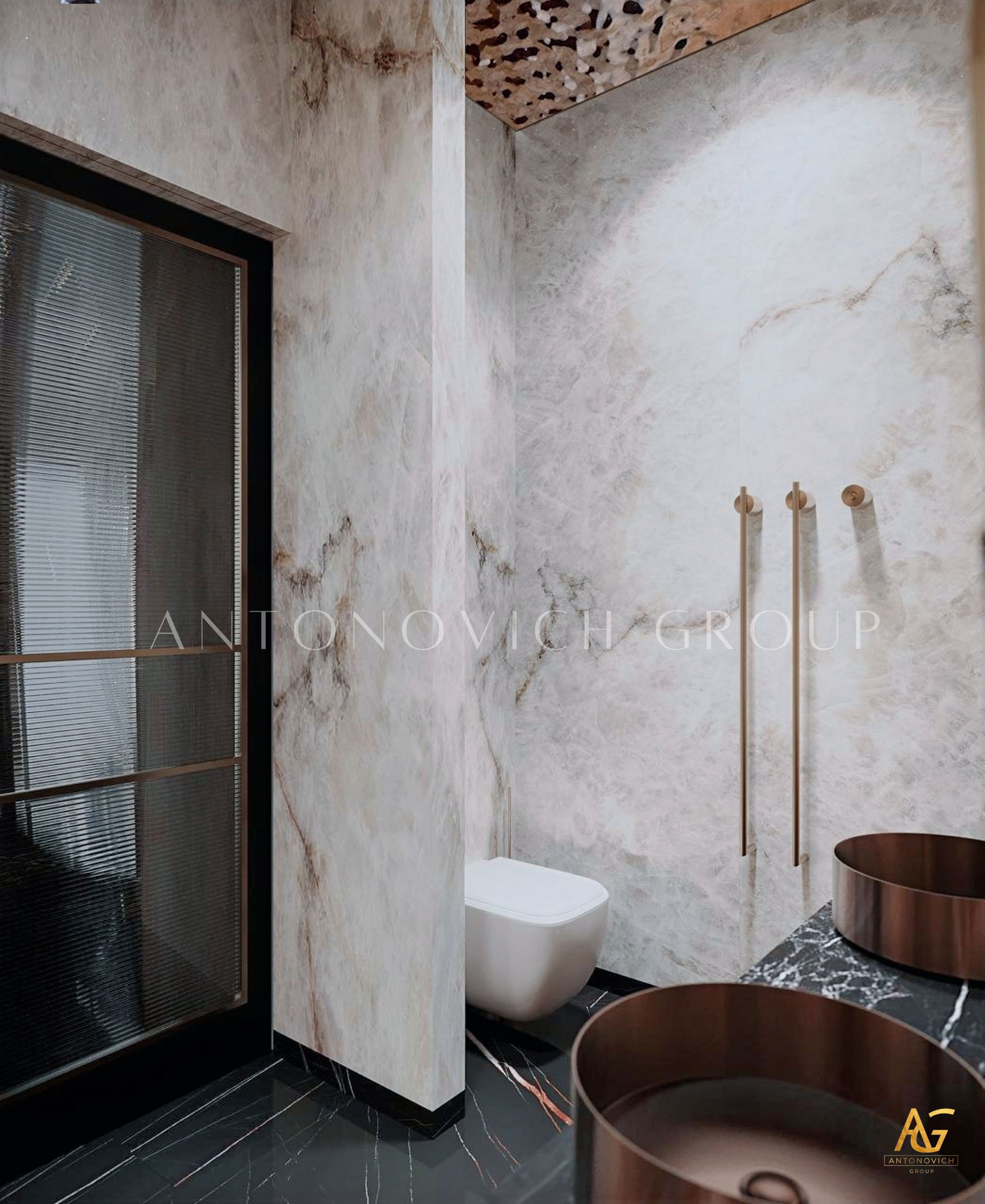 Antonovich Group offers complete turnkey bathroom interior fit-out services, managing the entire process from concept development to final execution. This integrated approach allows for strict quality control and consistency across all design and construction stages.