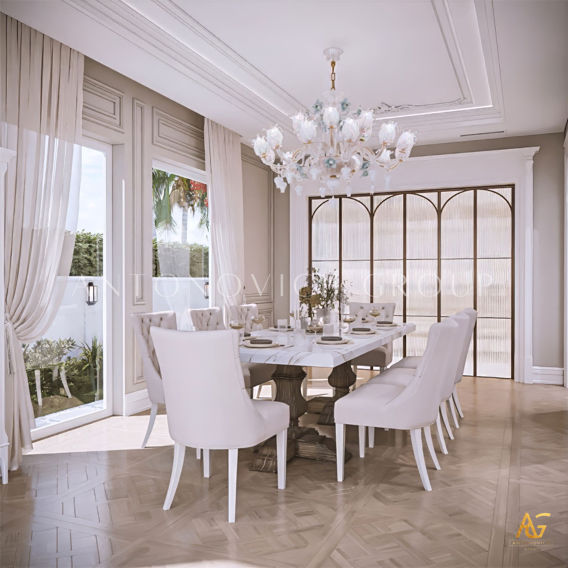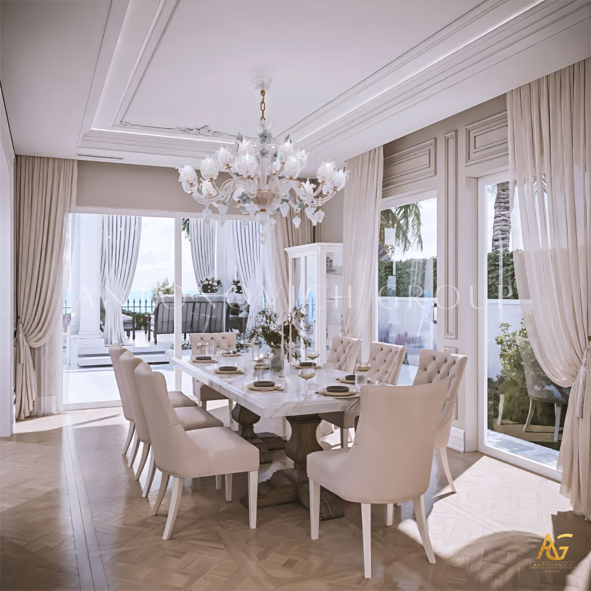 A Luxury Dining Area, when designed by Antonovich Group, is a harmonious blend of beauty, comfort, and craftsmanship. Every element — from the grand chandelier above to the polished marble beneath — is thoughtfully curated to create an atmosphere of timeless sophistication.
