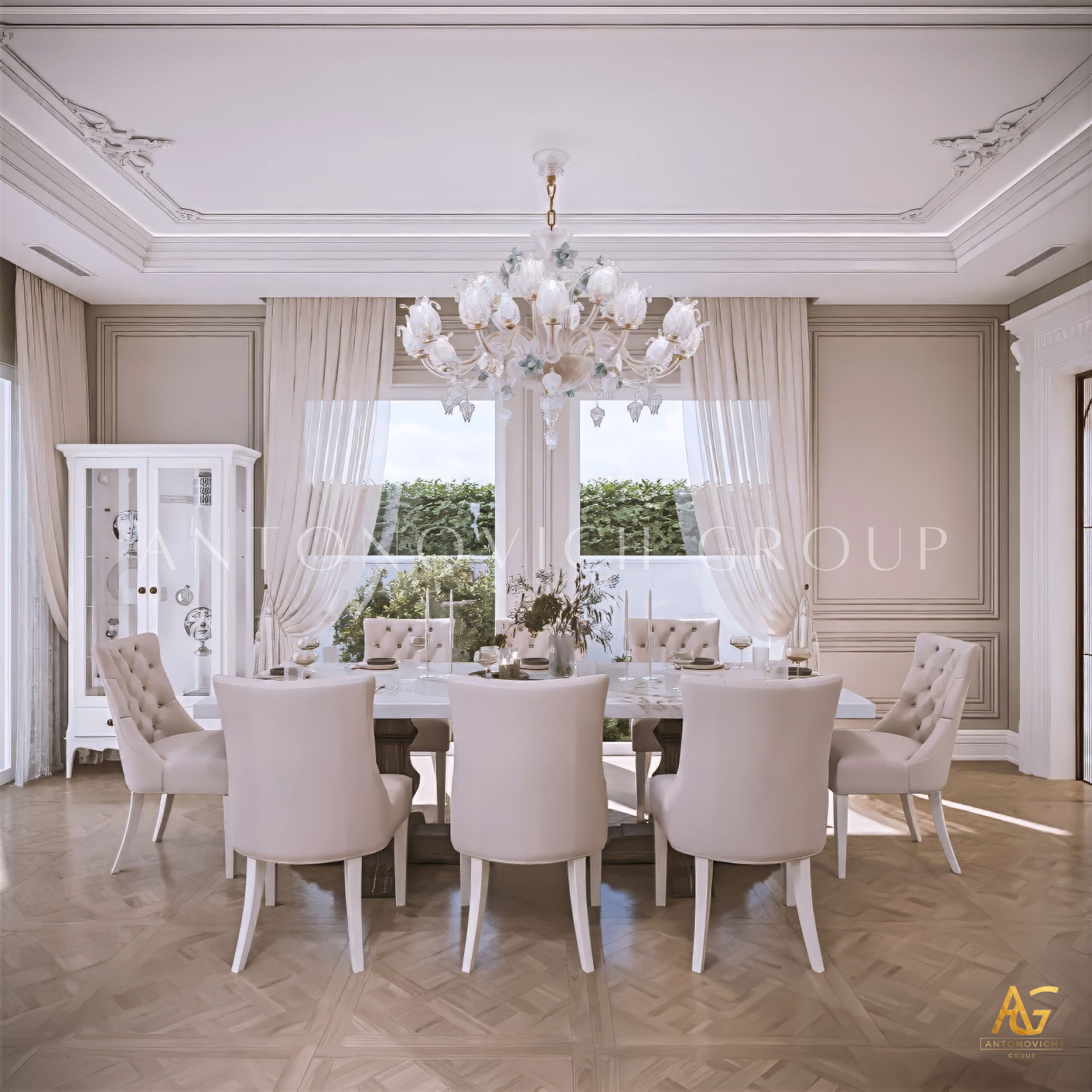 Pair the table with custom-designed dining chairs featuring plush upholstery, elegant frames, and ergonomic comfort. Antonovich Group’s bespoke furniture line offers made-to-measure options that blend craftsmanship with design harmony.