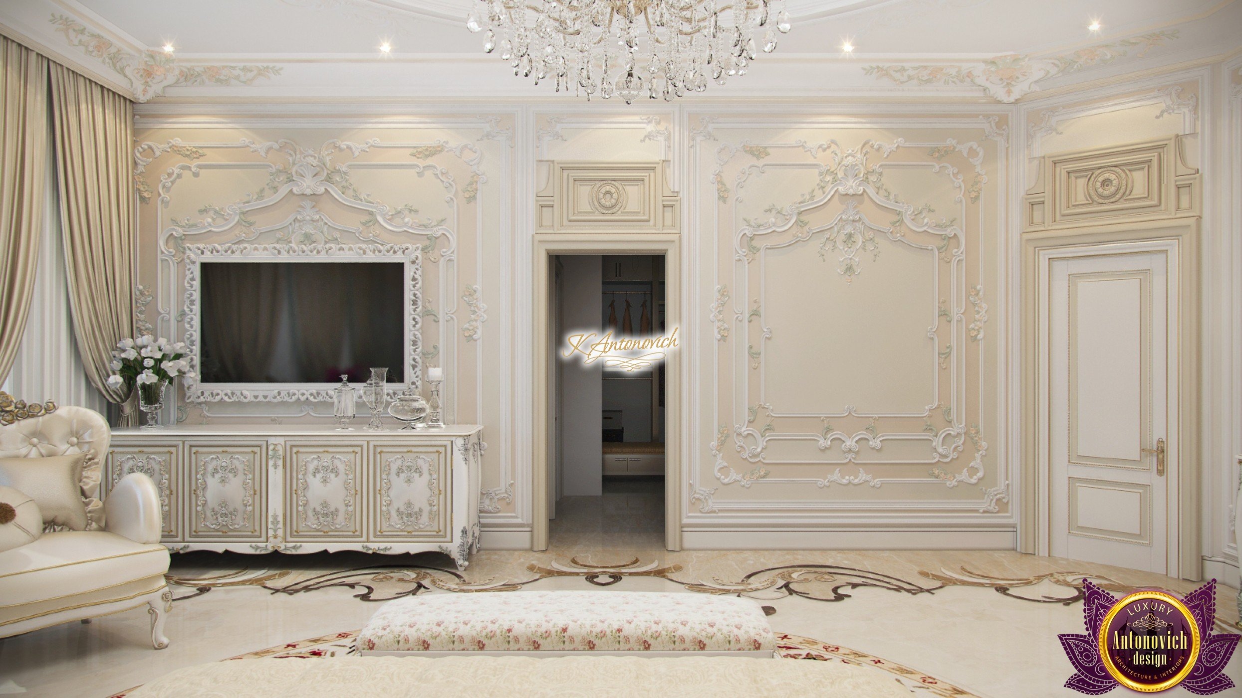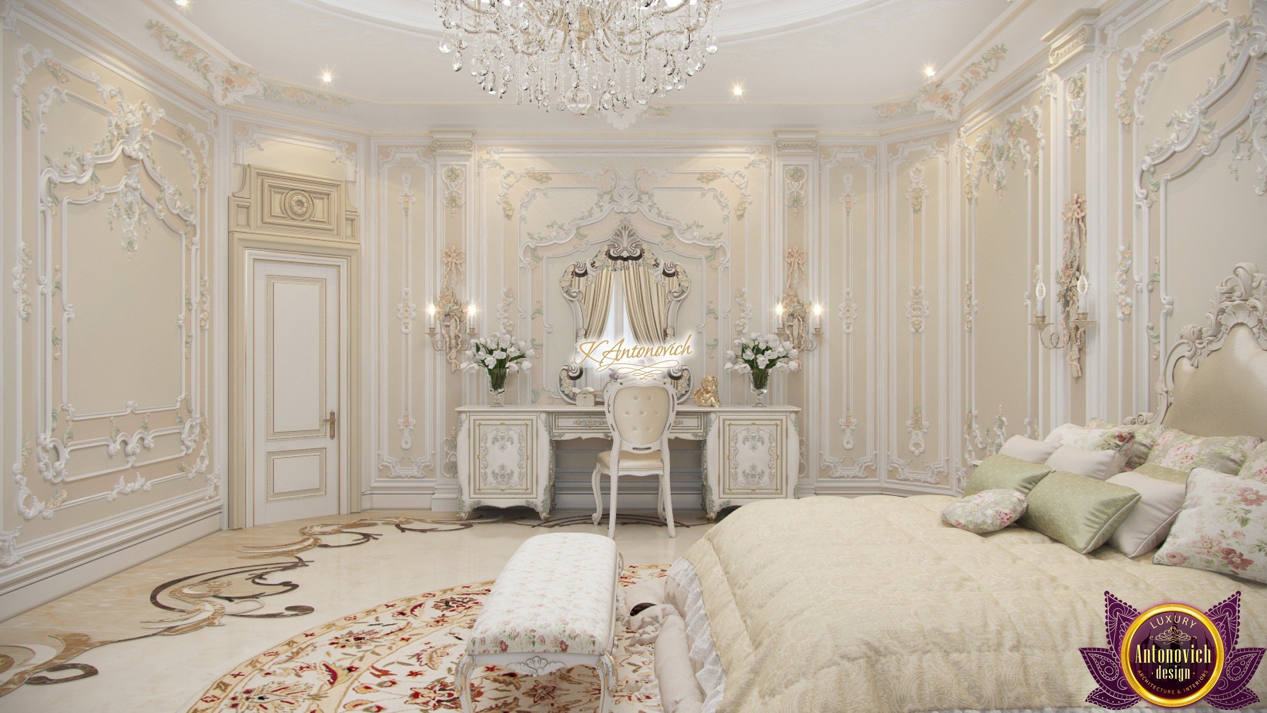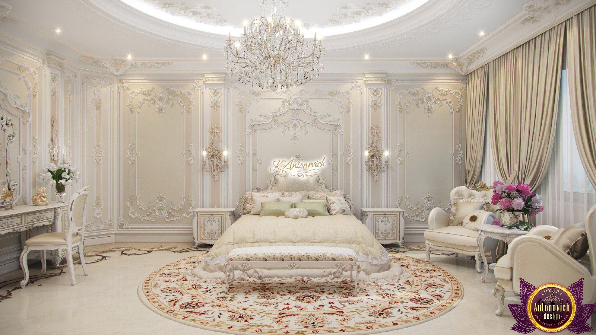 Improvisation with classic interior design always gives the unique charm of each house projects. And in this best bedroom designs, designers of interior company Antonovich Design added gentle and romantic accents of French style in the spirit of Provence. You can easily notice these fascinating aspects in a decoration of walls and ceilings. Beautiful romantic accent in the interior design for bedroom of the walls and the ceiling became precisely stucco molding. Charming floral compositions perfectly fit into master bedroom interior design and filled it with a lush and cozy mood. The ceiling is decorated with deep niche the right circular shape, which is around the entire perimeter illuminated by backlighting line. A delightful play of light and shade provides by an elegant crystal chandelier. interior design consultant exquisitely repeated the ceiling decoration motives in the decoration of floors. Curls of carved patterns on the marble floor design echoed also with contours of curls stucco decoration. Round natural carpet with floral ornament repeats the outlines of niches in the ceiling.