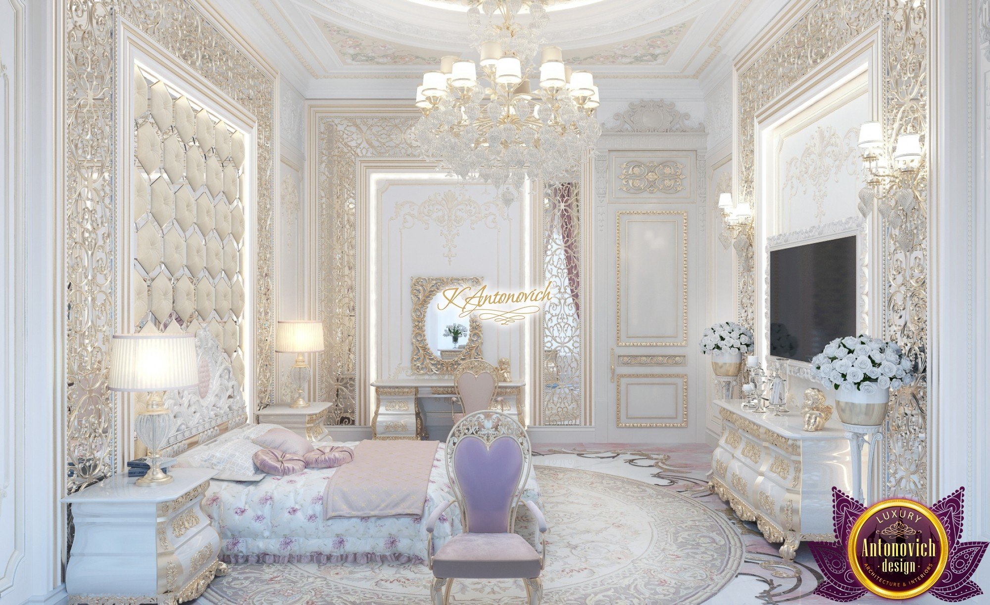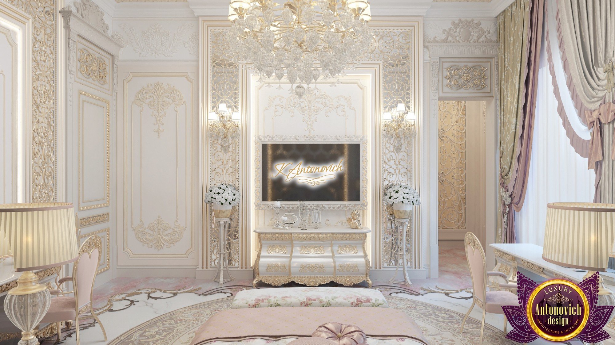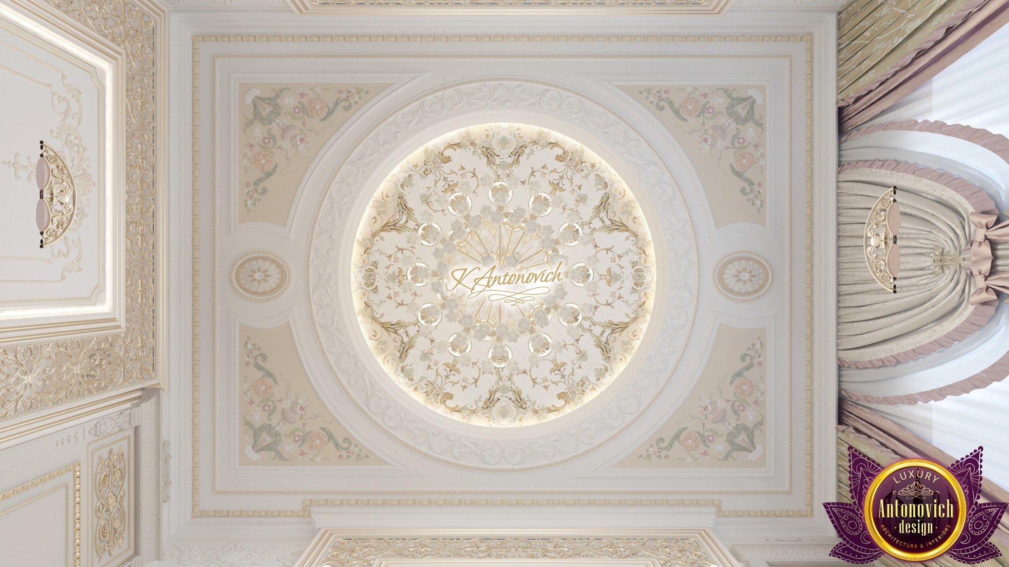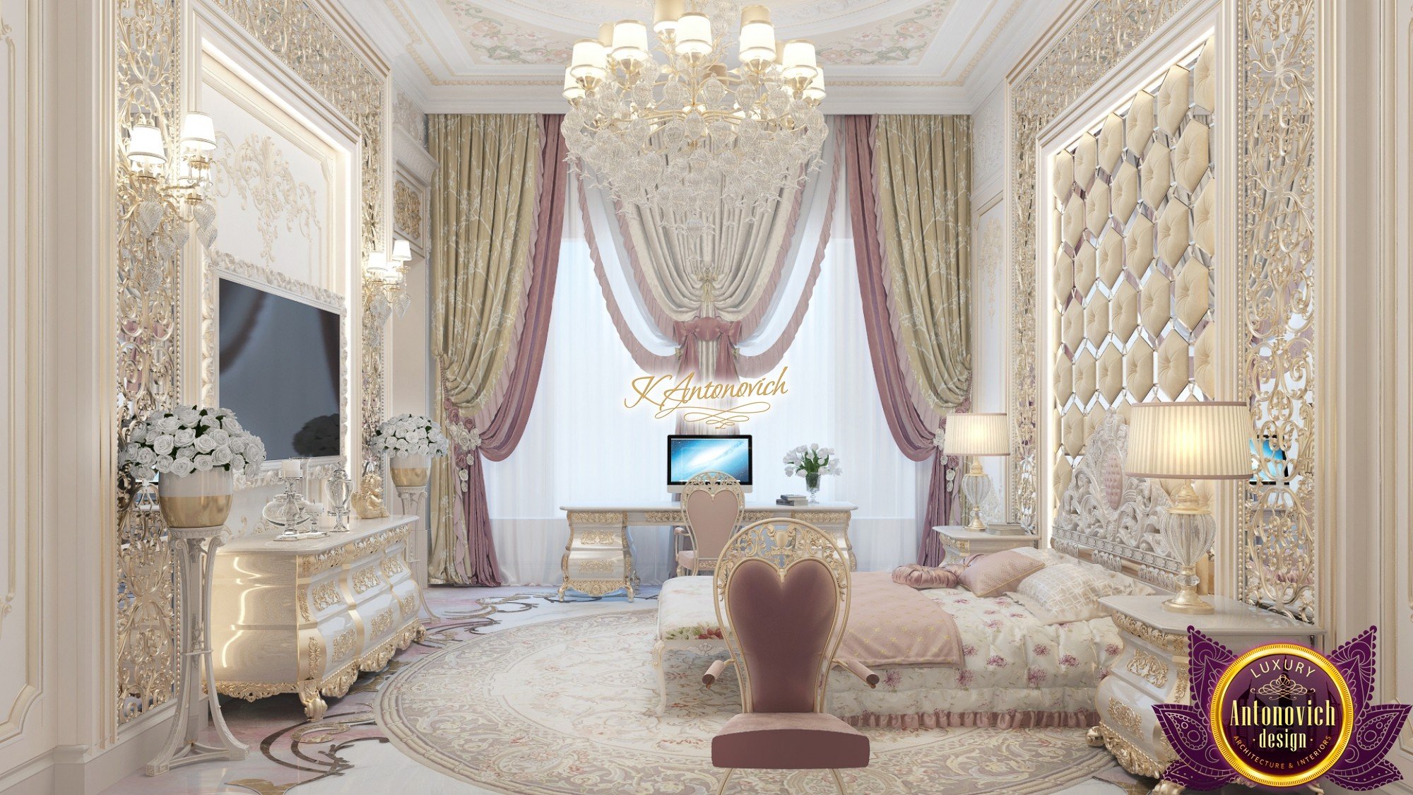 This bedroom interior in a classical style with Art Deco accents just fascinates with its lush beauty and luxurious decoration.Interior designers of design studio Antonovich cleverly combine a classic style with bright moments and rococo art deco touches.The result is an interior of unique beauty. Let us consider in detail the interior of the bedroom. Let's start with the design of the ceiling.It is the ceiling in the bedroom becomes the main point that we are more likely to contemplate in moments of relaxation. Therefore, the decoration of the ceiling in the interiors bedrooms we treat with special attention.In this project, the ceiling decorated with traditional stucco in the best traditions of classical style and elegant art painting.The elements of gilding and magnificent crystal chandelier complete the beautiful picture of the ceiling design.And, of course, the main decoration of the bedroom has become a beautiful bed with exquisitely carved headboard. To more enhance the luxurious and festive mood, the wall behind the headboard is decorated with decor panel made of genuine leather of cream shade with mirror inserts. Mirror panels with gilded forged patterns framed it.Forging ornament, interior designers repeat in the stucco decoration on the walls. The furniture in the bedroom of ivory inlaid with carved decor handmade gilding. Large windows decorated with charming curtains of silk with beautiful ruffles and soft grabs in the form of bows. The floor made of natural marble with beautiful swirls of carved patterns and luxurious Persian rug continues the splendor and beauty of the interior of the bedroom.