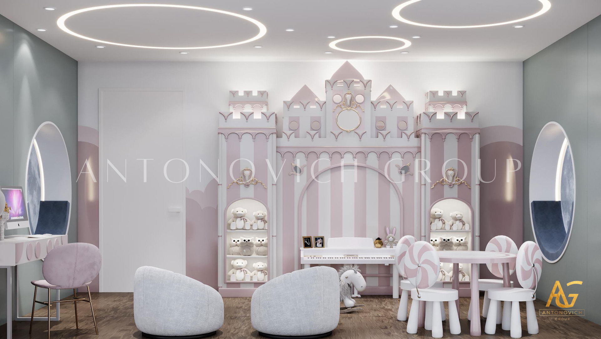 Bright and stylish children's room interior was designed by the studio Luxury Antonovich Design for the daughter of apartment owners in Dubai. The interior is a subject to dreams and desires of the room owner. A bright and stylish image reflects her bright and stylish character. Interior Designers Dubai perfectly organized space, filling it with tenderness and warmth. Each square meter of interior is an elegant piece of the luxury image of the interior. Charming composition is a luxurious bed, wall decor behind the headboard and an armchair. The wall is decorated with a soft textile panel of light beige color with a shallow sink marks. An elegant panel is complemented by line of soft lighting. Against this background, elegant armchair upholstered in noble velvet of purple hue looks charmingly. High soft headboard is a bit lighter than a wallboard. It is completed by fragment of handwork carved decoration. The decoration of the bed is in perfect harmony with the window design. The bed is decorated with quilted silk cover of lilac hue. From the same fabric luxurious curtains are made. A large wardrobe with sliding glass system and charming ornaments exquisitely blended into the interior. Children's room interior design for a girl is filled with a sense of warmth and tenderness. The main emphasis on the softness and warmth becomes fluffy round carpet with a high pile and a floor made of natural wood of valuable species.
