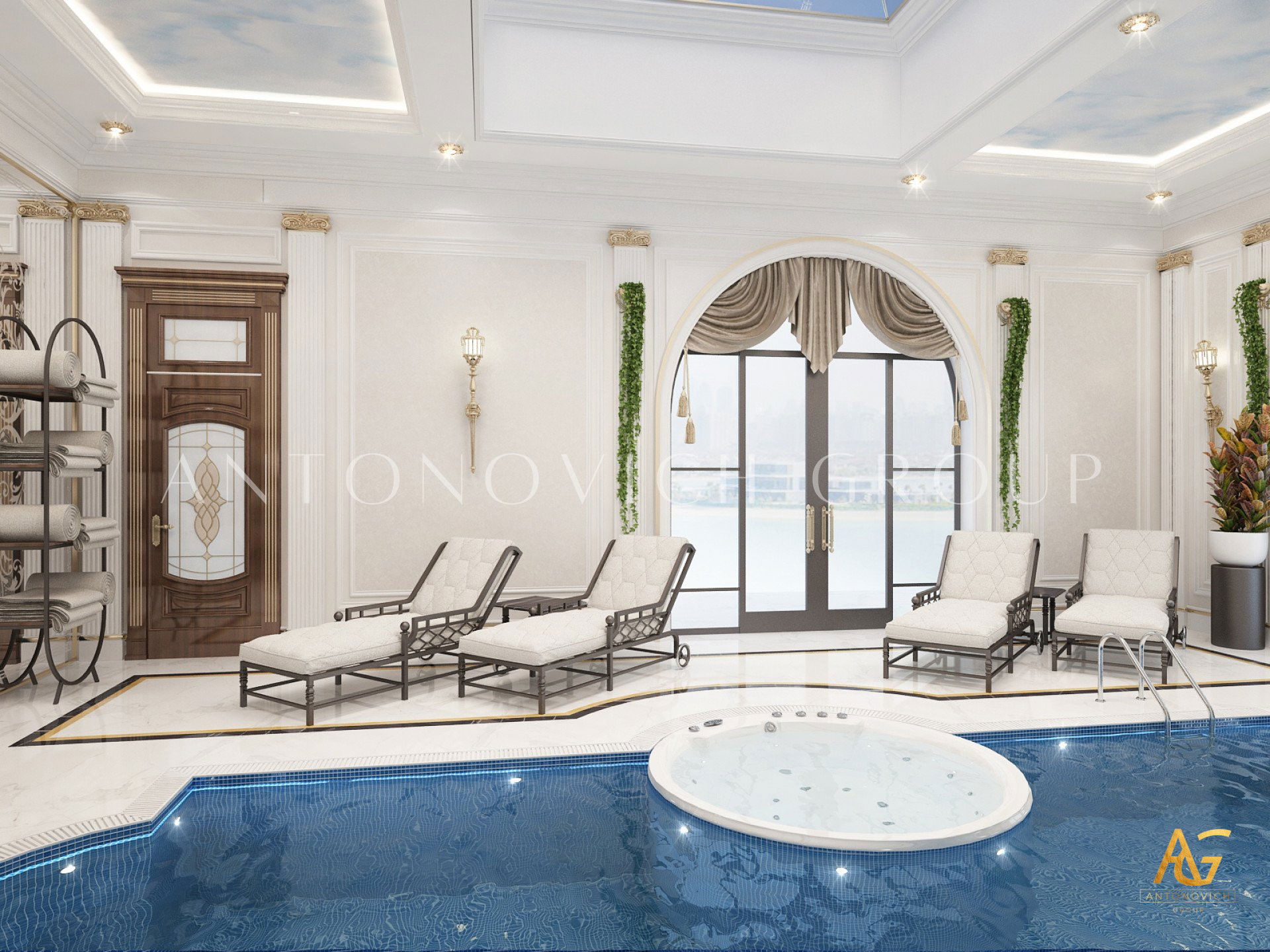 The home swimming pool is where youll feel the most relaxed. The elegant furniture motif is at the heart of the elegance of this luxury interior design by Luxury Antonovich Design. Amazing colors and high-quality materials complete the appeal of the luxury interior design. This luxury swimming pool interior design by Luxury Antonovich Design is one of a kind, with stunning designs and modern contemporary style. A swimming pool that saves space and allows you to enjoy swimming.