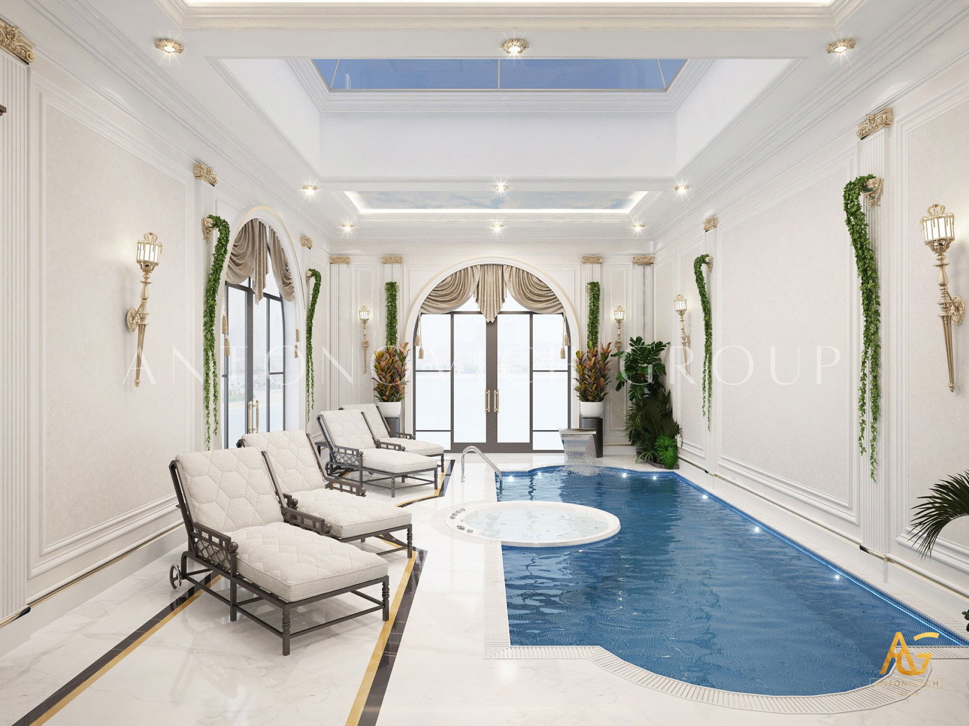 Elegant and classy in every way. A swimming pool made of luxury details from all corners of the room. This luxurious swimming pool interior design features exceptional furniture to ensure that the space meets or surpasses expectations. The rooms tones are kept light colors, giving it an appealing modern air. For added space, the magnificent area also contains lovely pool benches and seats. It also has really interesting and elegant lighting. Unique curves and forms are also used in the placement of the swimming pool.