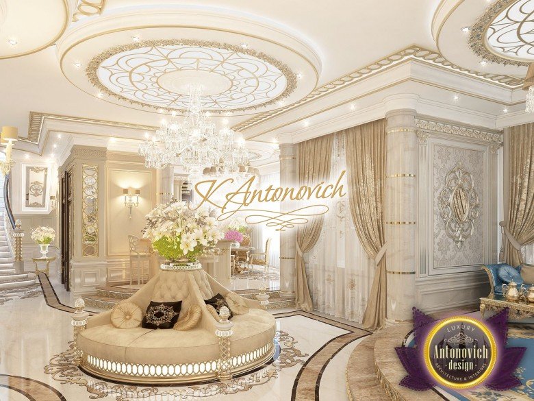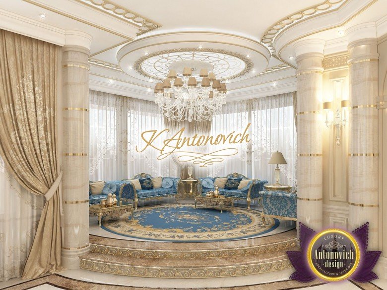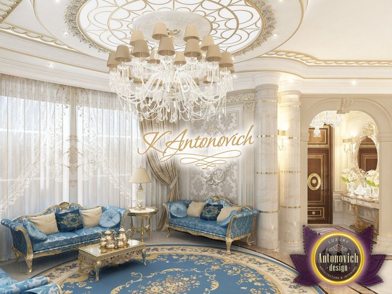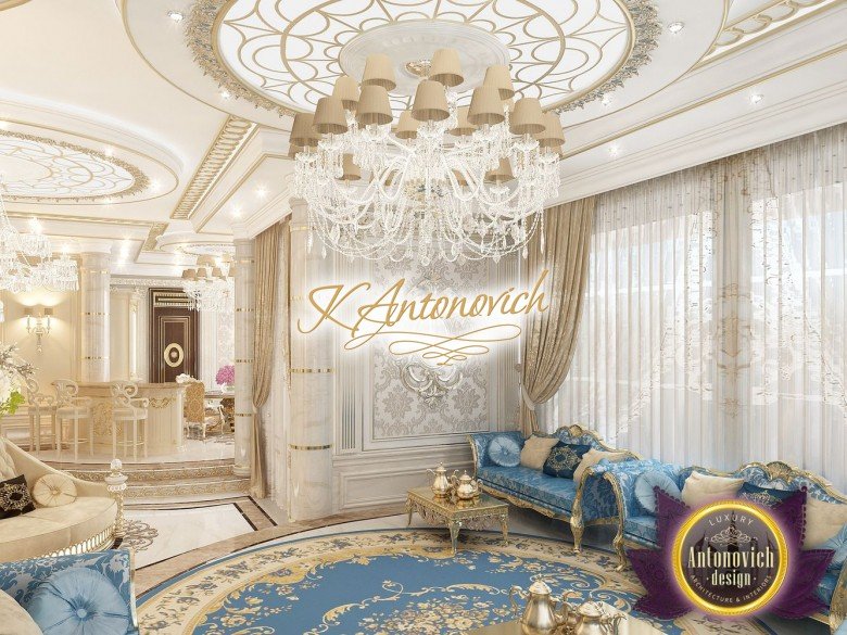 The original solution offered Luxury Antonovich Design studio interior designers for the luxury villa Saudi Arabia. Majlis design has become the highlight of the project, such a required element in the east as in this house. Designers used the architectural features of the house plan to create a unique beauty, charming, and beautiful interior Majlis. Luxurious Majlis placed on the ground floor near large panoramic windows. From the windows offers a beautiful view on landscapes of Landscape Design in Saudi Arabia . So, owners can both demonstrate and their status, and their hospitality and the beauty which interior designers Saudi Arabia have created for them. To harmonize the space, relaxation area placed to the round podium with two steps. Entrance to the interior of the Majlis is framed by two round marble columns.majlis Interior design in Saudi Arabia full of exclusive innovative solutions. So, columns surrounded by a thin gold belt. Ceiling design has become a harmonious continuation of the ceiling decoration motives in the other rooms. Perfectly combines elegant chandeliers and lines with backlight through the gilded forged ornaments.The main decoration of the interior Majlis in Saudi Arabia became furniture.The luxurious sofas and chairs upholstered in blue brocade embroidered with metallic threads. And every piece of furniture inlaid with carved gilded decoration.And to enhance the effect of home warmth and comfort designers offered a charming round rug with oriental ornaments. Here you can comfortably spend time enjoying your holiday.