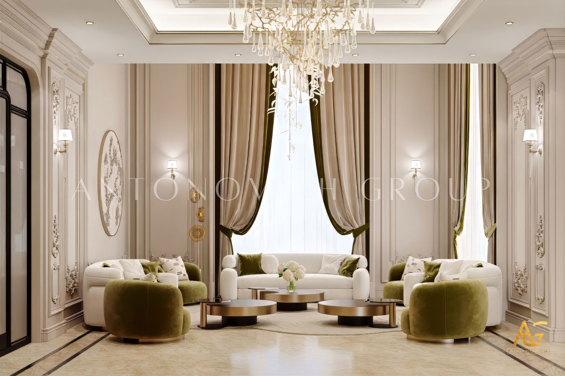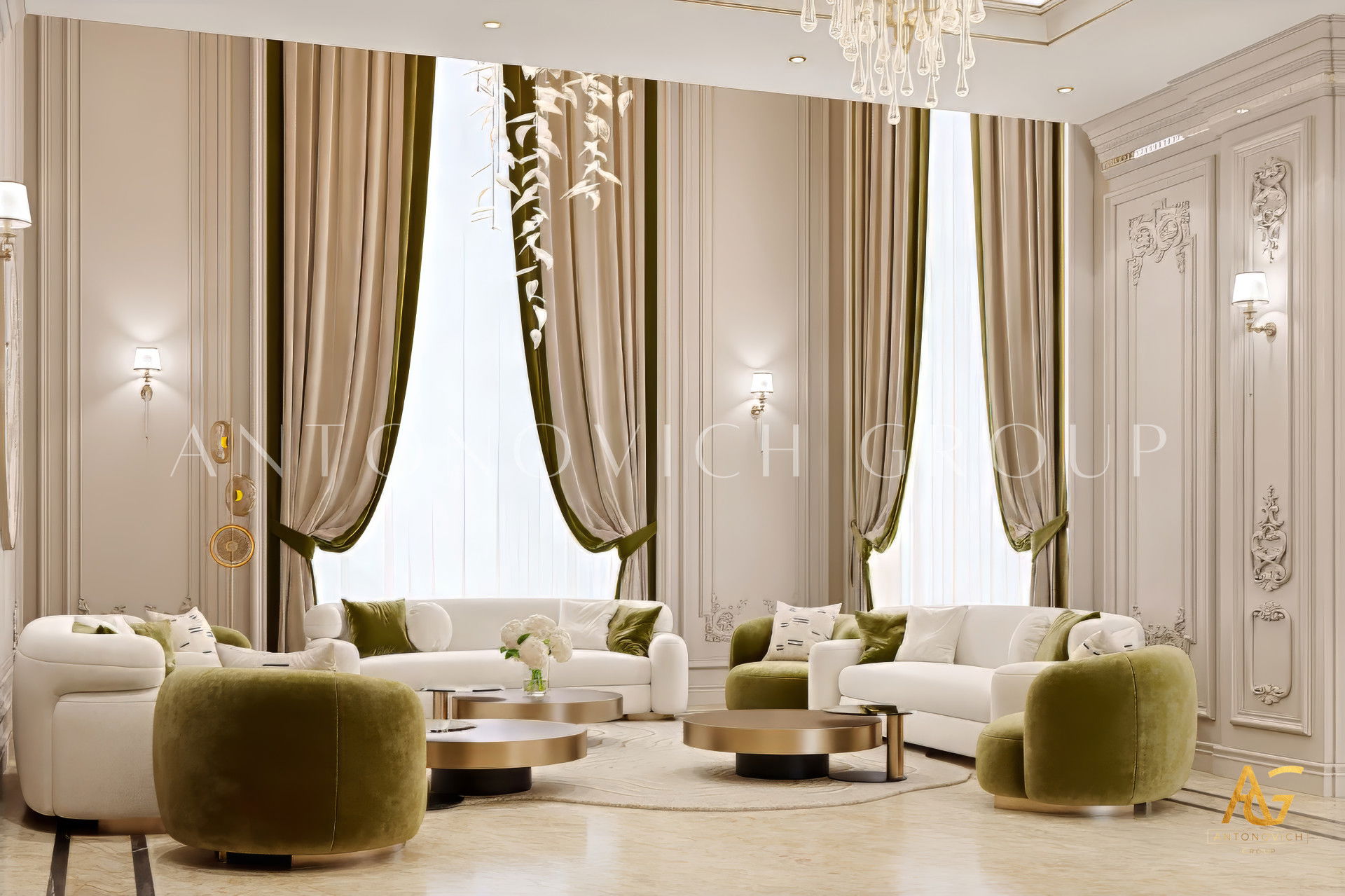 Antonovich Group approaches every Majlis project with an exceptional design philosophy that marries classic grandeur with modern elegance. High ceilings, majestic chandeliers, intricate wall details, and rich materials are harmoniously combined to create a setting that exudes sophistication.
