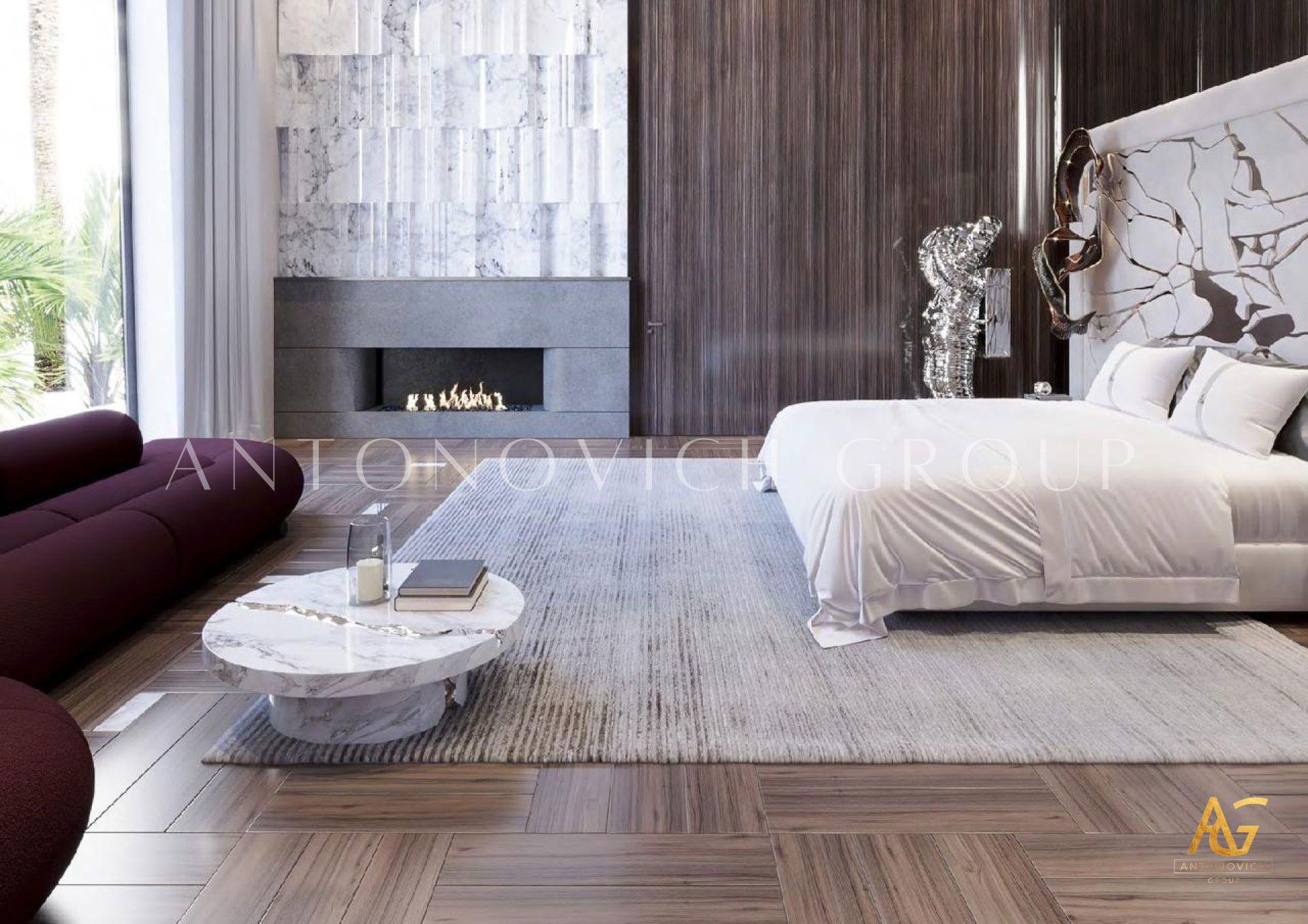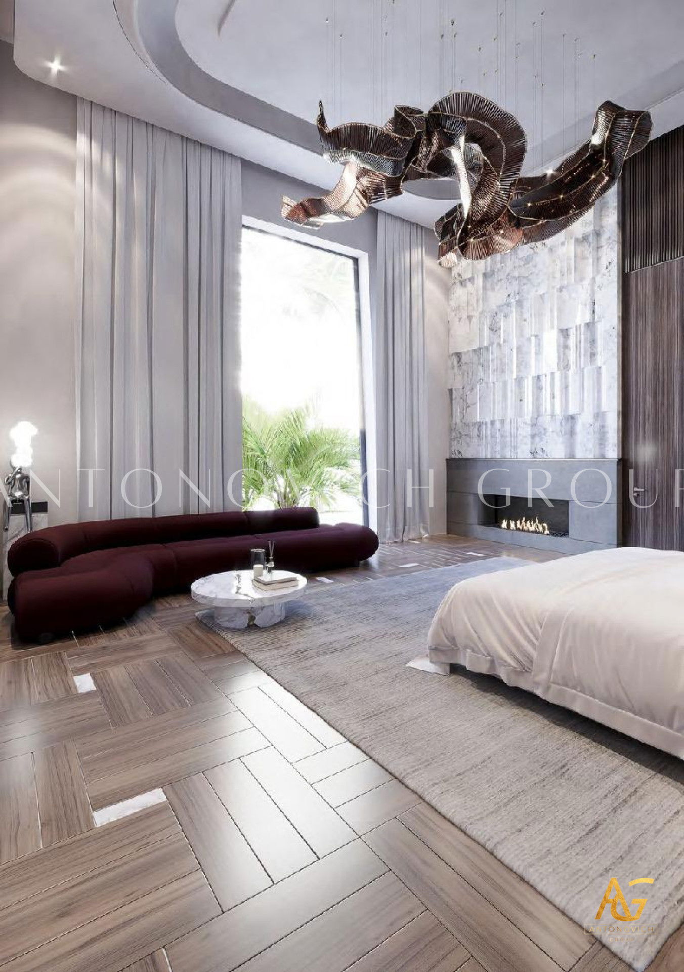 Tenderness, nobility and softness, interior designers presented in this interior as something very cozy and romantic. As always, the bedroom design occupies one of the leading roles in each project of a house or apartment. A place where you can relax and devote time only to yourself. Your rest should be perfect. Everything must obey your dreams and wishes. This approach always presented in the works of creative designers of the Luxury Antonovich Design. In this bedroom design project, textile design played a great role in the formation of a very precise and artistically expressive image. For the window decoration in the bedroom, the author of the project suggested charming curtains of noble silk of a pleasant lilac shade. The designer emphasizes the beauty and refinement of the fabric with the help of a wide strip of bows and folds at the top. Part of the cozy mood was the accent wall behind the headboard of the bed, which is decorated with a soft velvet panel in silver-beige shades. The rest of the walls in the bedroom interior are covered with decorative plaster with the texture of natural velvet. The interior designer masterfully improvises with such a fashionable trend in interior design 2019 as geometric ornaments. The pattern on the silk coverlet is repeated in the wall decoration behind the headboard of the bed. A pleasant feeling of coolness and ease were brought into the bedroom interior the by the flooring of white Italian marble. It gracefully complements a beautiful ceiling, with a modern chandelier and additional accents of lighting.