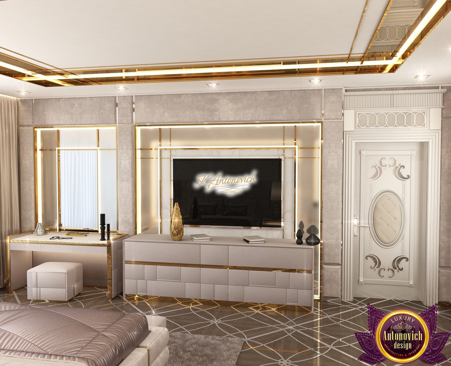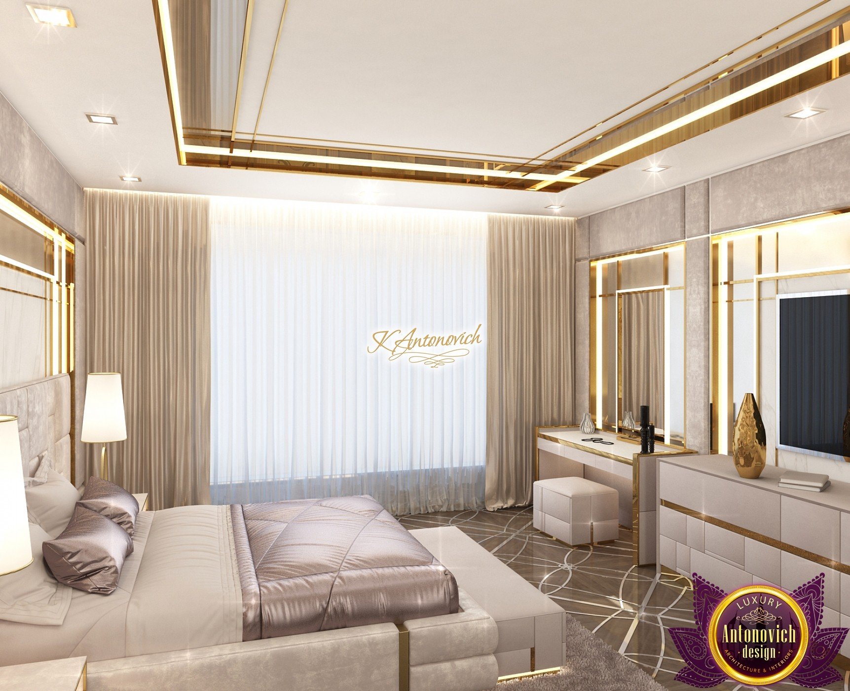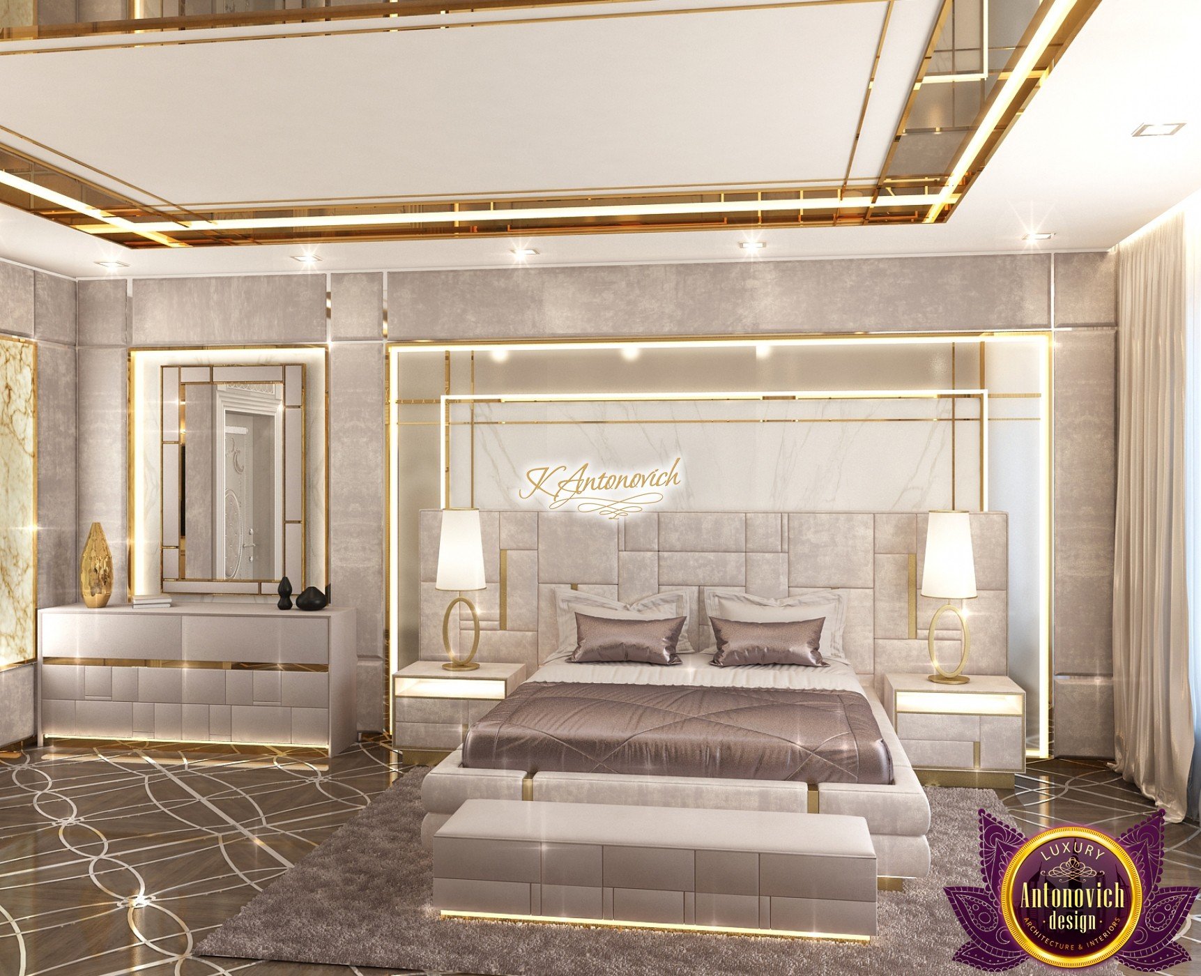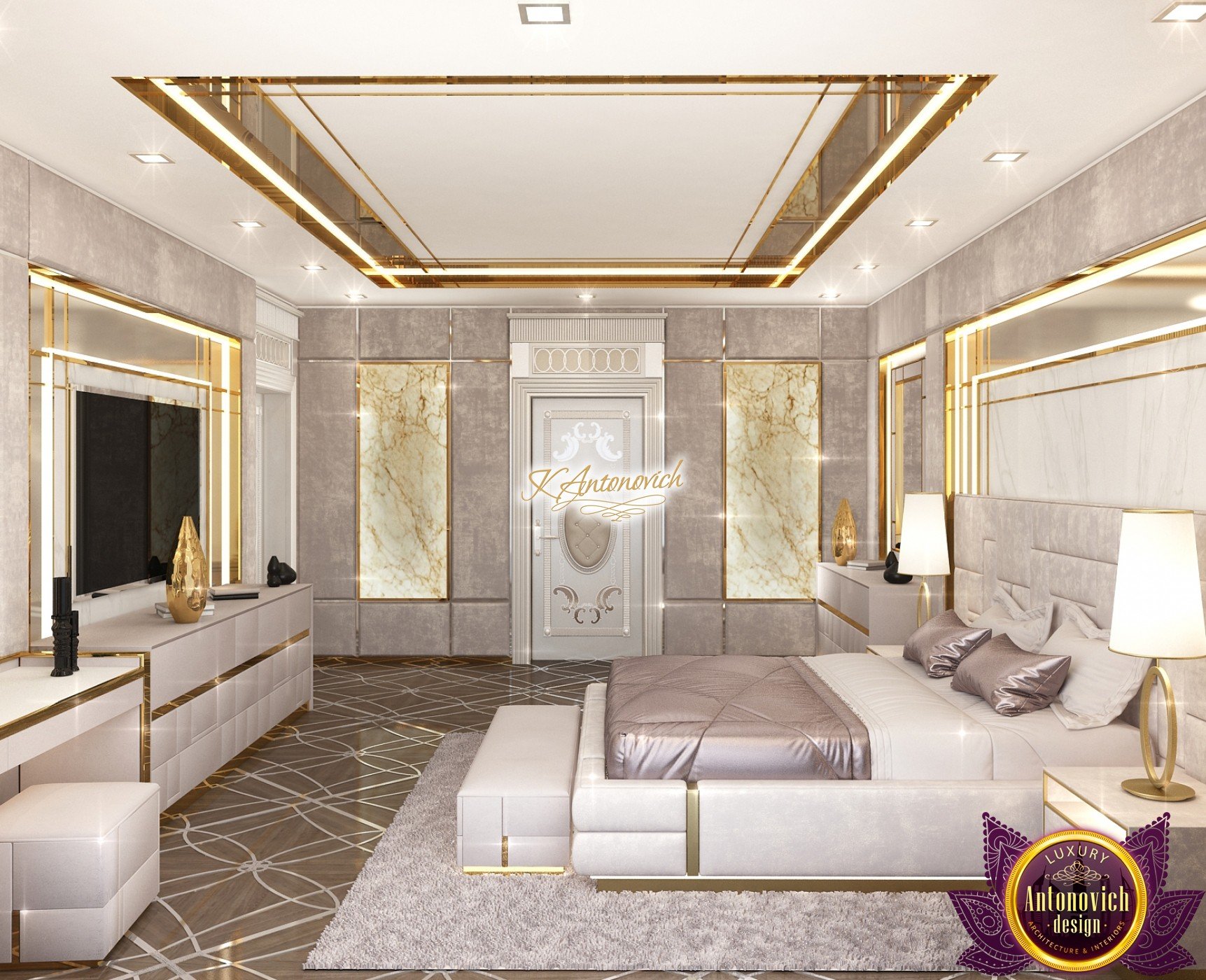 Designers of studio Luxury Antonovich Design created a radiant and filled with the warmth the interior of the bedroom. The perfect geometry of the shapes and lines radiates full harmony. Here there is a great improvisation with shades, textures, and lighting.Very bright and multifaceted wall and ceiling decor fills the interior of the master bedroom with a special artistic expression. The decoration of the walls perfectly combined panels of onyx with backlighting, decorative plaster with the texture of gray natural stone and thin strips of polished stainless steel. Accurate geometry and correct forms continued in the ceiling decor.Large rectangular niche filled with stripes of mirrors around the perimeter and inserts of polished brass.Additional illumination lines and ceiling lights enable correctly identify the main accents of the luxurious interior. And at the same time, the lighting can be adjusted from bright daylight to subdued evening. Motives of the ceiling decor seemed to is mirrored in the design of the wall behind the headboard of the bed and the opposite wall with plasma screen.Niche further is filled with luxury decorative stucco texture of white natural marble.Against this background, looks very nice a large comfortable bed with high upholstered headboard, which is upholstered in velvet of noble muted shades of gray.The floor of Italian marble tiles added ornate notes to the interior of a beautiful bedroom in a contemporary style.To soften the coolness of natural marble in the interior was provided a soft fluffy carpet.