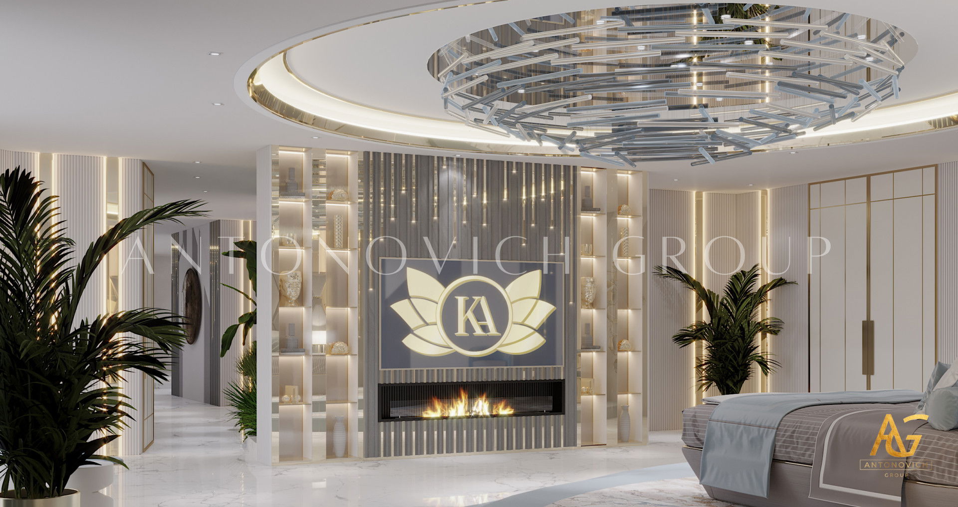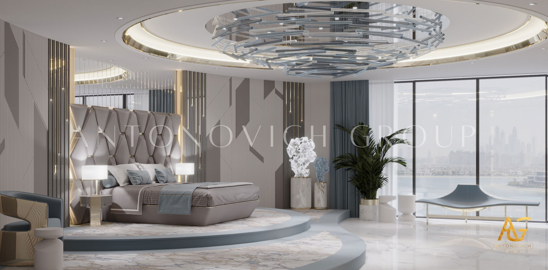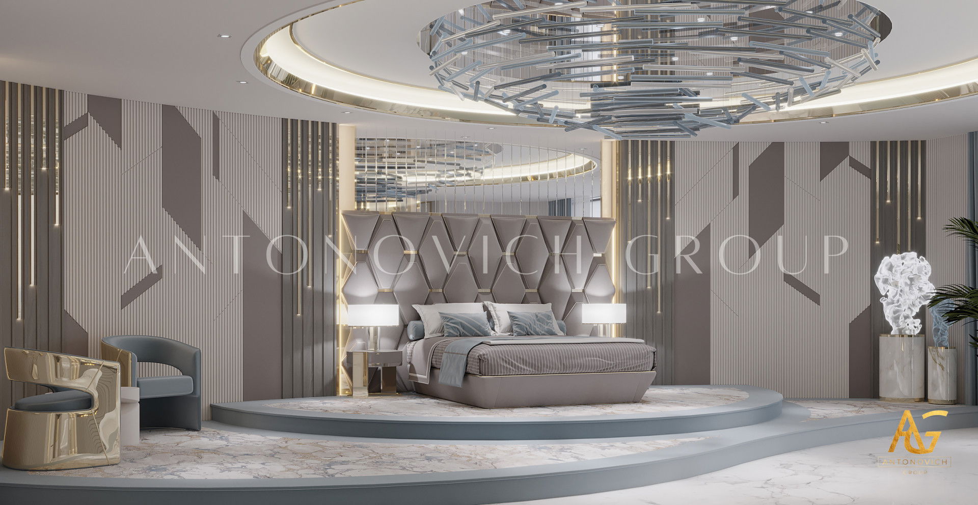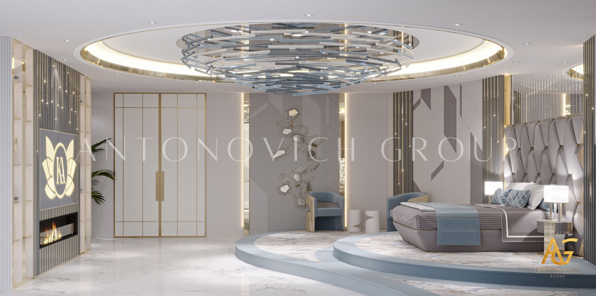 Futuristic, modern, and stylish; are the three main characteristics of this luxury bedroom interior design. The futuristic ambiance of the room can be seen with the huge chandelier that Luxury Antonovich Design has created for this luxury bedroom interior design. The huge and rounded design is such an eye-catching creation that signifies beauty and creativity.