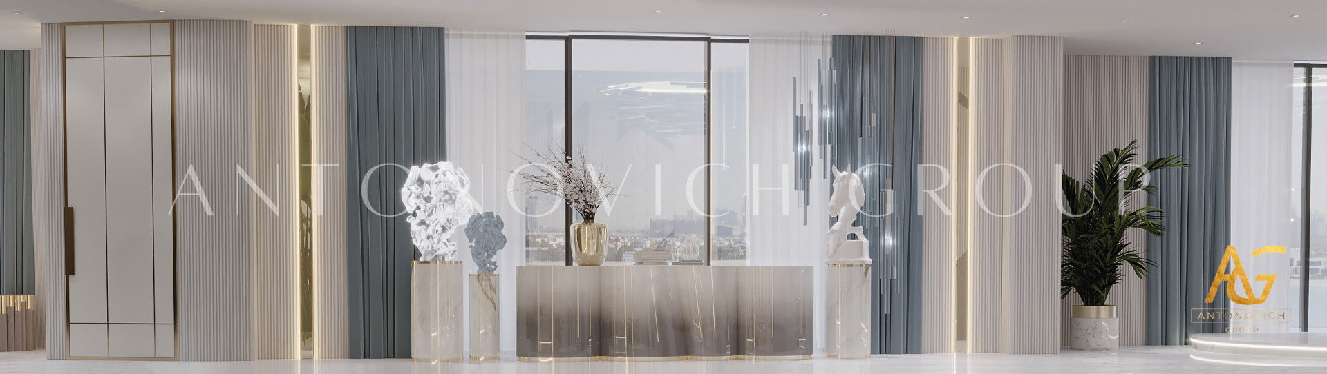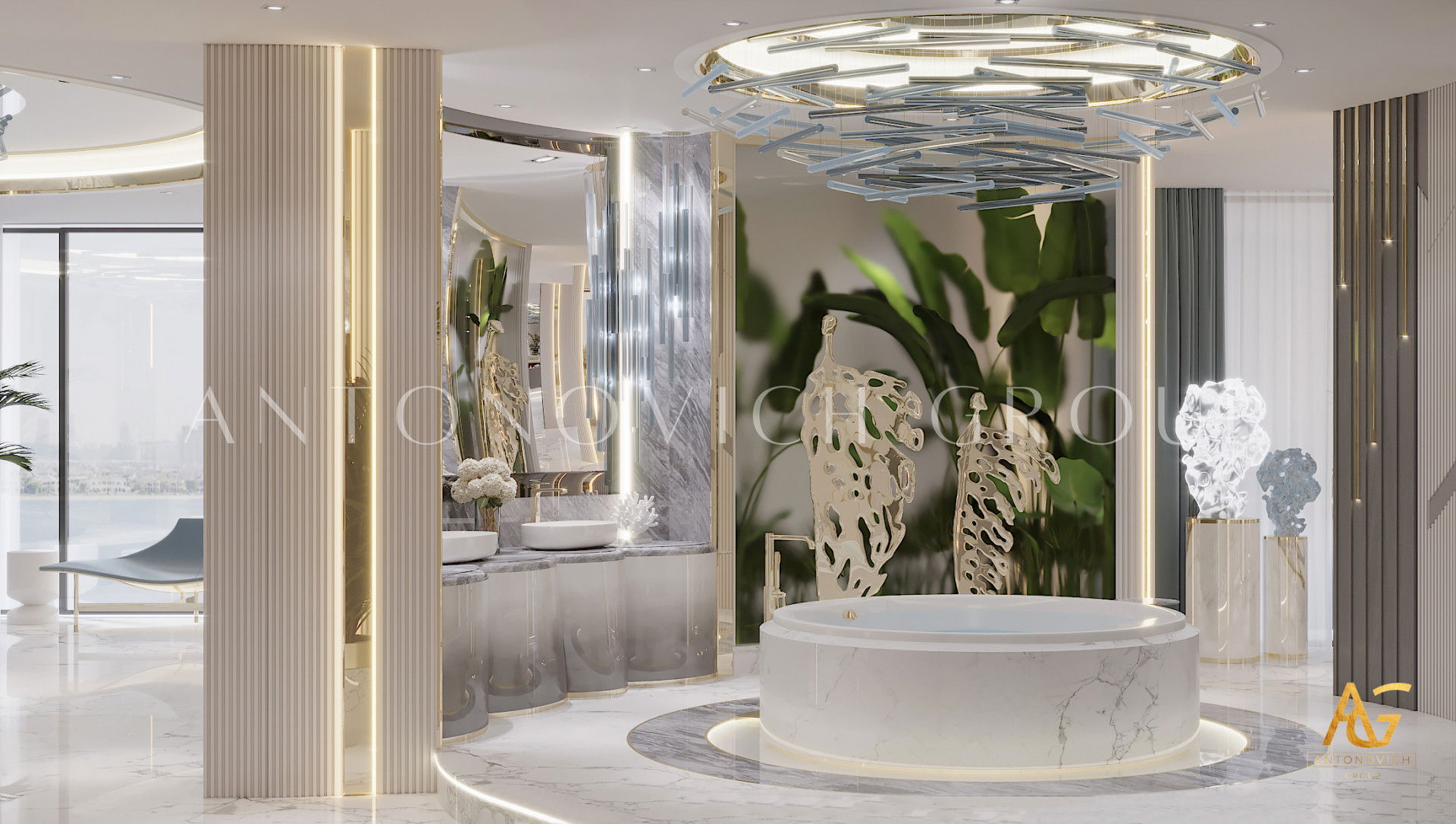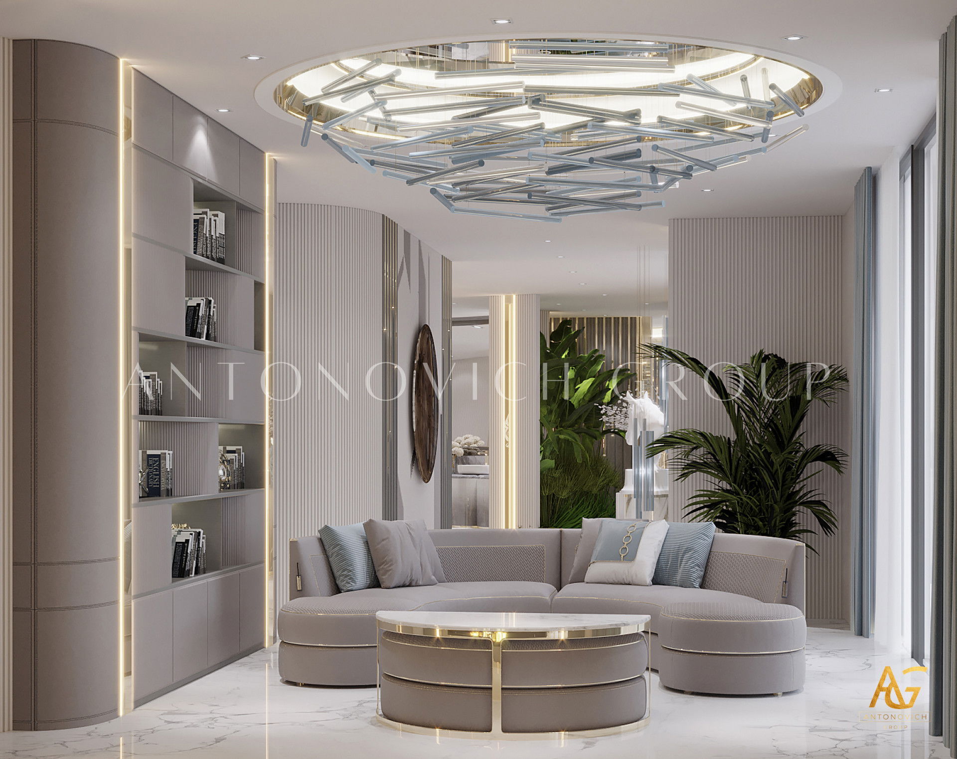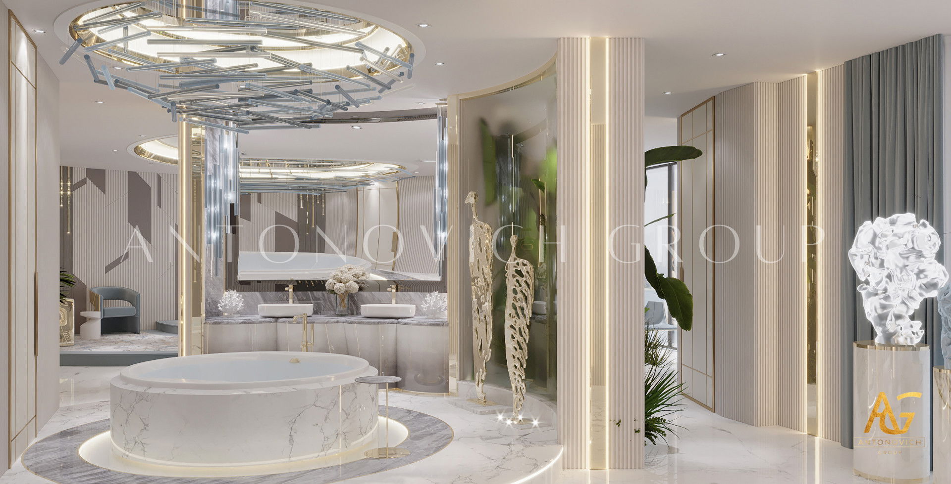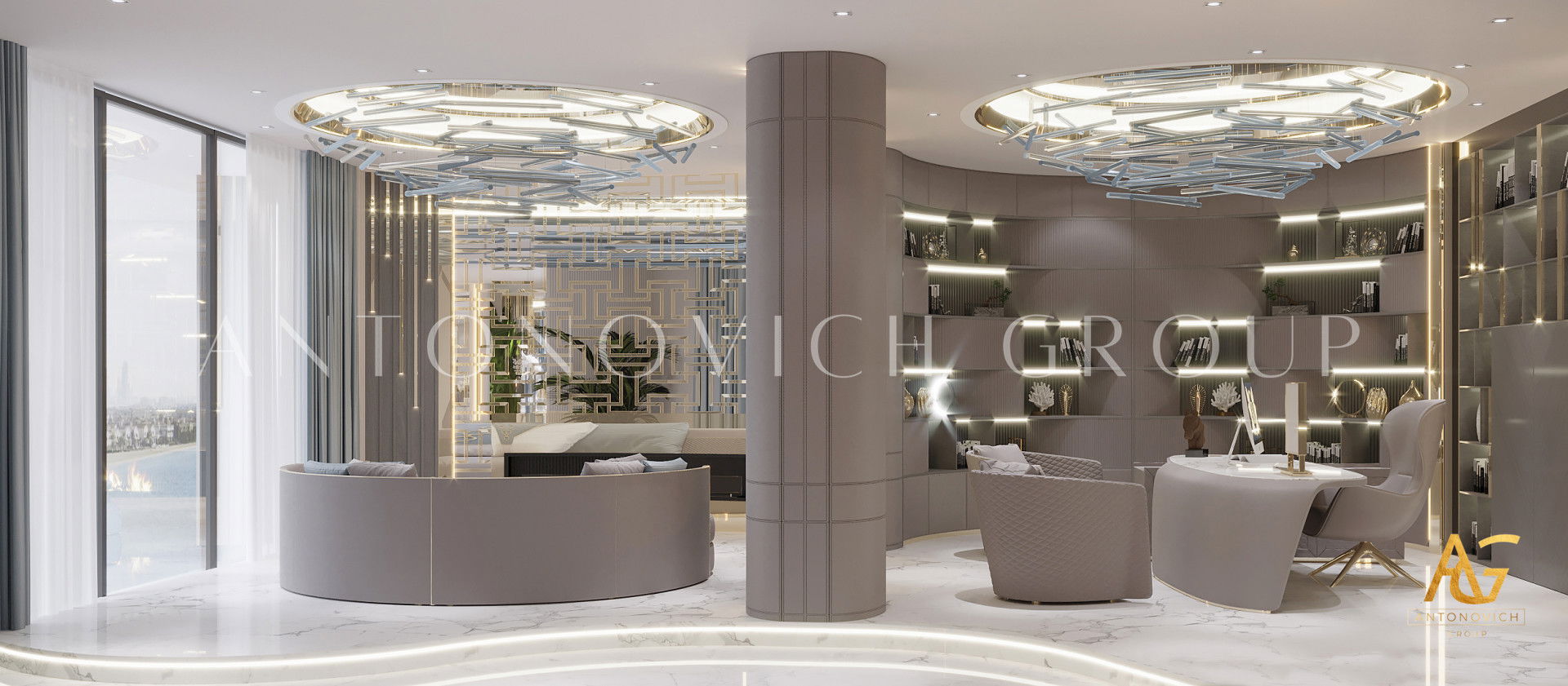 Futuristic, modern, and stylish; are the three main characteristics of this luxury bedroom interior design. The futuristic ambiance of the room can be seen with the huge chandelier that Luxury Antonovich Design has created for this luxury bedroom interior design. The huge and rounded design is such an eye-catching creation that signifies beauty and creativity.