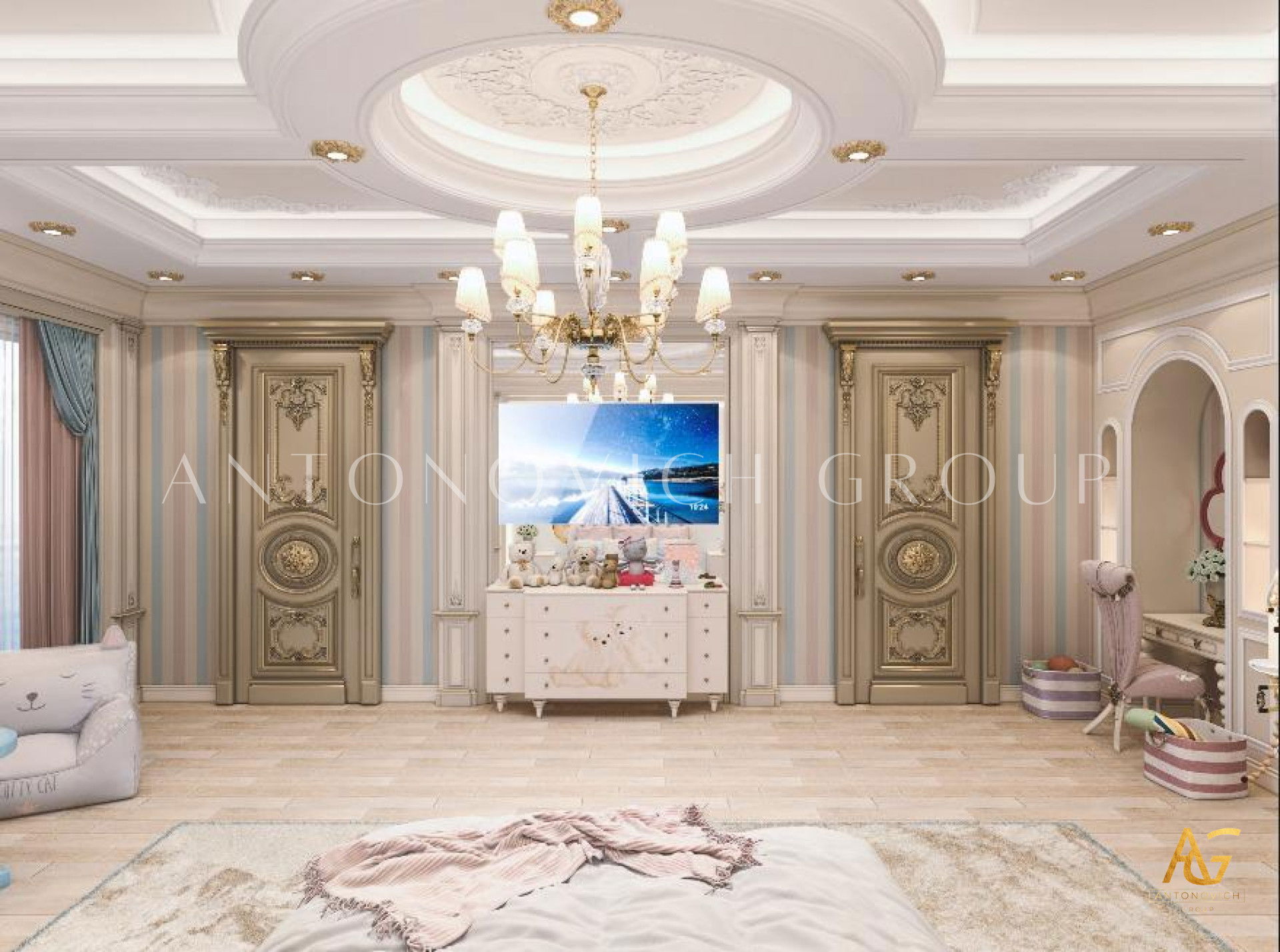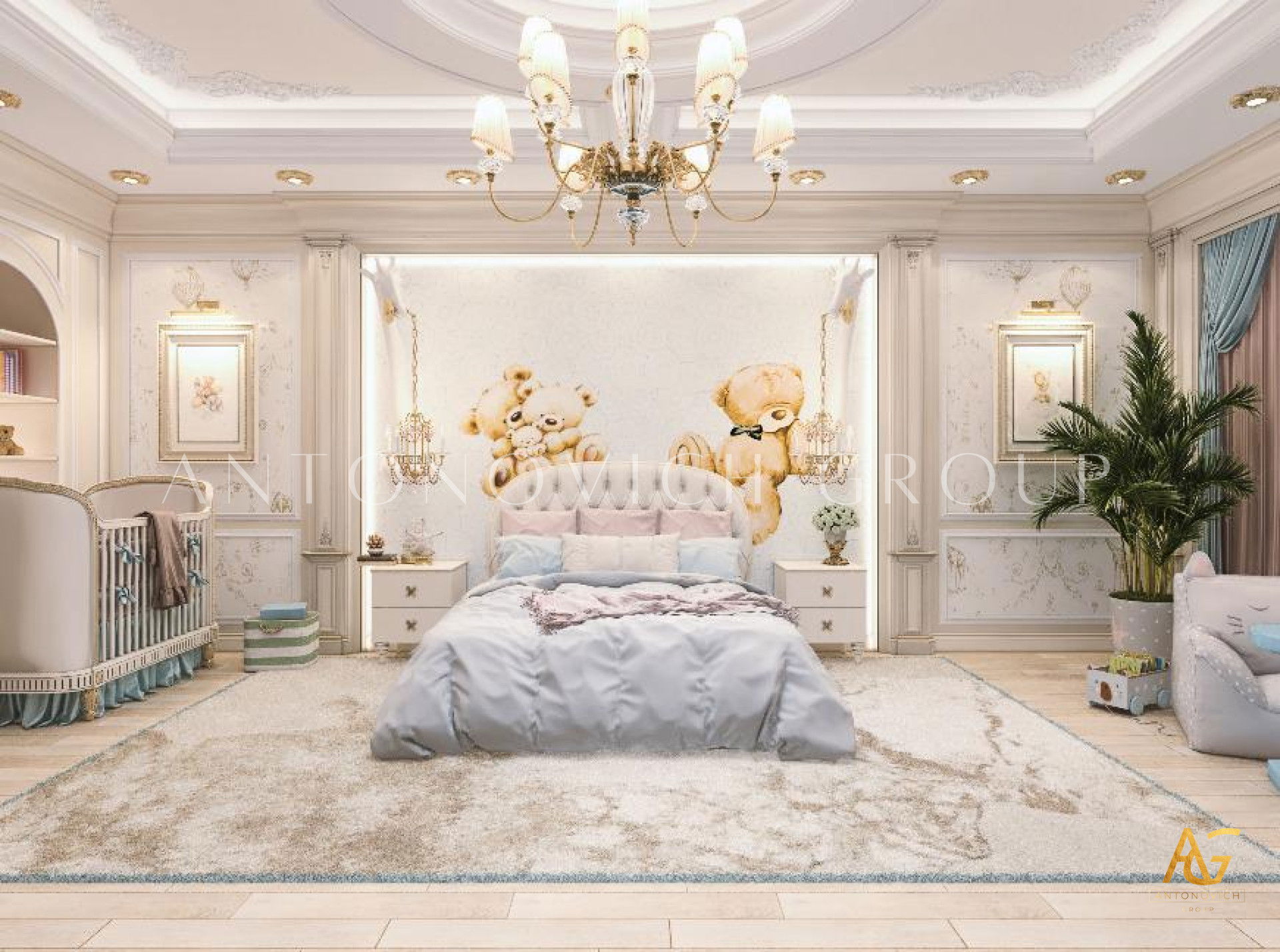 House project in Dubai reflects the dreams and needs of each family member. Apart from a few children's rooms interior designers offered in the attic a separate playroom for children of home owners and their friends. Children's room interior design is the creation of a luxury space in accordance with the child's psychology. Each child is unique as each architectural project is. Dubai Interior designers create interiors that bring up a child's sense of beauty and good taste. Children's room design in the attic of the villa wonderfully reflects the cherished child's dreams of his room, where you can rest and play games or watch movies. Villa Design Dubai is in the classical style, but for the children's room interior project authors proposed a completely different version from other apartment in a contemporary style. Children's room design features are perfectly underlined in the attic room. The arches of the ceiling are decorated with stucco of silk texture, which shimmers with delicate pearly luster. Window curtains are decorated with concise pale blue hue. The basis of the interior lighting became ceiling lights, which are evenly placed around the perimeter of the ceiling. Wall decor has become a highlight of the interior. Glossy panel is supplemented with LED backlight, and one of the walls is adorned with great artistic panels with fabulous scenery. The ergonomic and stylish furniture perfectly blended in the cozy interior of the children's room. Special joy is brought to children's room with a fairytale castle and library area with a decorative starry sky on the ceiling.