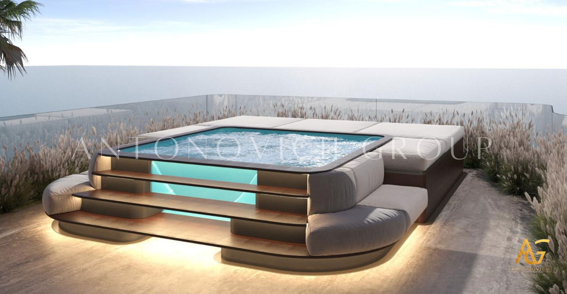 • Luxury outdoor jacuzzi integrated into a sculptural seating area with ocean views