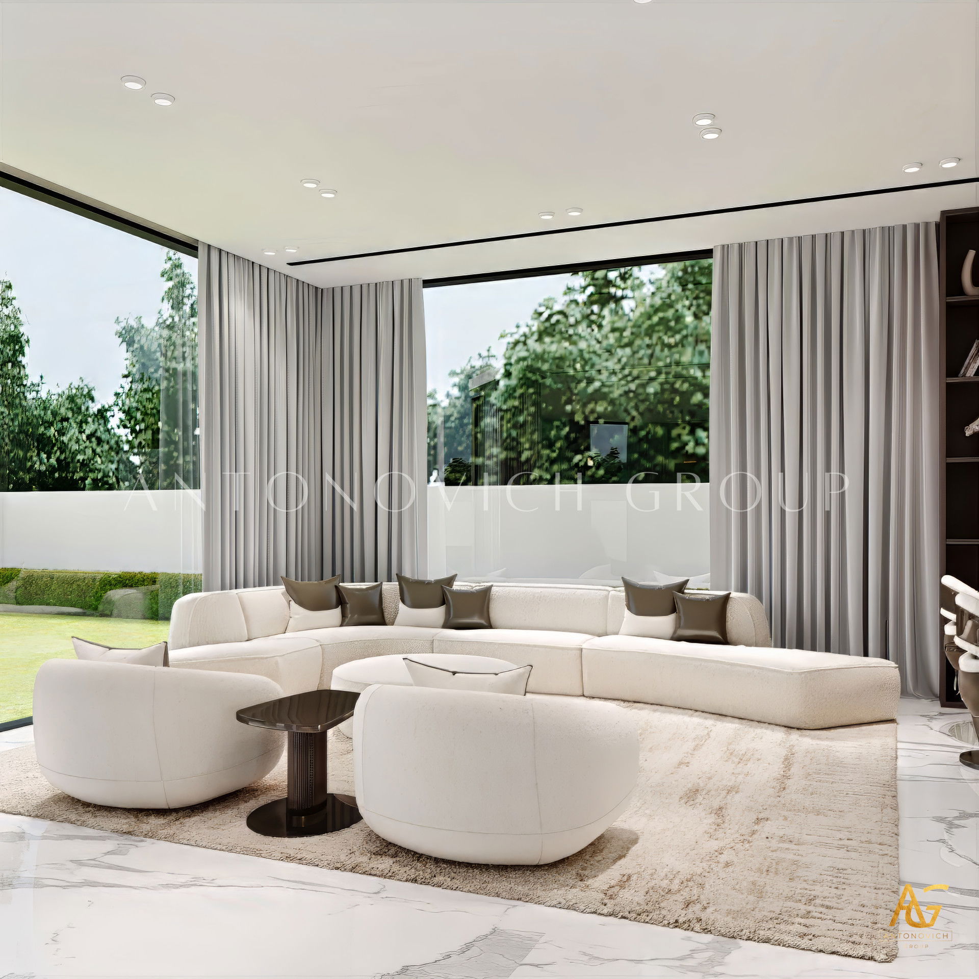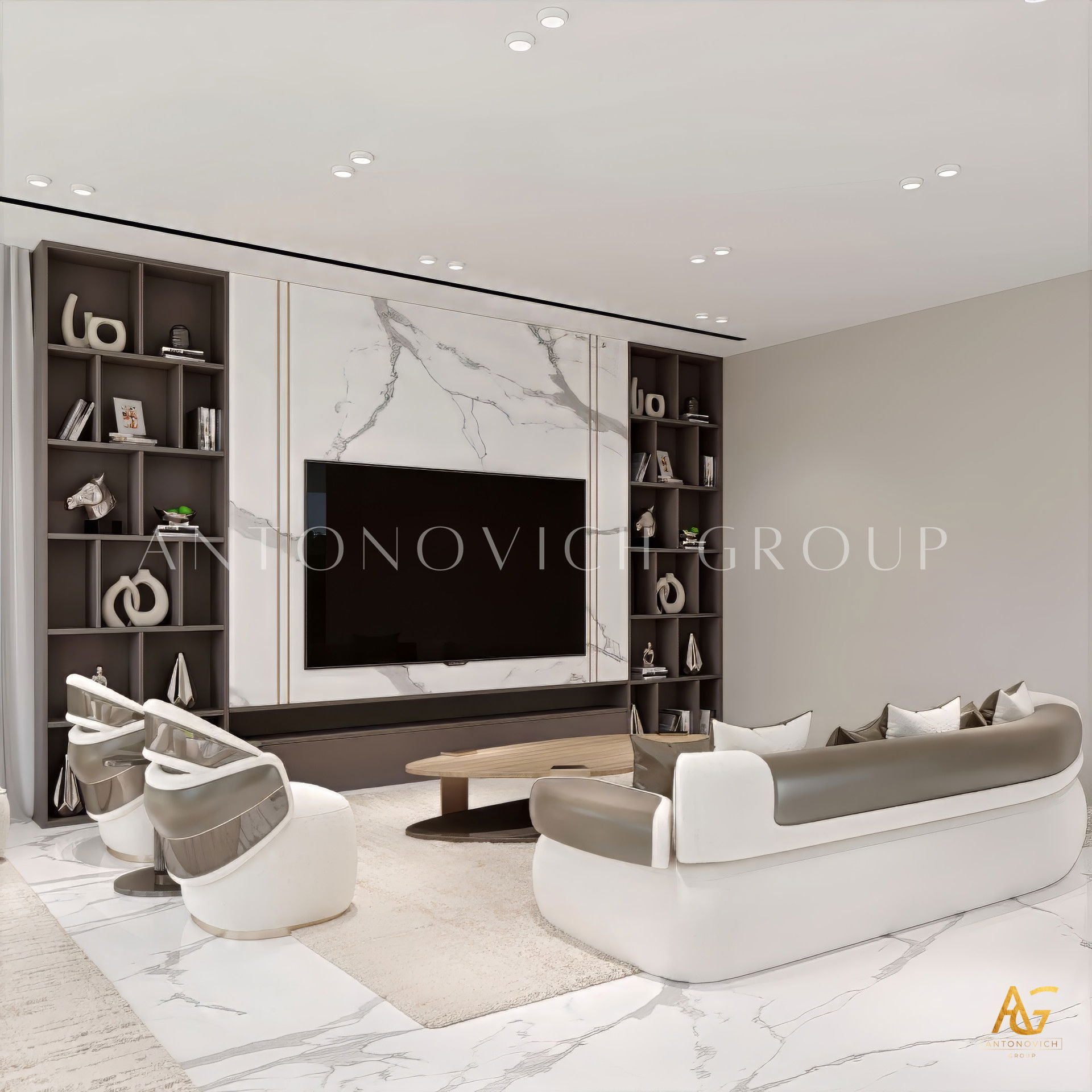 One of Antonovich Group’s hallmarks is its expertise in space planning solutions. For living rooms, this means creating a seamless flow between seating areas, entertainment zones, and access to outdoor or adjoining spaces.