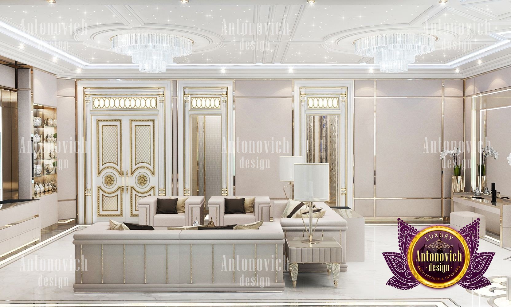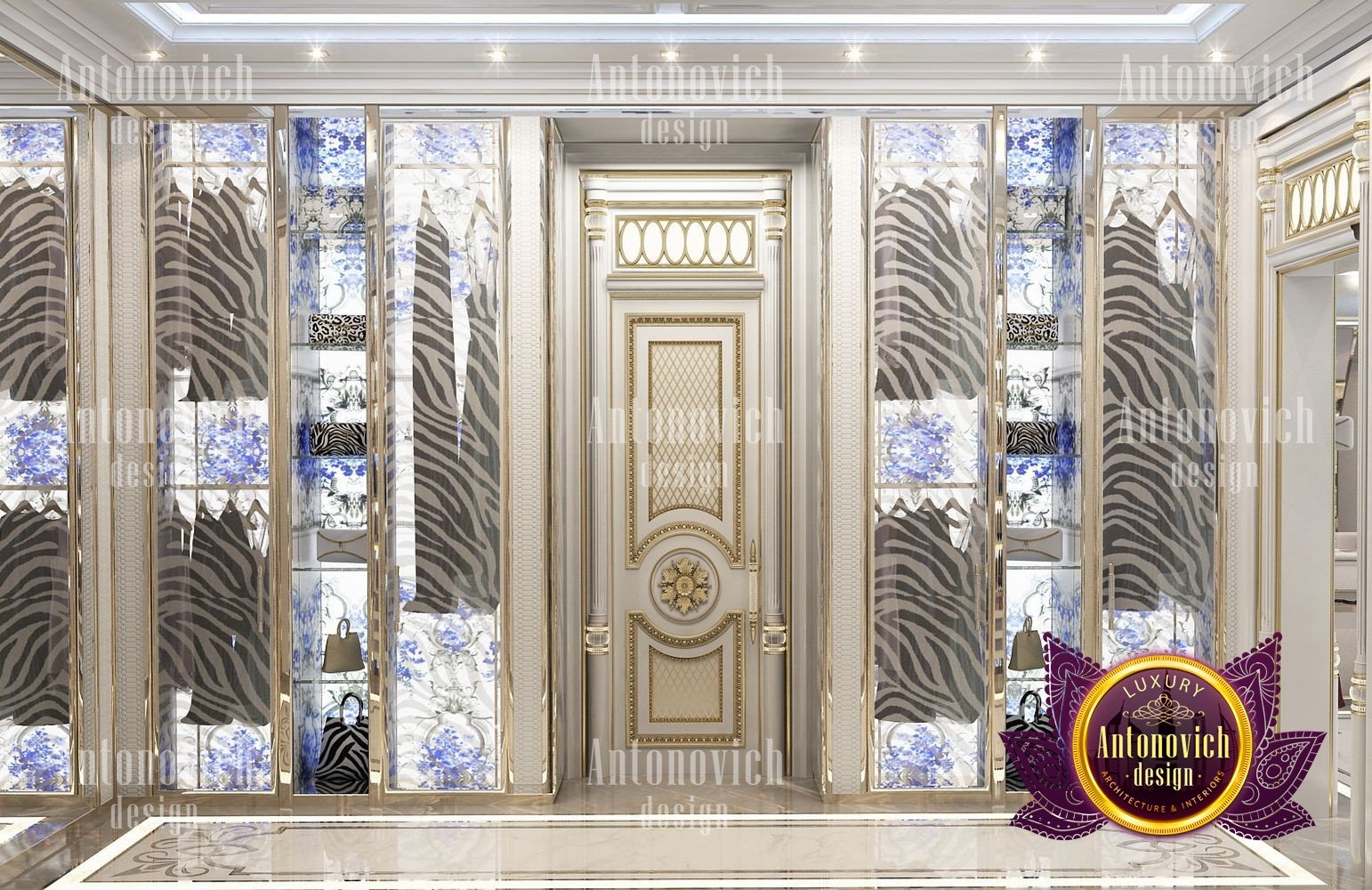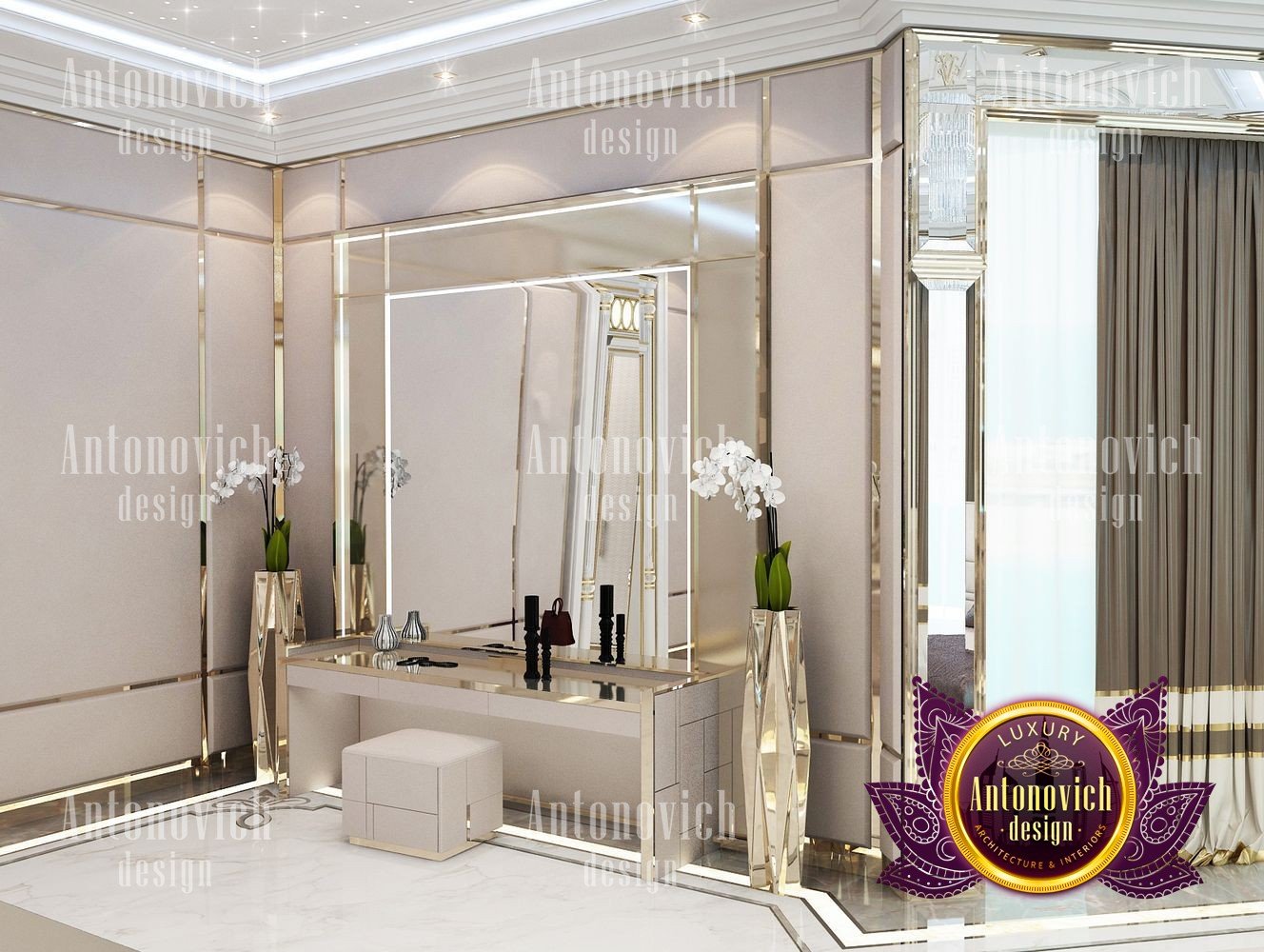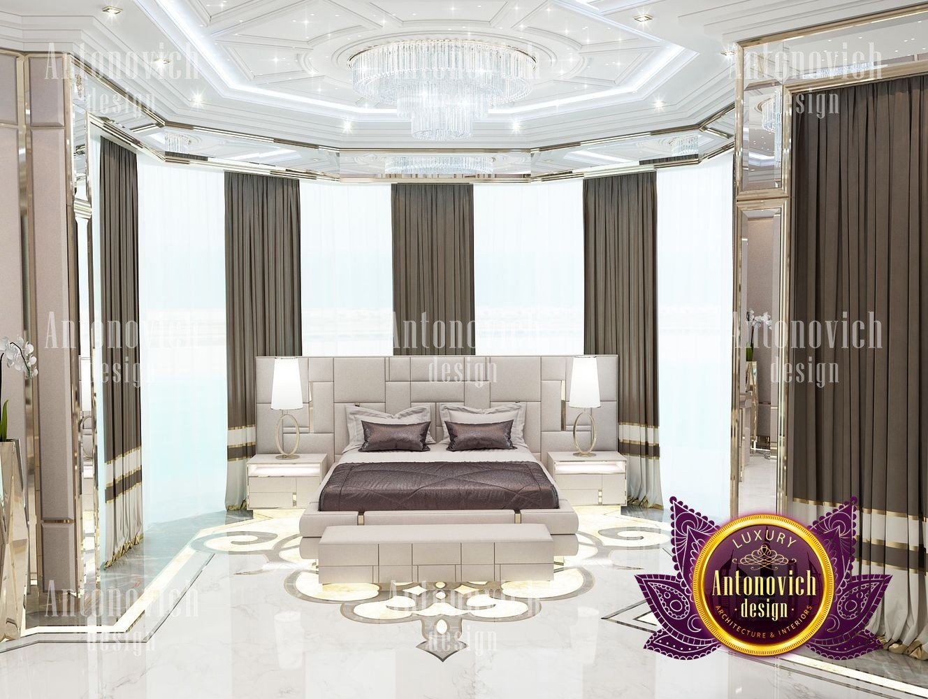 The flight of a designers fantasy depends on many factors. It is the inspiration, first of all, from communication with customers and penetration into their dreams. But even such a moment as a large area for the project of the interior of the bedroom can add many new moments in creating unique design ideas. The main bedroom in the big house became a luxurious masterpiece in the Art Nouveau style. The main zone is located near a large semicircular panoramic window. Beautiful curtains made of silk chocolate shade evenly distributed with vertical folds around the perimeter of the window. The elegant ceiling was decorated with a polygonal suspension with a lot of lamps and lines of mirror stripes all around the perimeter. The design of the ceiling becomes the most important point in the interior of the bedroom. In such space, in the morning and evening lying in bed, you can admire such bright and elegant details. The large headboard is upholstered in natural leather with a texture in geometric ornament. This extravaganza of bright and festive notes is complemented by the floor design made of natural marble and onyx elements with illumination. Continued the interior by a small living room with stylish furniture in a modern style. A lot of showcases with open shelves and lighting. The ceiling is also strewn with small LED lamps, which gives the bedroom interior a very romantic mood. In the decor of the walls, the matte plaster is decorated with thin strips of polished brass, which mirror the shimmering under the light of the chandelier and lamps. The interior design of the bedroom reflects the future fashion trends in the design of interiors.