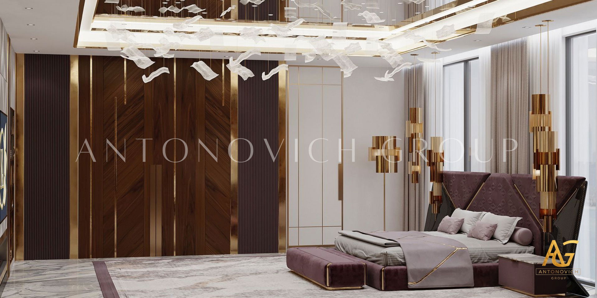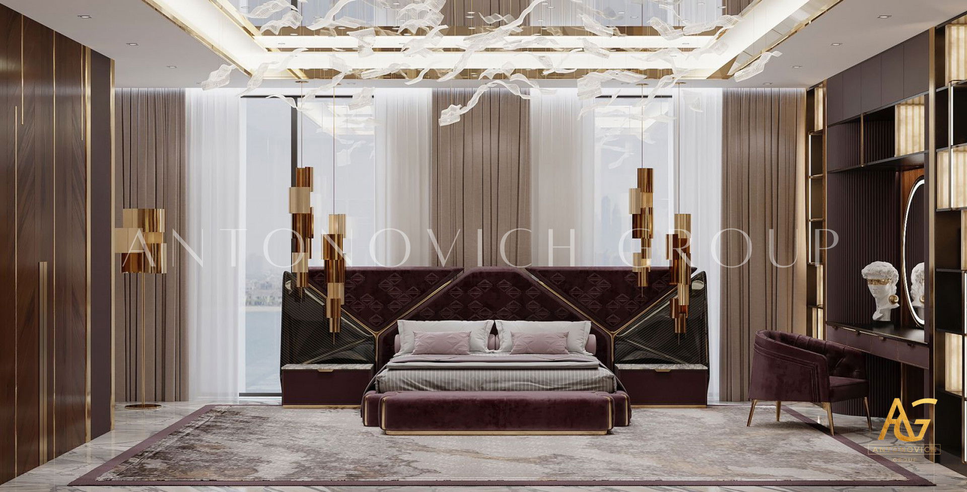 A dark brown bedroom can be the ideal setting for a restful nights sleep. Deep brown, deep gold, chocolate browns, and bold black tones are all excellent choices for a bedroom decor plan in this luxury Dubai bedroom interior design. If the rest of your home is decorated in bright colors or soft neutrals, entering a bedroom with a dark color scheme might be relaxing. We have created this luxury Dubai bedroom interior design as one of our favorite dark, high-design bedrooms to serve as inspiration for you. Prepare to embrace your dark and luxury side. A rich brown hue provides a refined, sensual touch to this bedroom by Luxury Antonovich Design. We designed the decor, the headboard is upholstered in its best luxury form, the seat is a top style, and the mirrors are 17th and 18th century inspired. The furniture and decor complete the appearance. The main bedroom was designed with rich colors and layers of texture. The luxury Dubai bedroom interior design also uses additional dark tones and textures in this bedroom design plan.