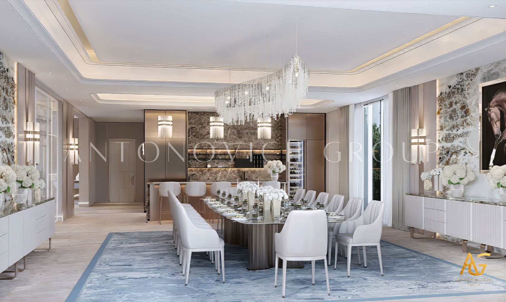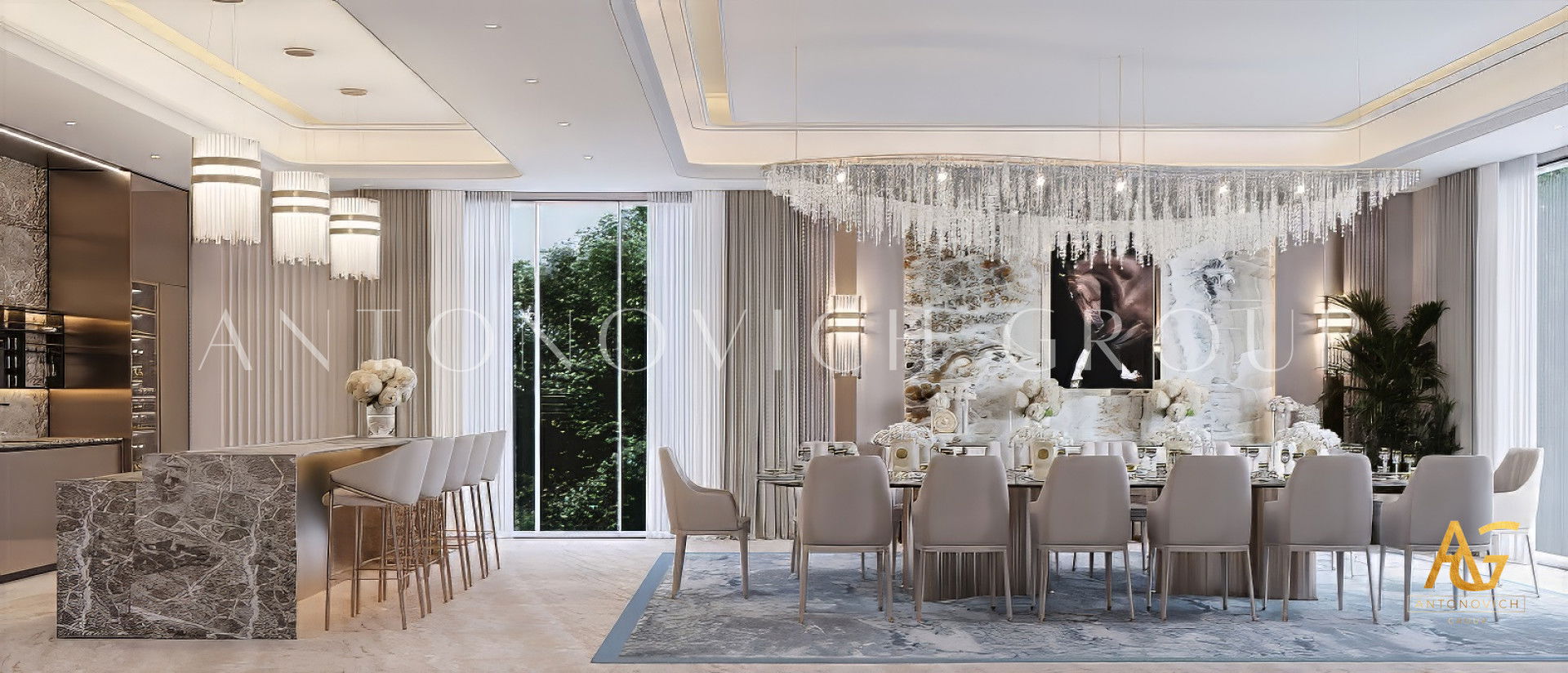 A luxury dining room designed by Antonovich Group is more than just a functional space — it’s a masterpiece that embodies style, atmosphere, and individuality. Every detail, from architecture to accessories, is carefully curated to reflect the client’s taste and lifestyle while meeting the highest standards of design and execution.