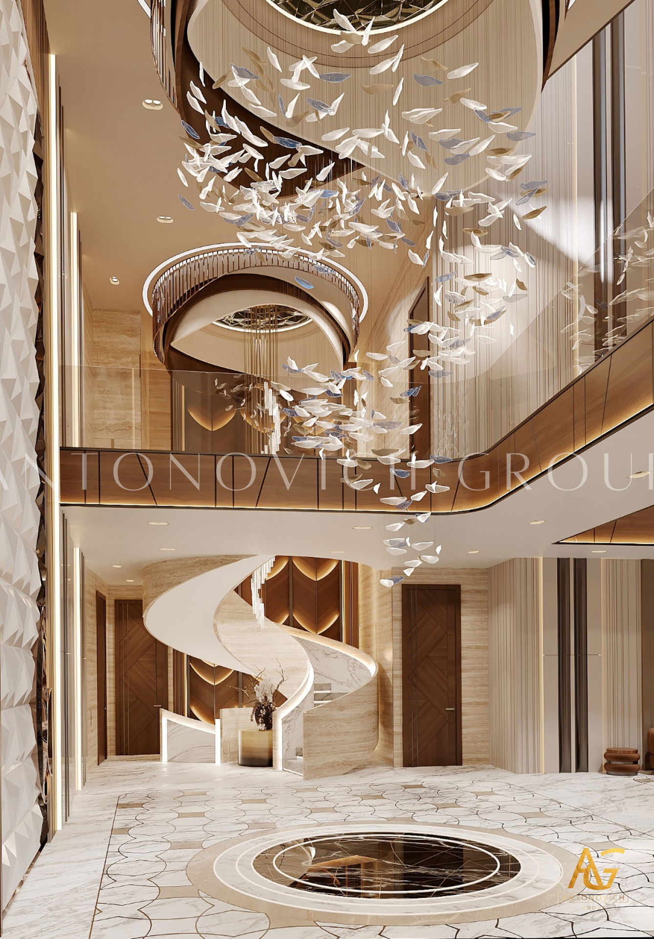Bespoke Entrance Design: Crafting Grandeur with Custom Chandeliers and Spiral Staircases