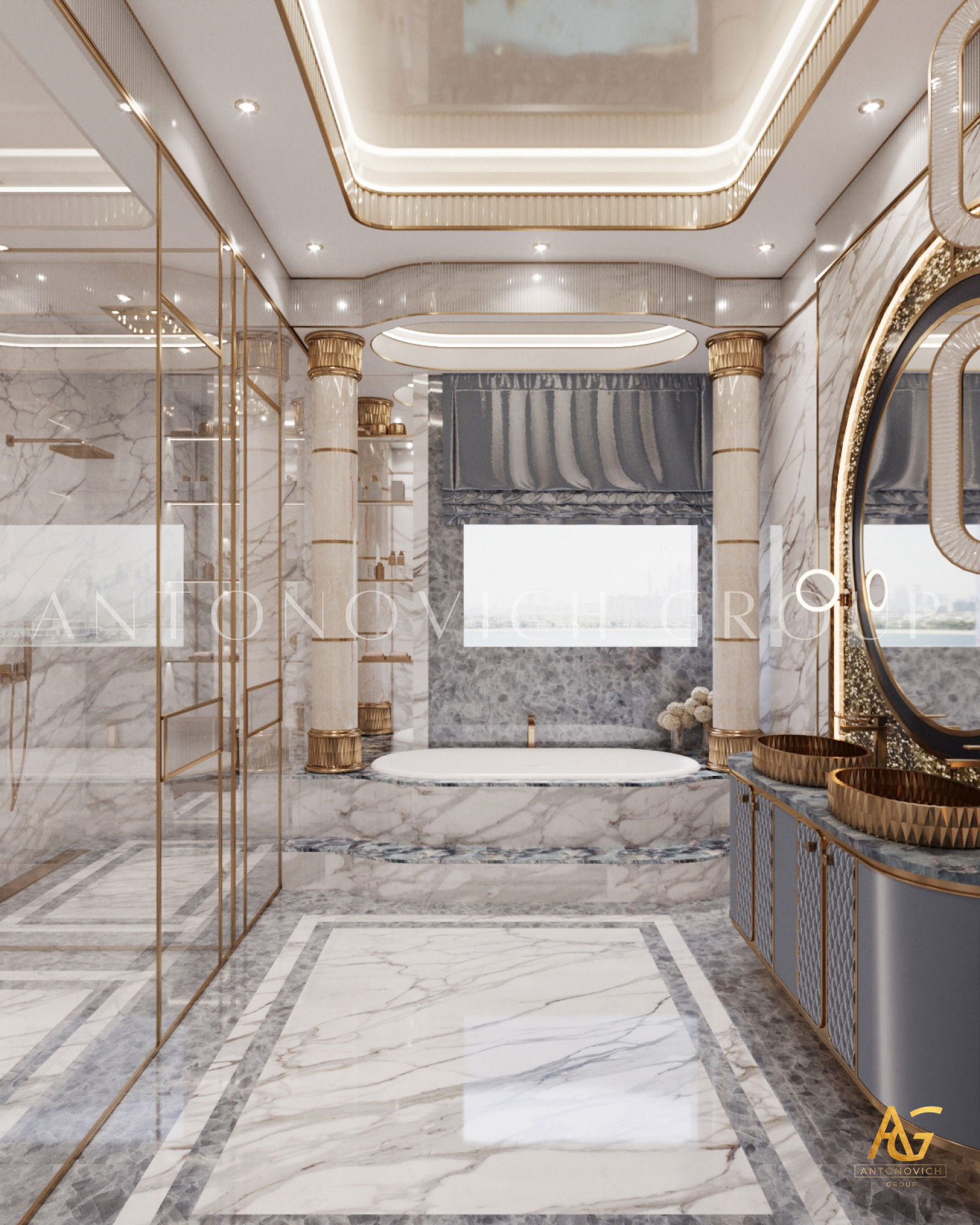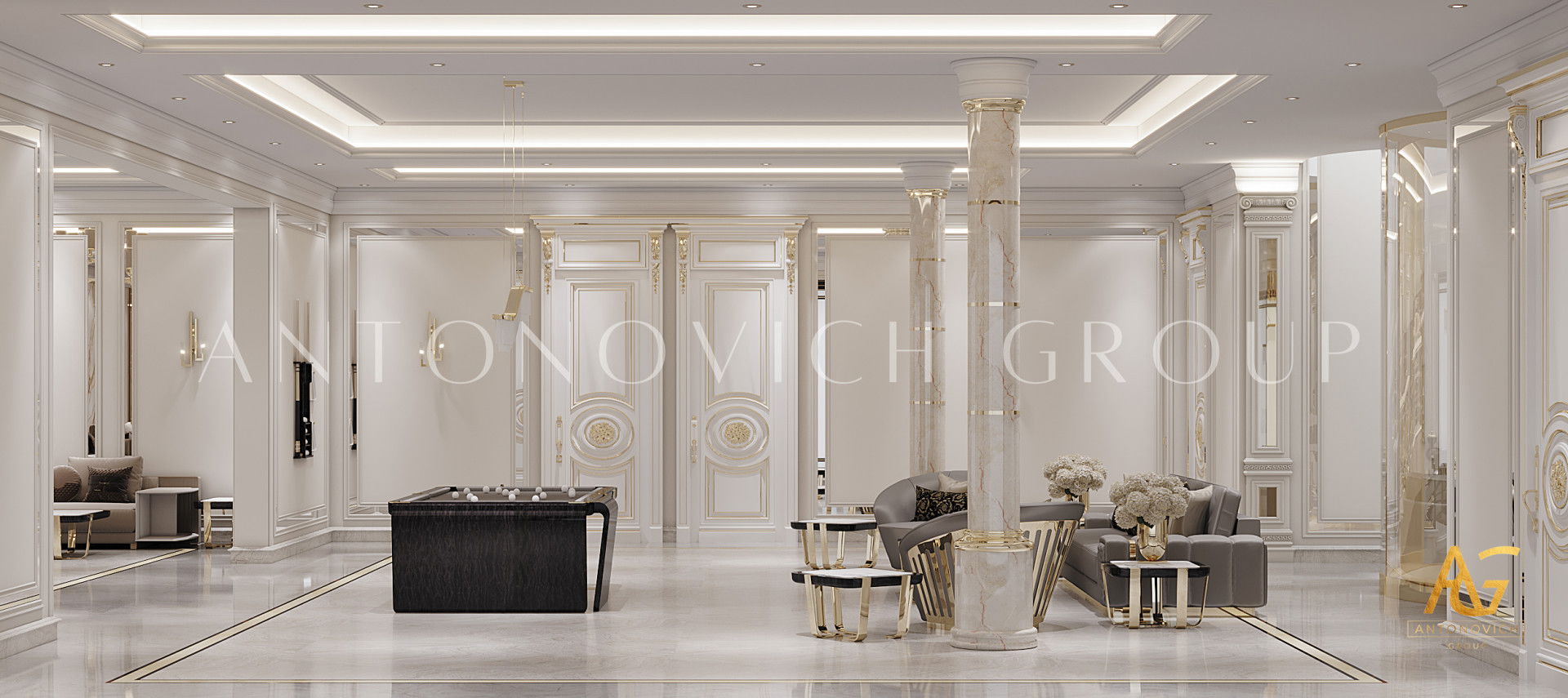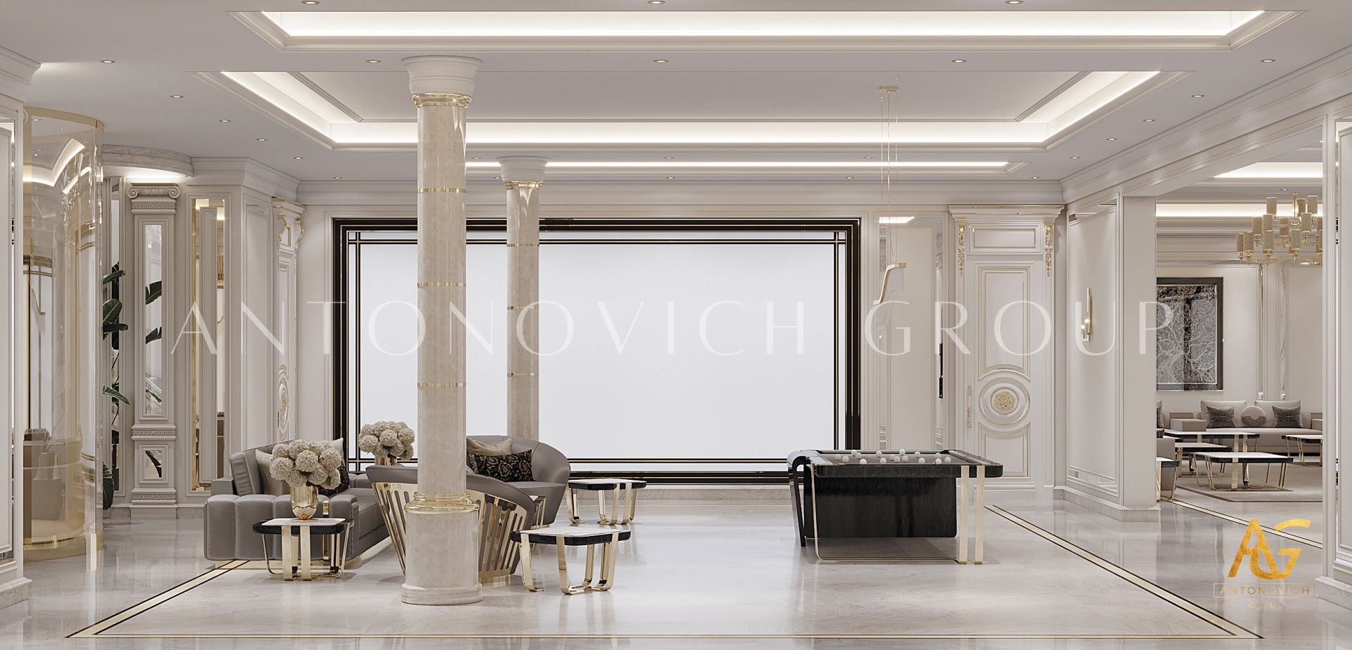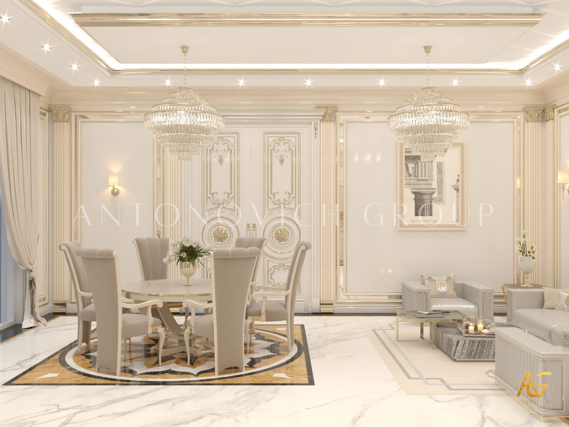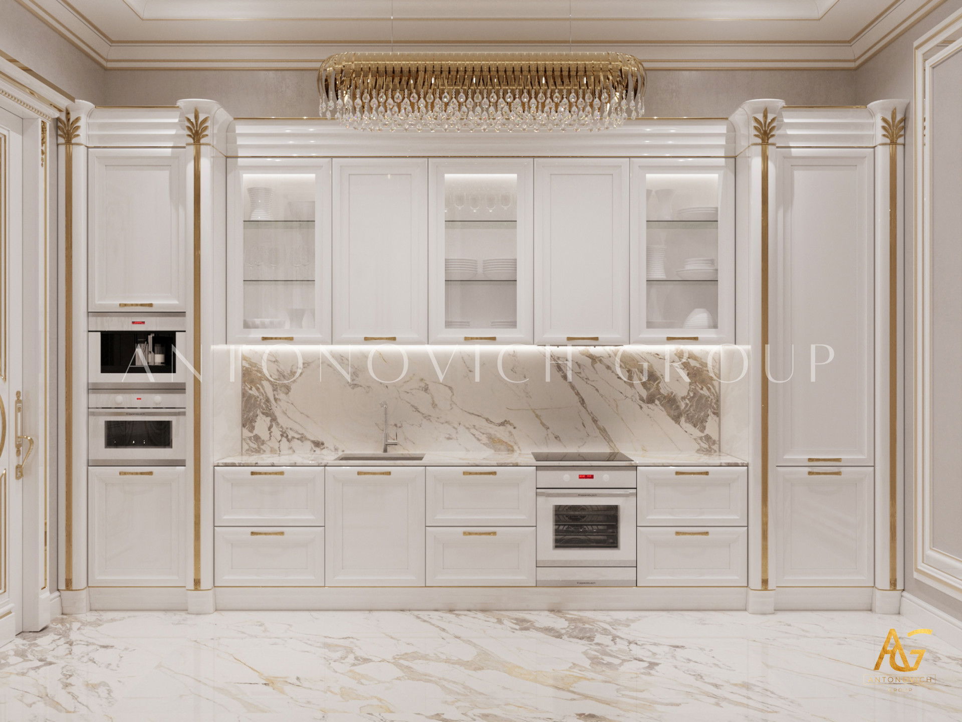 Stepping inside the villa is like entering a realm where classic elegance meets modern luxury. Antonovich Group's interior design team has orchestrated a symphony of opulent details, creating an environment that is both regal and inviting.