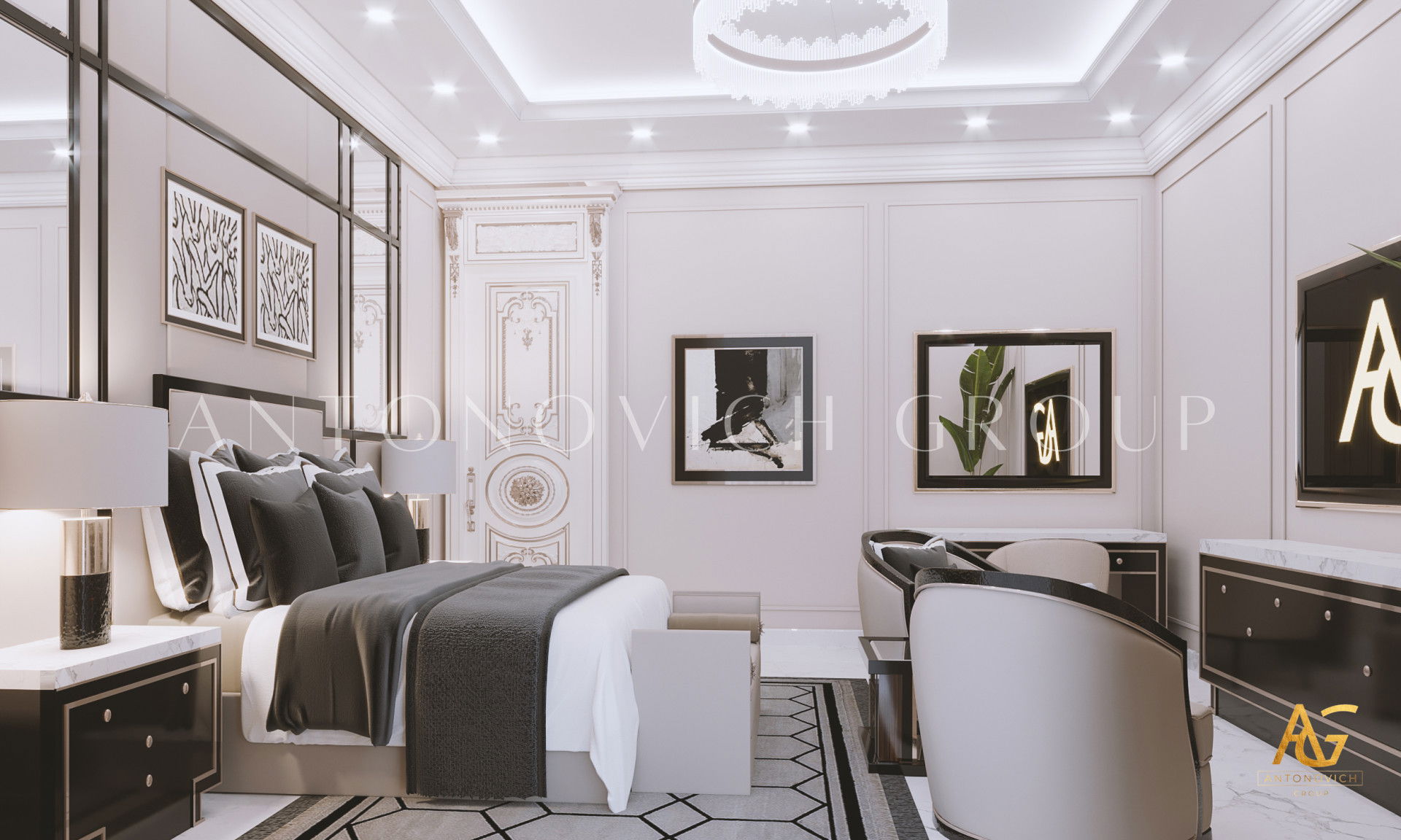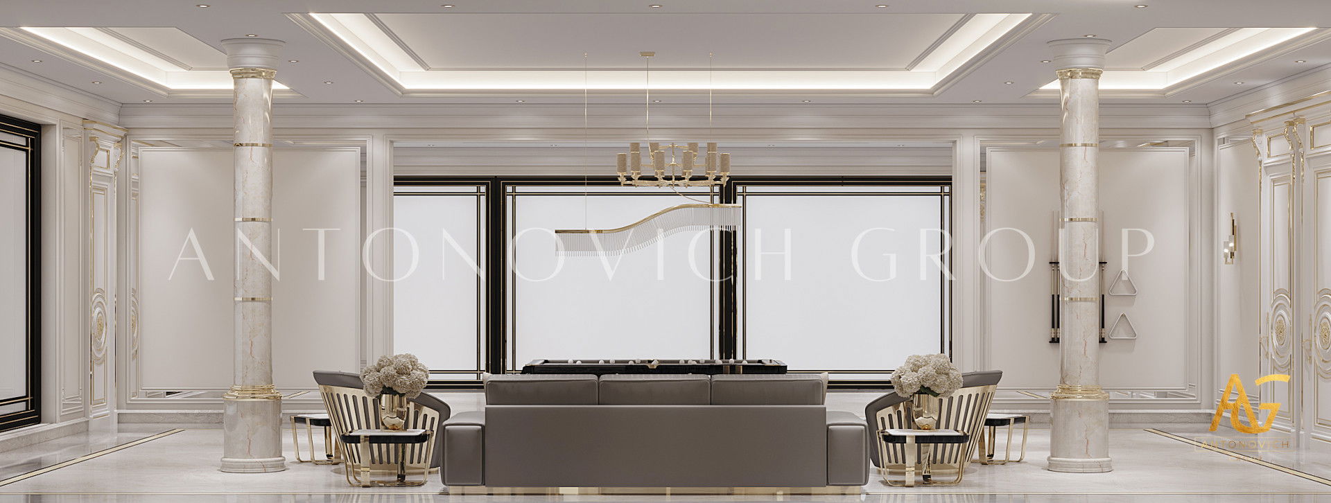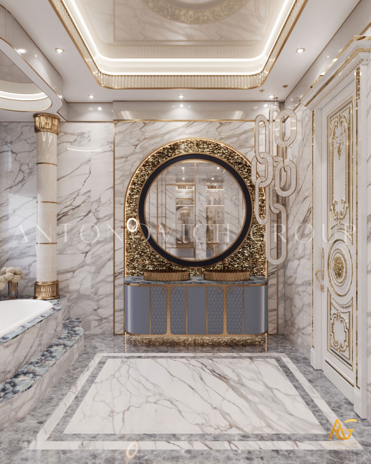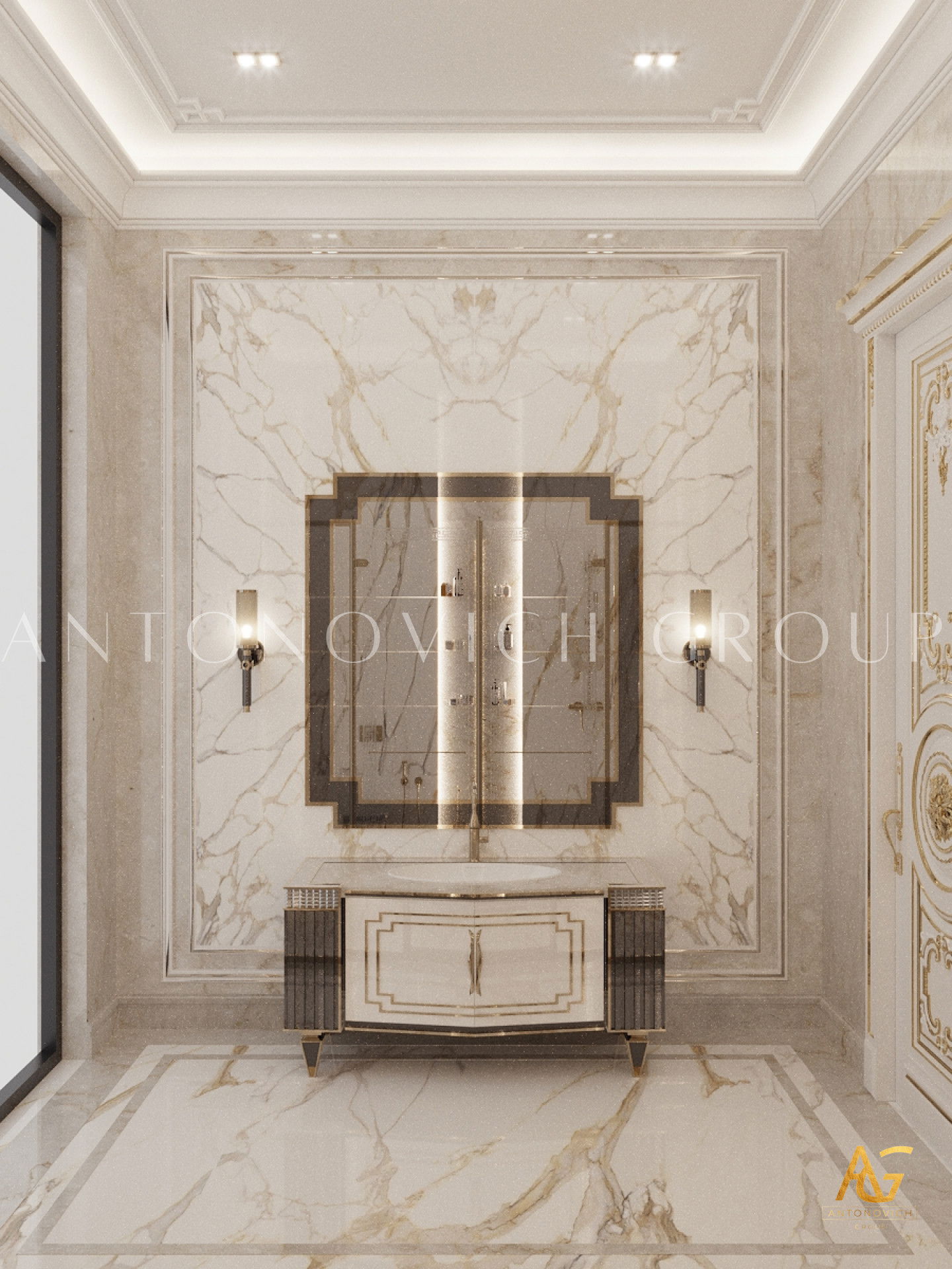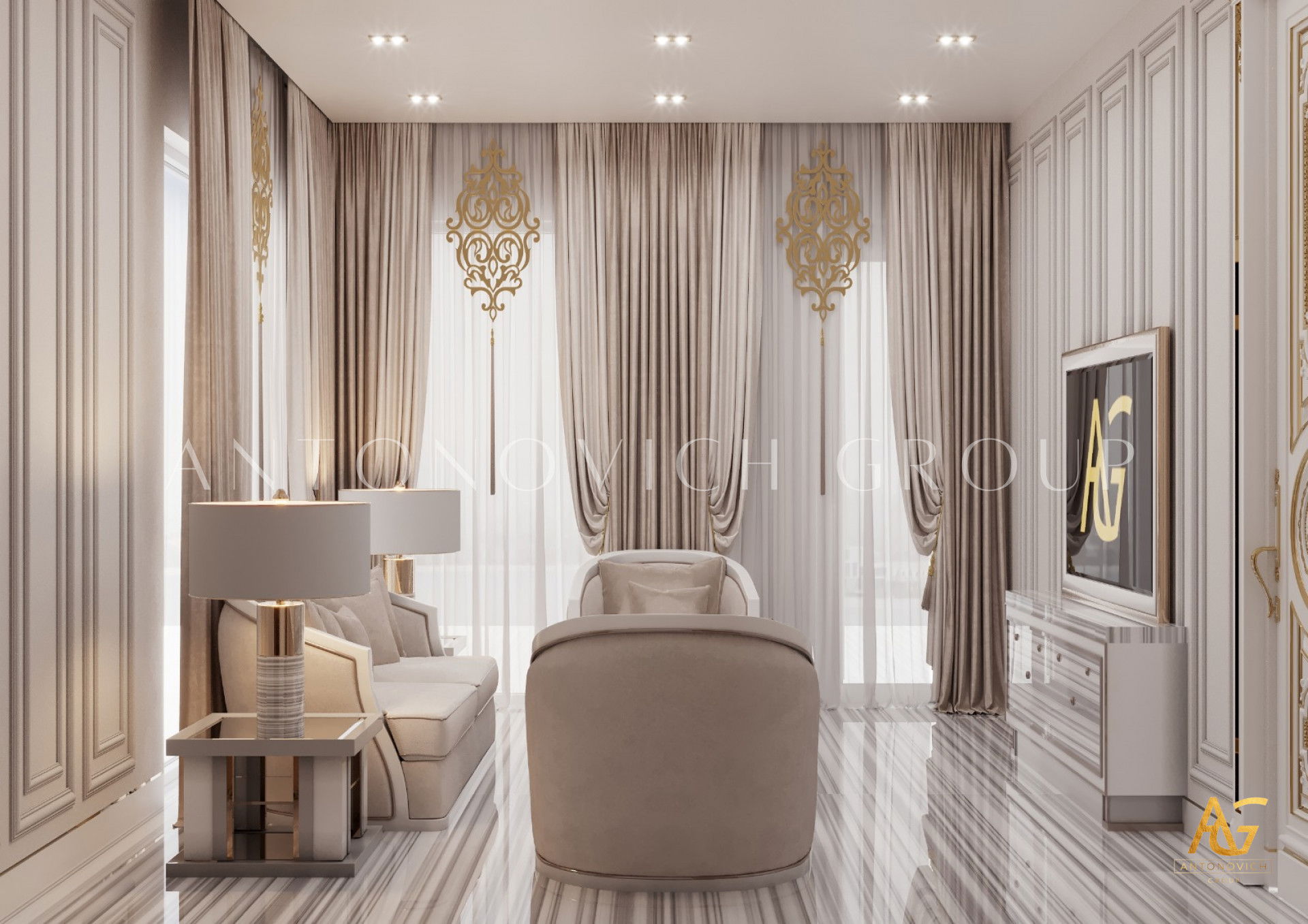 Stepping inside the villa is like entering a realm where classic elegance meets modern luxury. Antonovich Group's interior design team has orchestrated a symphony of opulent details, creating an environment that is both regal and inviting.
