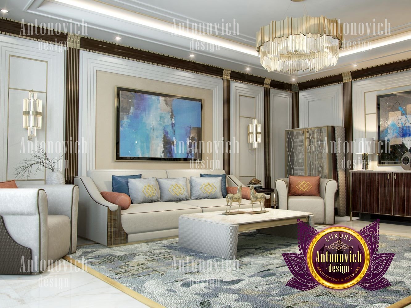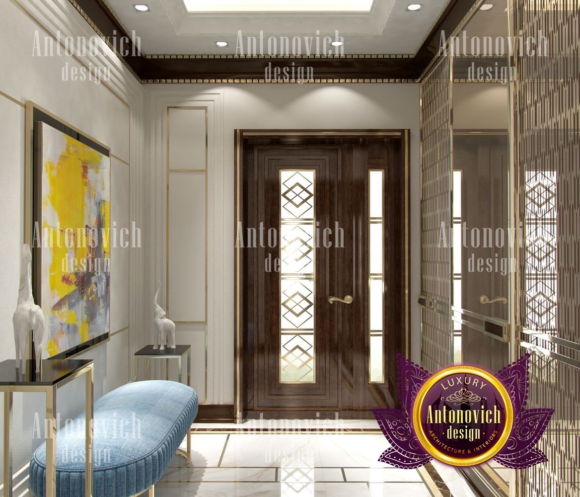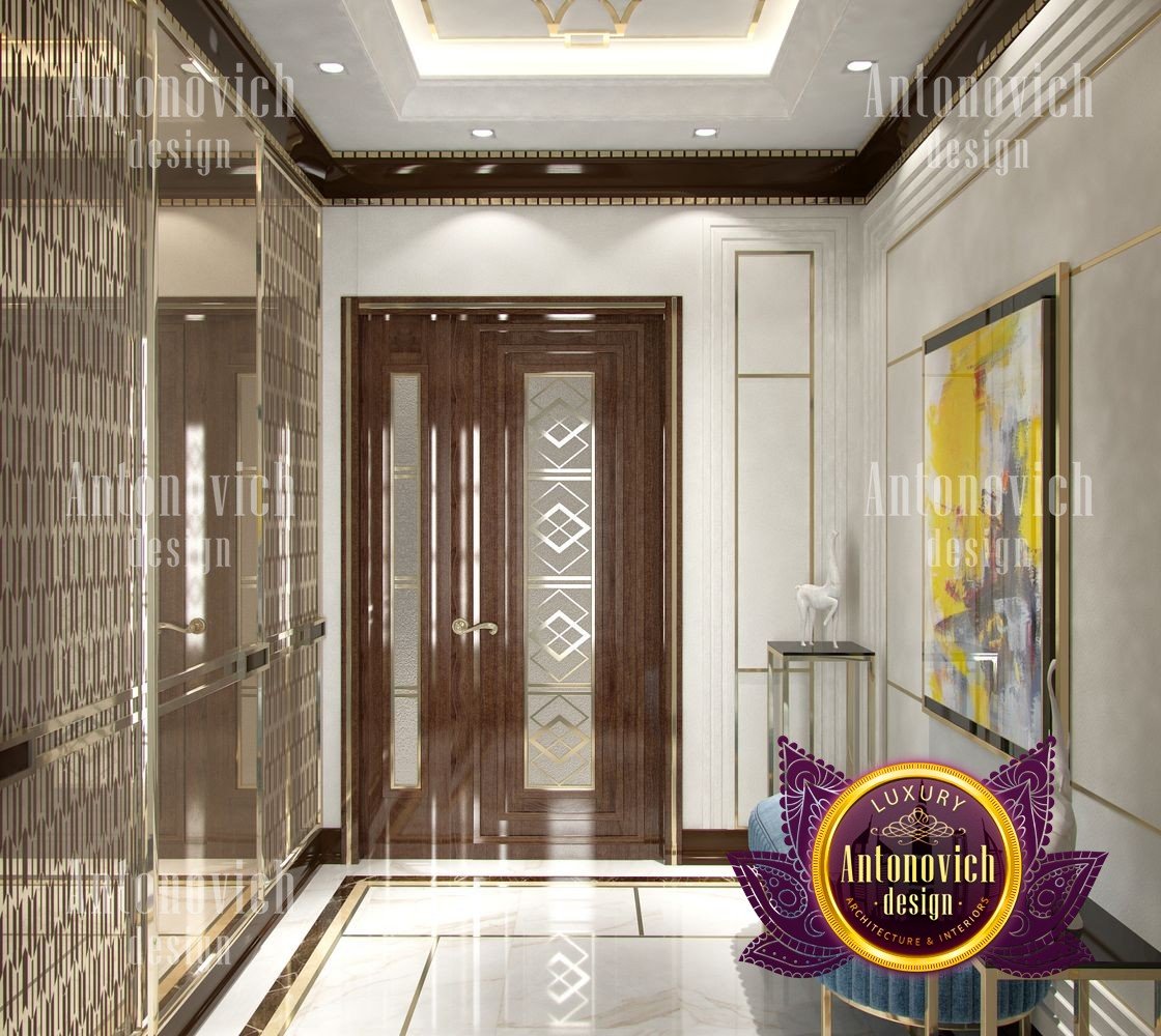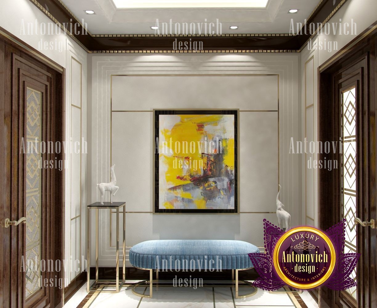 Stylish apartment interior in Dubai perfectly matches the stylish and contemporary nature of its owner. With his dynamic and active lifestyle it is very important in own home to be able to relax in a comfortable environment. Interior design in the UAE from the studio Luxury Antonovich Design is the creation of absolute comfort with a respectable character. Modern style in the interior acquired its easy and laid-back charm. Apartment Design Dubai has a lovely concise and clean lines. In the lobby, interior designers have taken chocolate shades as a basis. Glossy facades of the sliding door wardrobe reflect original features. And the gloss itself glitters with more luster, thanks to the abundance of accents in the form of LED backlighting. At the request of the owner in the hall additional seating area with stylish seating was organized. Saturated shades of the hall flow in more gentle hues of the interior. Apartment Design Dubai perfectly corresponds to the fashion trends of modern interiors. The focus here is in intellectual comfort. Living room is harmoniously combined with the dining room and kitchen. Quite spacious dining room speaks of the hospitality of the villa owner. Spectacular design techniques fill the interior with a special mood of warmth of home comfort. Thus, modern fireplace is built into the wall, which is decorated with natural stone in cool shades of gray. The ceiling lighting is decorated with lines, which along with original chandeliers illuminate the interior.