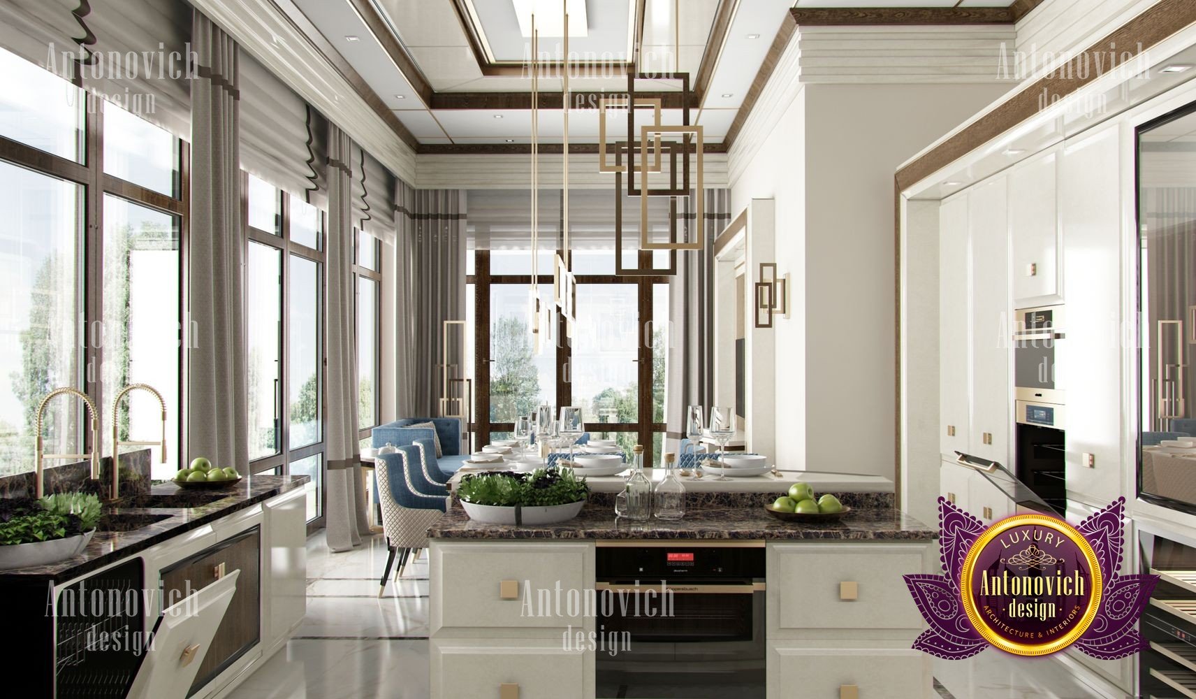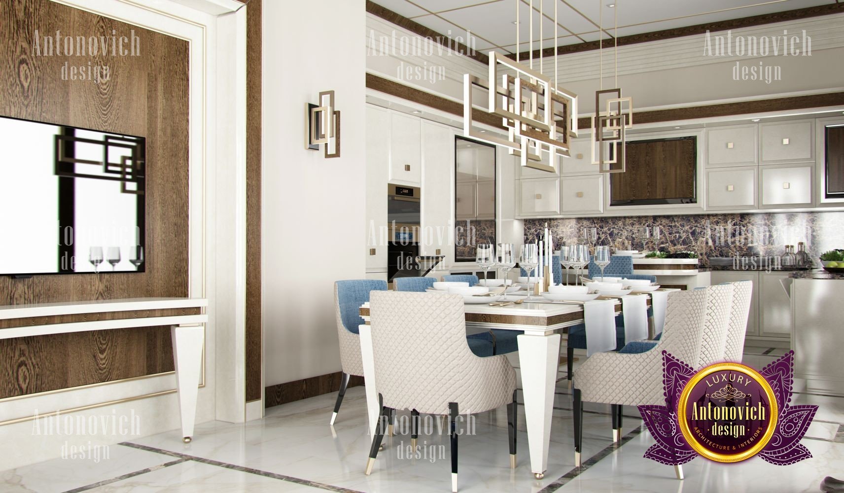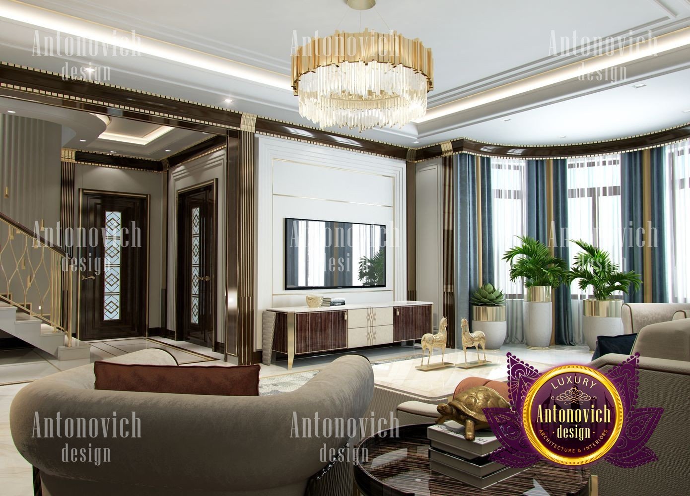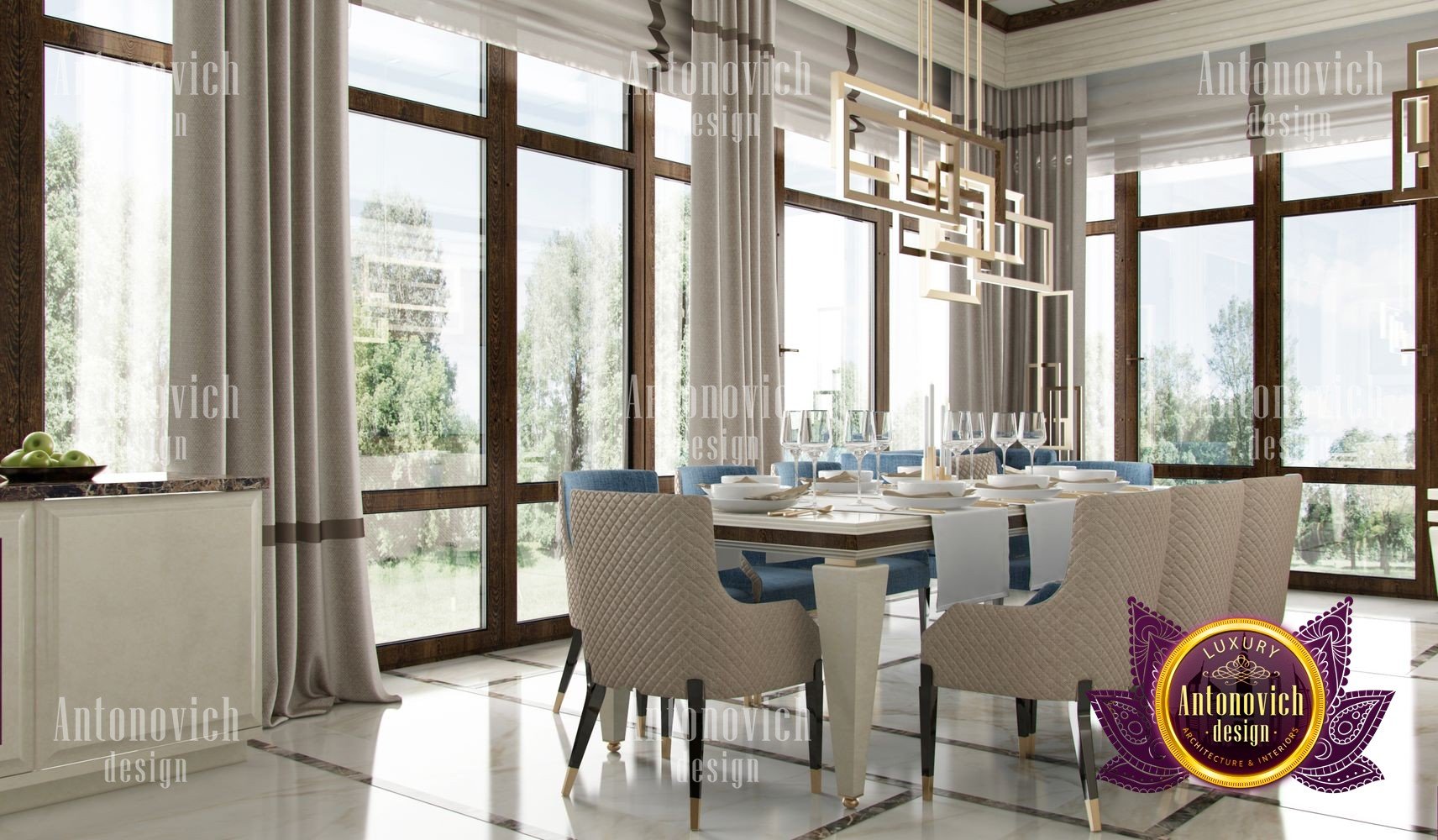 Stylish apartment interior in Dubai perfectly matches the stylish and contemporary nature of its owner. With his dynamic and active lifestyle it is very important in own home to be able to relax in a comfortable environment. Interior design in the UAE from the studio Luxury Antonovich Design is the creation of absolute comfort with a respectable character. Modern style in the interior acquired its easy and laid-back charm. Apartment Design Dubai has a lovely concise and clean lines. In the lobby, interior designers have taken chocolate shades as a basis. Glossy facades of the sliding door wardrobe reflect original features. And the gloss itself glitters with more luster, thanks to the abundance of accents in the form of LED backlighting. At the request of the owner in the hall additional seating area with stylish seating was organized. Saturated shades of the hall flow in more gentle hues of the interior. Apartment Design Dubai perfectly corresponds to the fashion trends of modern interiors. The focus here is in intellectual comfort. Living room is harmoniously combined with the dining room and kitchen. Quite spacious dining room speaks of the hospitality of the villa owner. Spectacular design techniques fill the interior with a special mood of warmth of home comfort. Thus, modern fireplace is built into the wall, which is decorated with natural stone in cool shades of gray. The ceiling lighting is decorated with lines, which along with original chandeliers illuminate the interior.