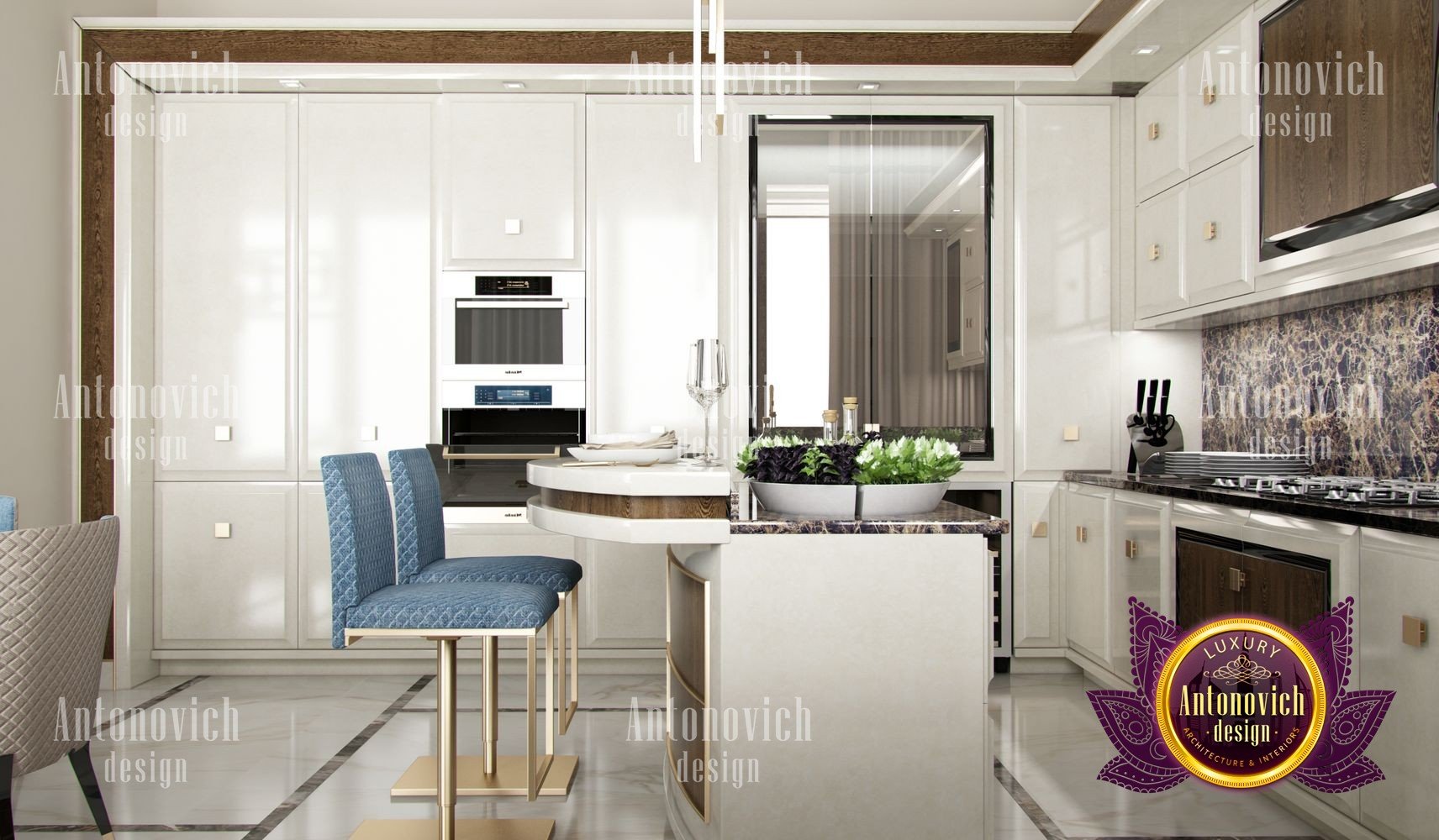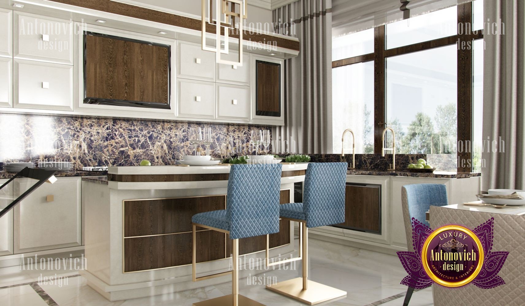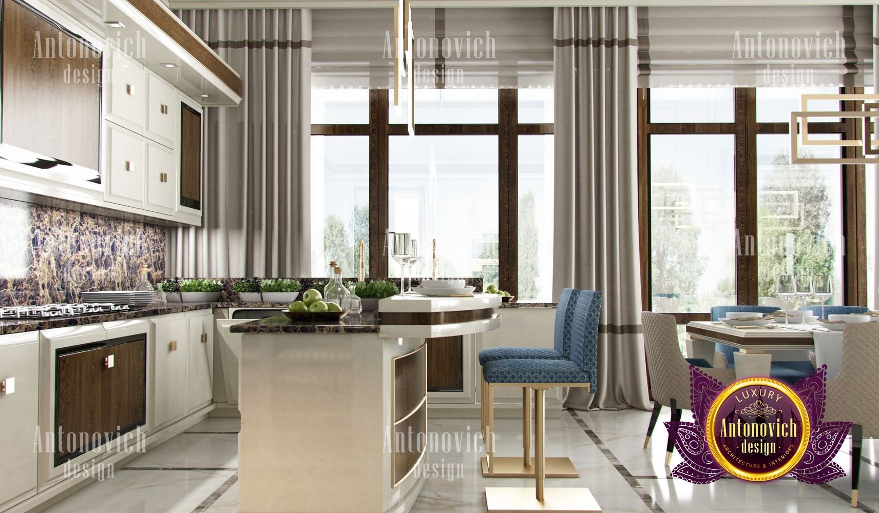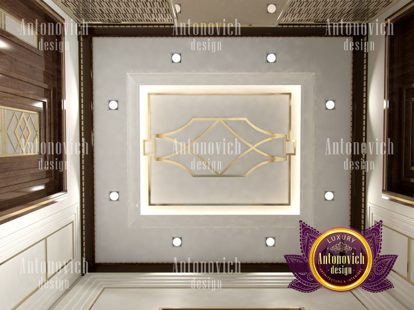 Stylish apartment interior in Dubai perfectly matches the stylish and contemporary nature of its owner. With his dynamic and active lifestyle it is very important in own home to be able to relax in a comfortable environment. Interior design in the UAE from the studio Luxury Antonovich Design is the creation of absolute comfort with a respectable character. Modern style in the interior acquired its easy and laid-back charm. Apartment Design Dubai has a lovely concise and clean lines. In the lobby, interior designers have taken chocolate shades as a basis. Glossy facades of the sliding door wardrobe reflect original features. And the gloss itself glitters with more luster, thanks to the abundance of accents in the form of LED backlighting. At the request of the owner in the hall additional seating area with stylish seating was organized. Saturated shades of the hall flow in more gentle hues of the interior. Apartment Design Dubai perfectly corresponds to the fashion trends of modern interiors. The focus here is in intellectual comfort. Living room is harmoniously combined with the dining room and kitchen. Quite spacious dining room speaks of the hospitality of the villa owner. Spectacular design techniques fill the interior with a special mood of warmth of home comfort. Thus, modern fireplace is built into the wall, which is decorated with natural stone in cool shades of gray. The ceiling lighting is decorated with lines, which along with original chandeliers illuminate the interior.