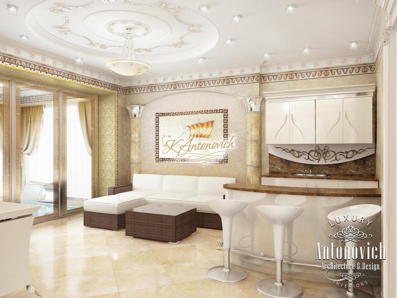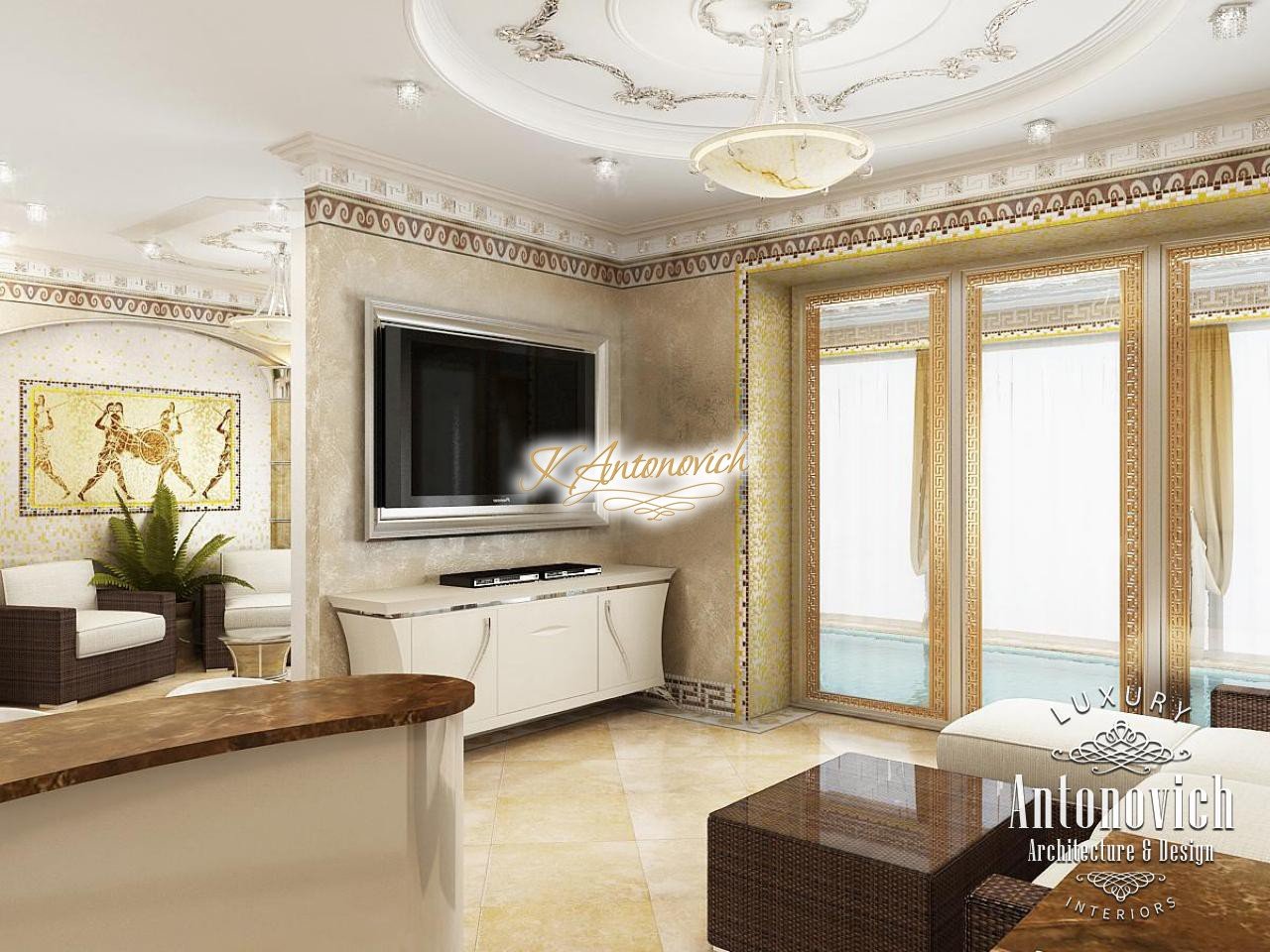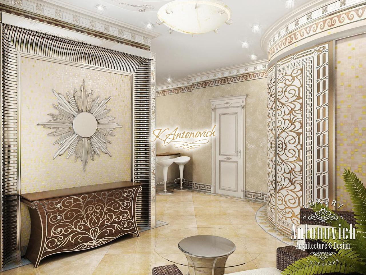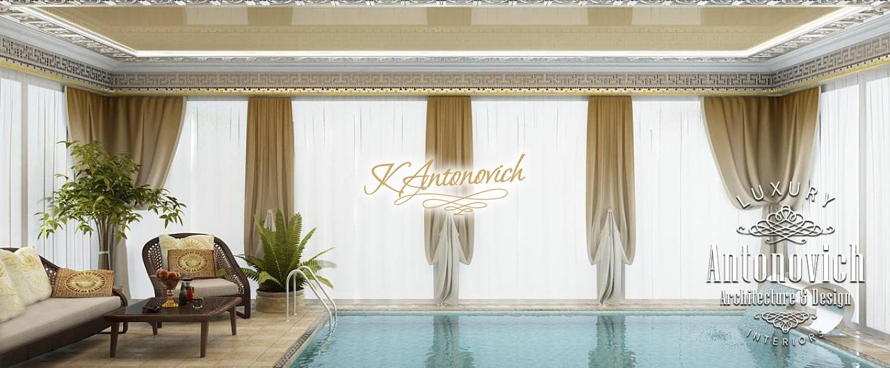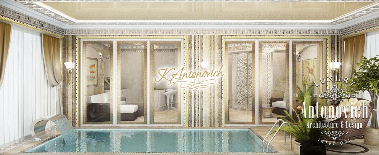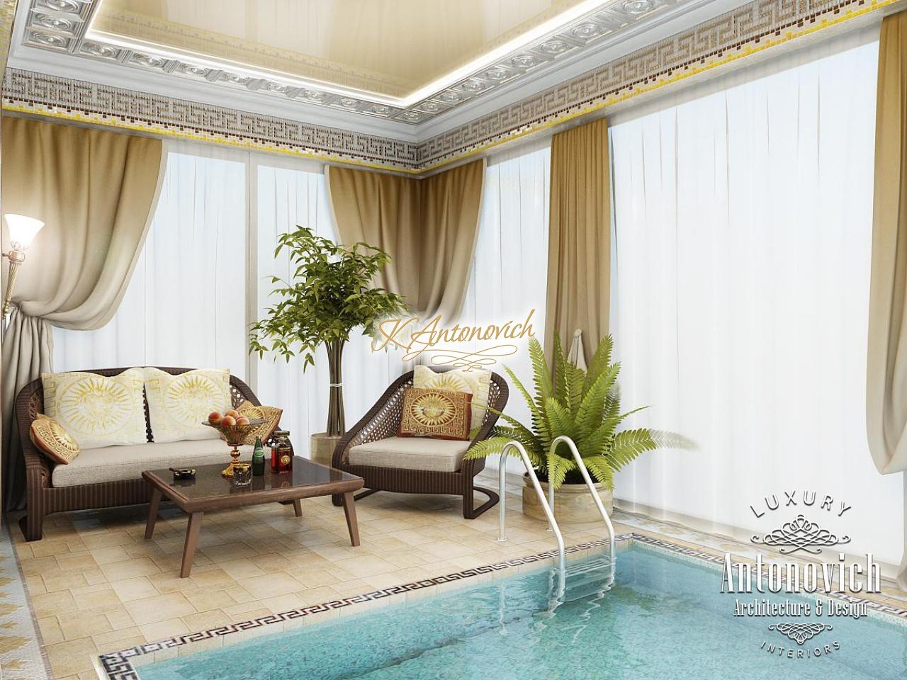 Villa design in Abu Dhabi very delicate and perfect reflects the love of a life holiday of its owners. Design studio in Dubai always creates exclusive luxury interiors that are ideal habitats for the owners of houses and apartments. The swimming pool design in Abu Dhabi gives a clear idea that the owners of the house are very fond of this type of rest and can afford the best and have a very high status. The pool interior is quite self-sufficient. There is a hall, a small kitchen, a sitting area and the pool itself. Interior design Abu Dhabi is very elegant and refined. The walls are decorated with mosaic tiles of pleasant shades. The large windows have curtains of precious silk. The ceiling decor harmoniously echoes the floor decor.