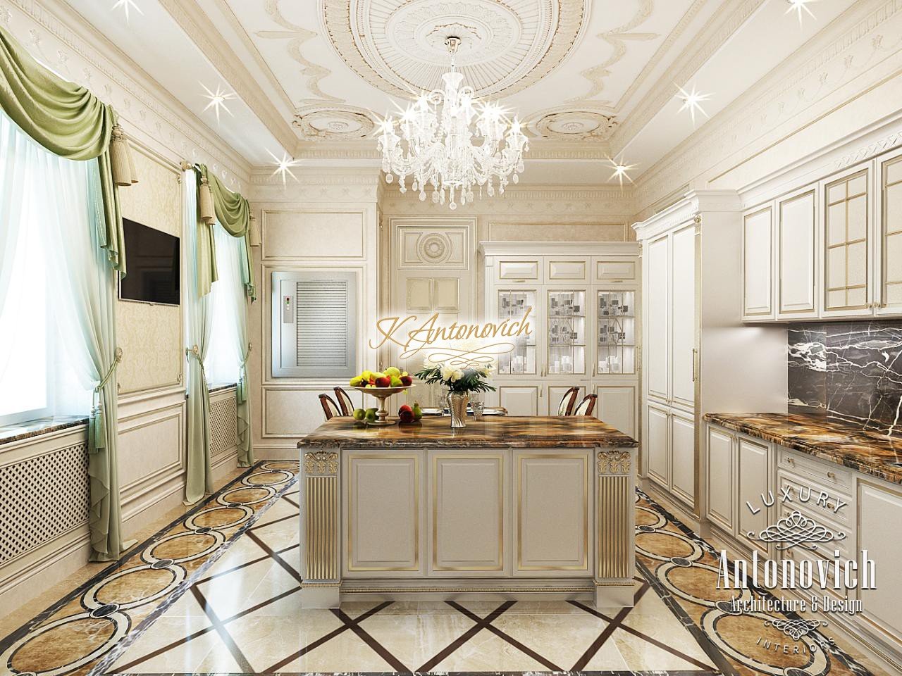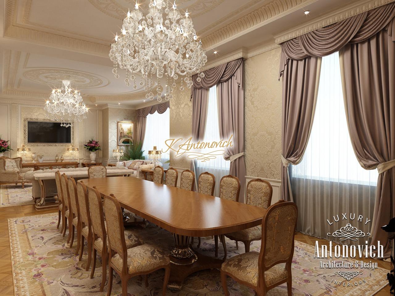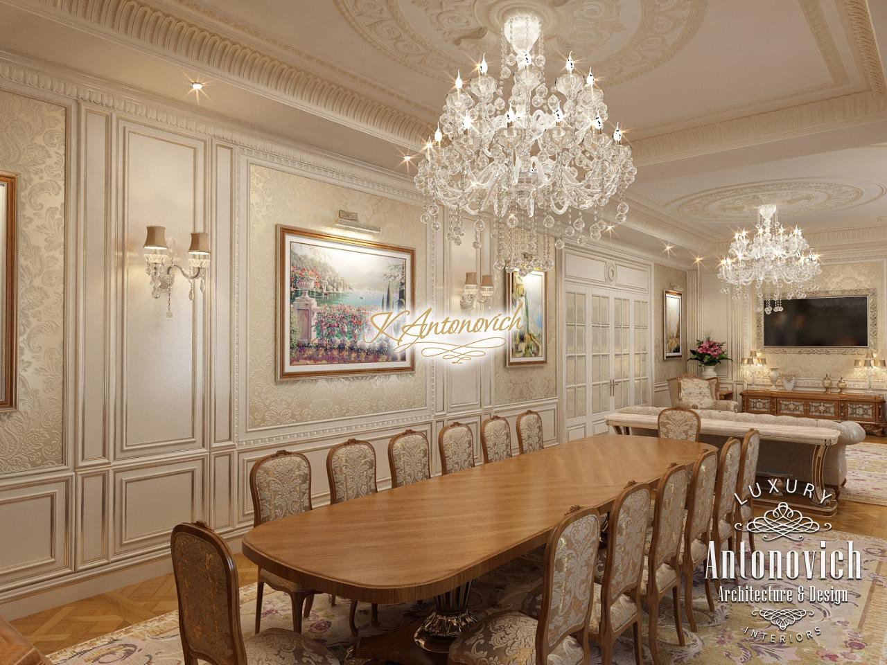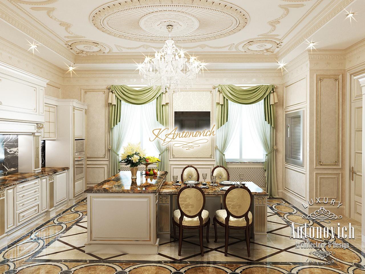 How beautiful, luxurious and elegant interior is, you can understand from the first moments of your stay in the house. Large size of the hall embodies the best traditions of modern classics. And interior designers Dubai bring to these traditions the shade of striking individuality. The highlight of each author's project of design studio Dubai Luxury Antonovich Design became floors, carved from precious marble. Dubai Interior designers create ornaments of the unique beauty. And thanks to modern technology, you can implement any design ideas. Interior literally captivates with its beauty and perfection. Carved pattern on the floor gracefully and elegantly echoes motifs of the ceiling decor. The central part of the pattern of carved on marble picks up the outlines of a pattern in illuminated stained glass, which framed a magnificent crystal chandelier. A refined curls of stucco on the ceiling repeat pattern with swirls of dark brown marble. Great hall is the beginning of a luxurious interior story that continues in the rest of the apartment. And each of those stories begins with luxury door, which is decorated with carved pattern and gilding. House Design Dubai underlines the fact that there you are always welcome. In the dining room interior, which is combined with the kitchen, there is a large table made of wood of valuable species, surrounded by many tall chairs with noble backs. The dining room harmoniously continues cozy living room. The floors are made of wood, soft Persian carpet and curtains of precious silk of coffee shade, are the basis of the warm and cozy mood in the interior.