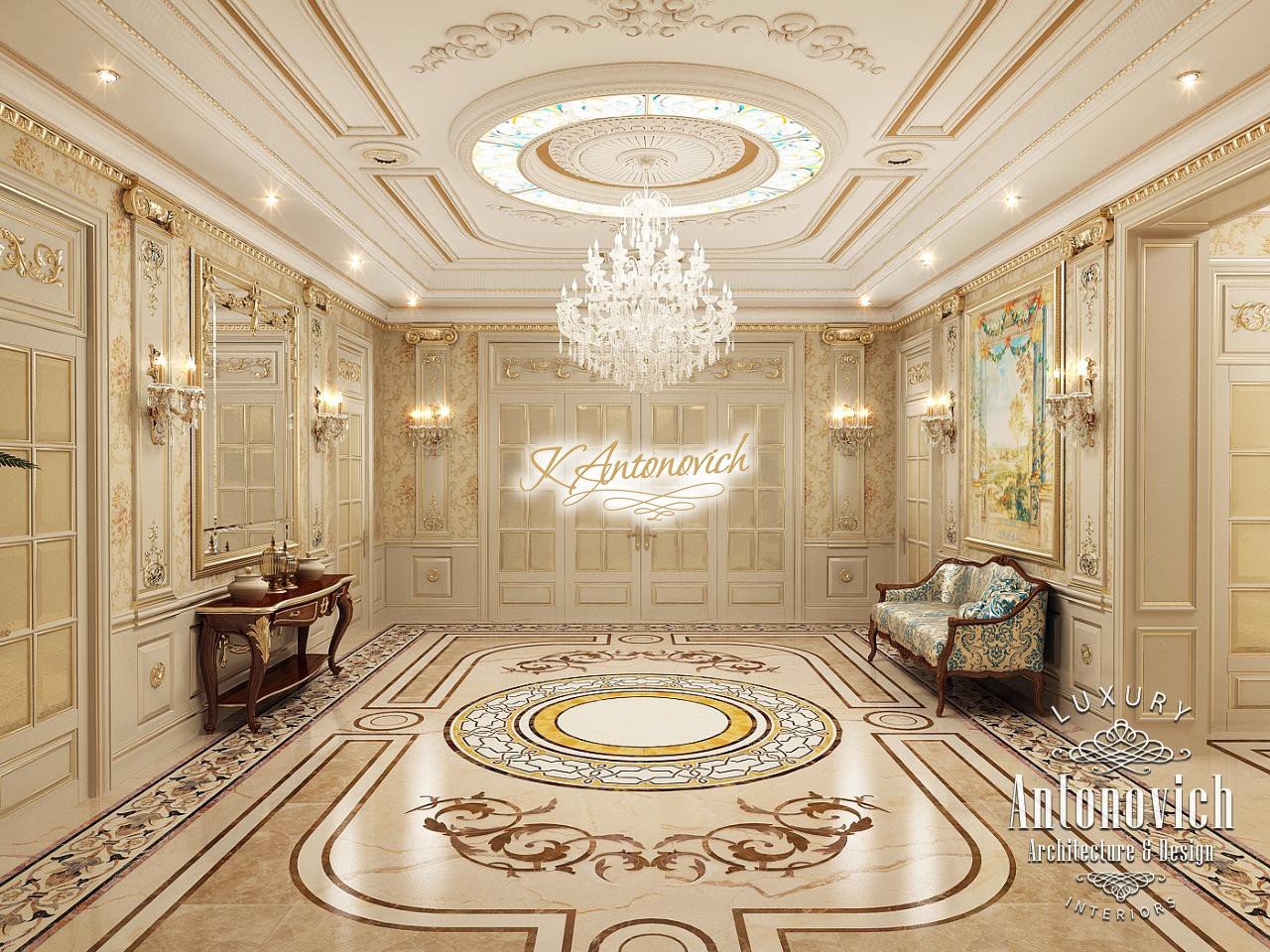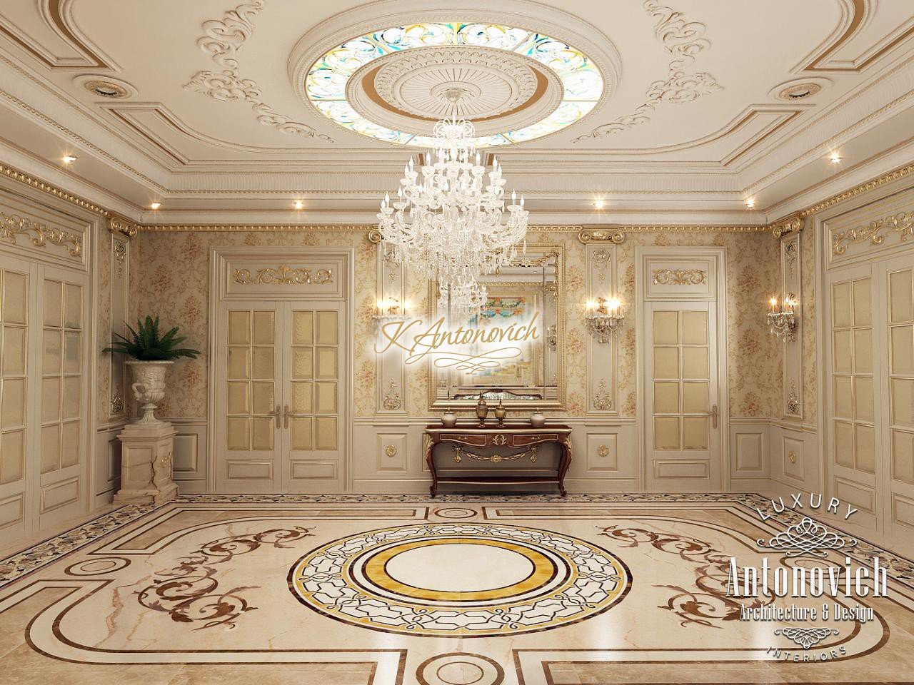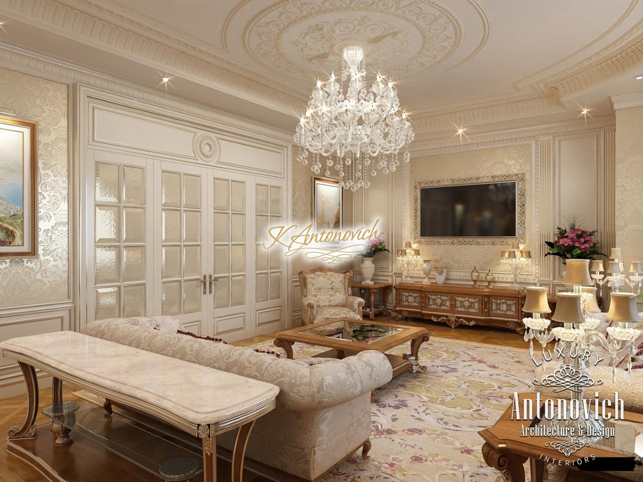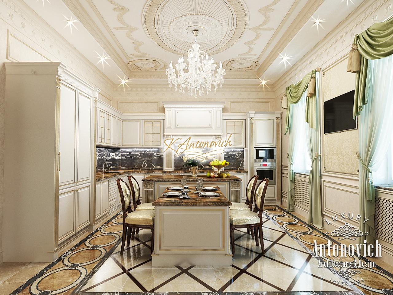 How beautiful, luxurious and elegant interior is, you can understand from the first moments of your stay in the house. Large size of the hall embodies the best traditions of modern classics. And interior designers Dubai bring to these traditions the shade of striking individuality. The highlight of each author's project of design studio Dubai Luxury Antonovich Design became floors, carved from precious marble. Dubai Interior designers create ornaments of the unique beauty. And thanks to modern technology, you can implement any design ideas. Interior literally captivates with its beauty and perfection. Carved pattern on the floor gracefully and elegantly echoes motifs of the ceiling decor. The central part of the pattern of carved on marble picks up the outlines of a pattern in illuminated stained glass, which framed a magnificent crystal chandelier. A refined curls of stucco on the ceiling repeat pattern with swirls of dark brown marble. Great hall is the beginning of a luxurious interior story that continues in the rest of the apartment. And each of those stories begins with luxury door, which is decorated with carved pattern and gilding. House Design Dubai underlines the fact that there you are always welcome. In the dining room interior, which is combined with the kitchen, there is a large table made of wood of valuable species, surrounded by many tall chairs with noble backs. The dining room harmoniously continues cozy living room. The floors are made of wood, soft Persian carpet and curtains of precious silk of coffee shade, are the basis of the warm and cozy mood in the interior.