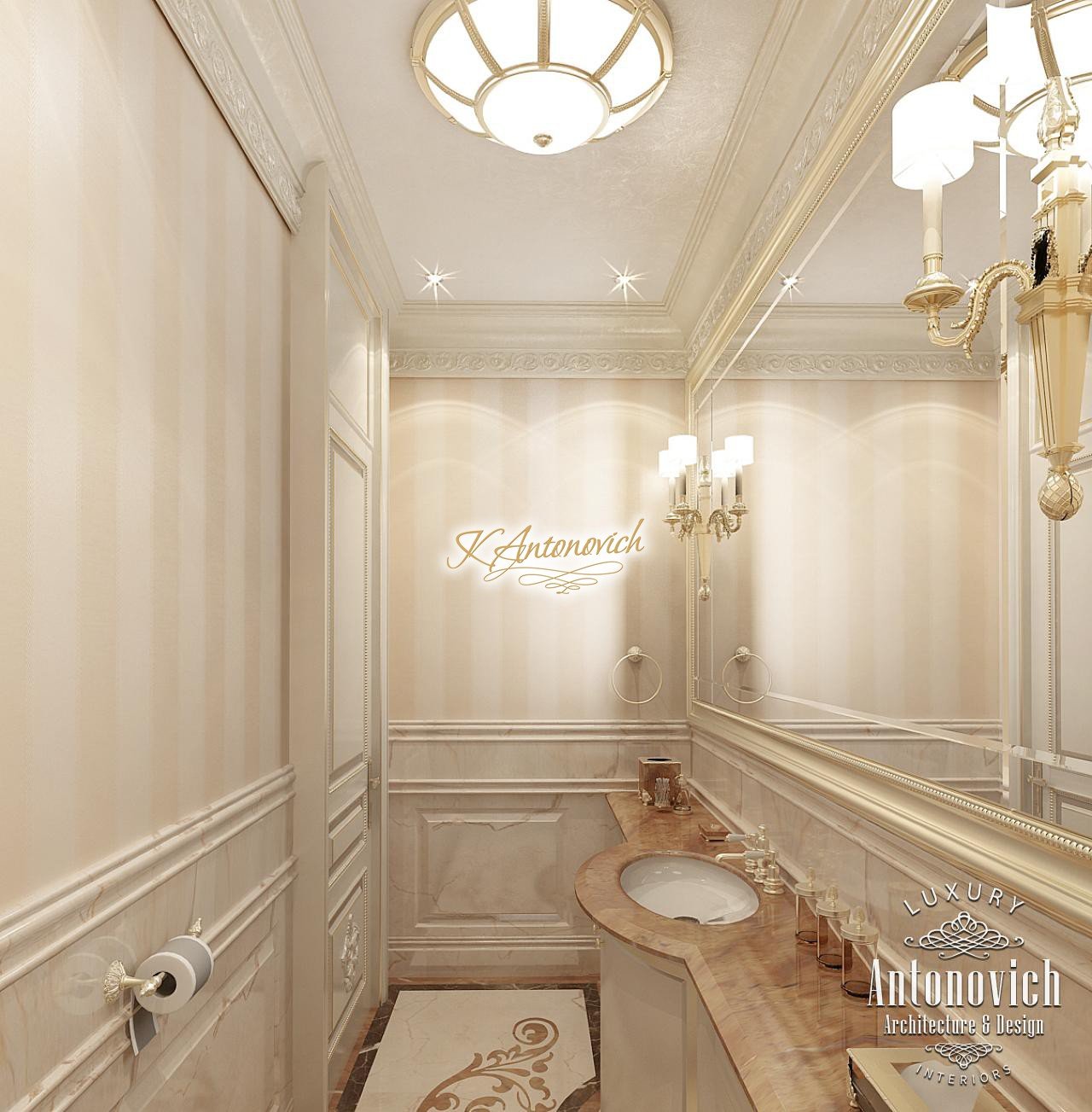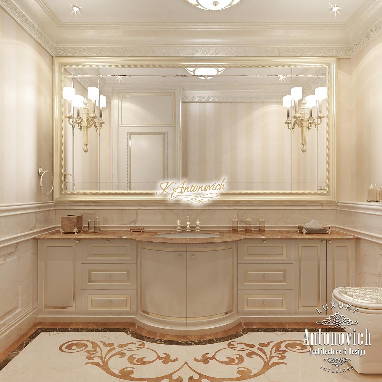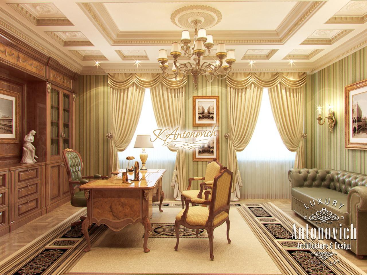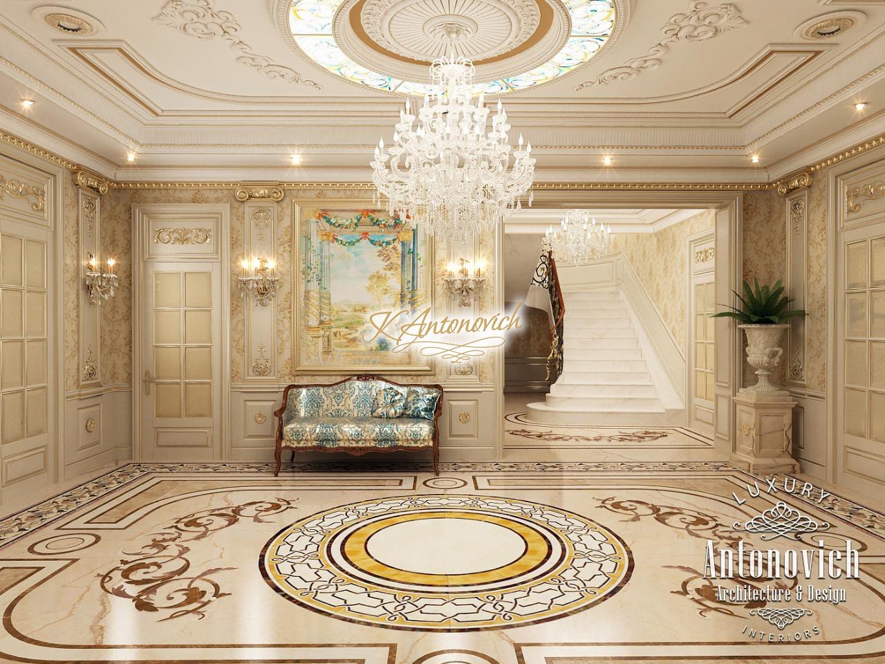 How beautiful, luxurious and elegant interior is, you can understand from the first moments of your stay in the house. Large size of the hall embodies the best traditions of modern classics. And interior designers Dubai bring to these traditions the shade of striking individuality. The highlight of each author's project of design studio Dubai Luxury Antonovich Design became floors, carved from precious marble. Dubai Interior designers create ornaments of the unique beauty. And thanks to modern technology, you can implement any design ideas. Interior literally captivates with its beauty and perfection. Carved pattern on the floor gracefully and elegantly echoes motifs of the ceiling decor. The central part of the pattern of carved on marble picks up the outlines of a pattern in illuminated stained glass, which framed a magnificent crystal chandelier. A refined curls of stucco on the ceiling repeat pattern with swirls of dark brown marble. Great hall is the beginning of a luxurious interior story that continues in the rest of the apartment. And each of those stories begins with luxury door, which is decorated with carved pattern and gilding. House Design Dubai underlines the fact that there you are always welcome. In the dining room interior, which is combined with the kitchen, there is a large table made of wood of valuable species, surrounded by many tall chairs with noble backs. The dining room harmoniously continues cozy living room. The floors are made of wood, soft Persian carpet and curtains of precious silk of coffee shade, are the basis of the warm and cozy mood in the interior.