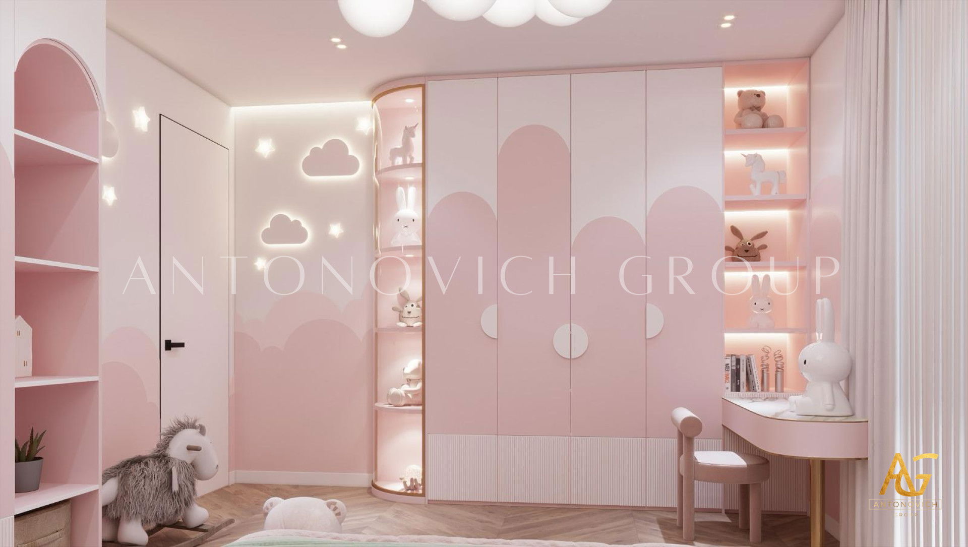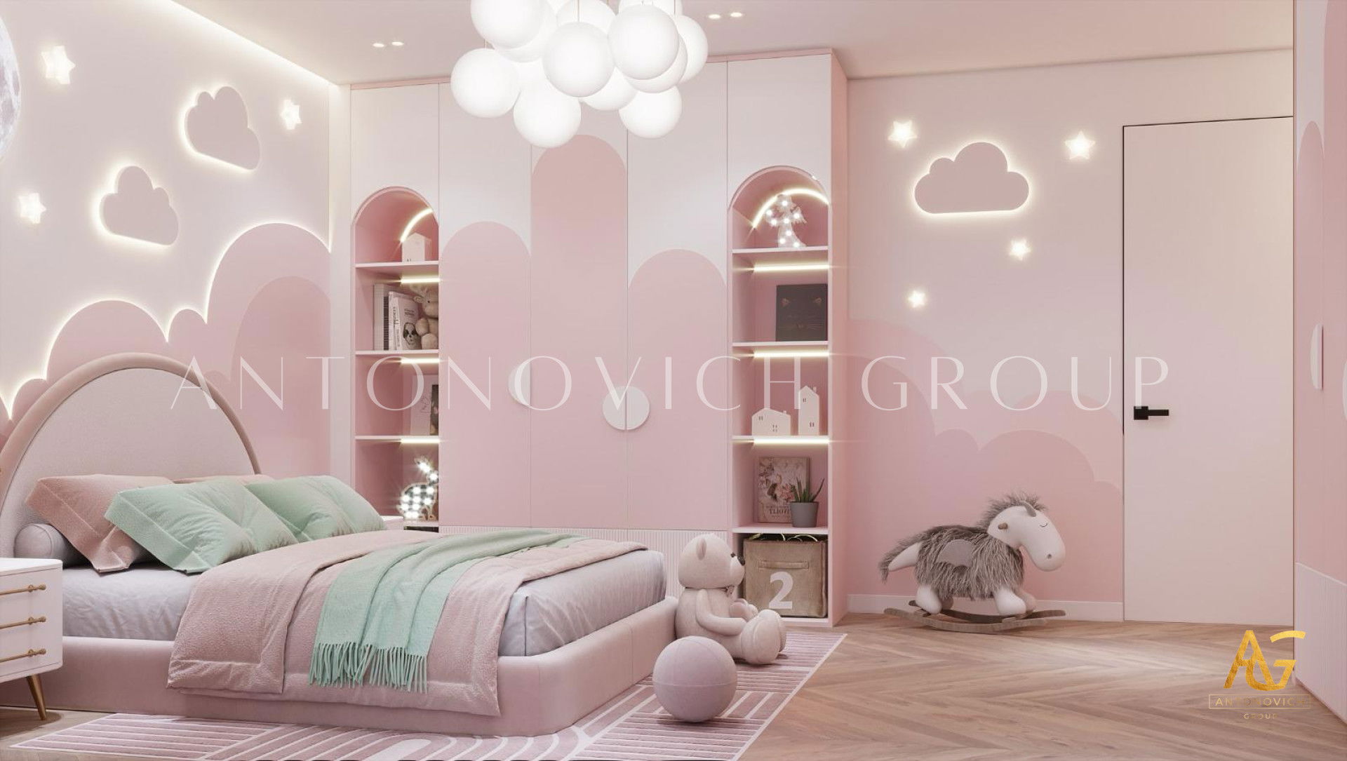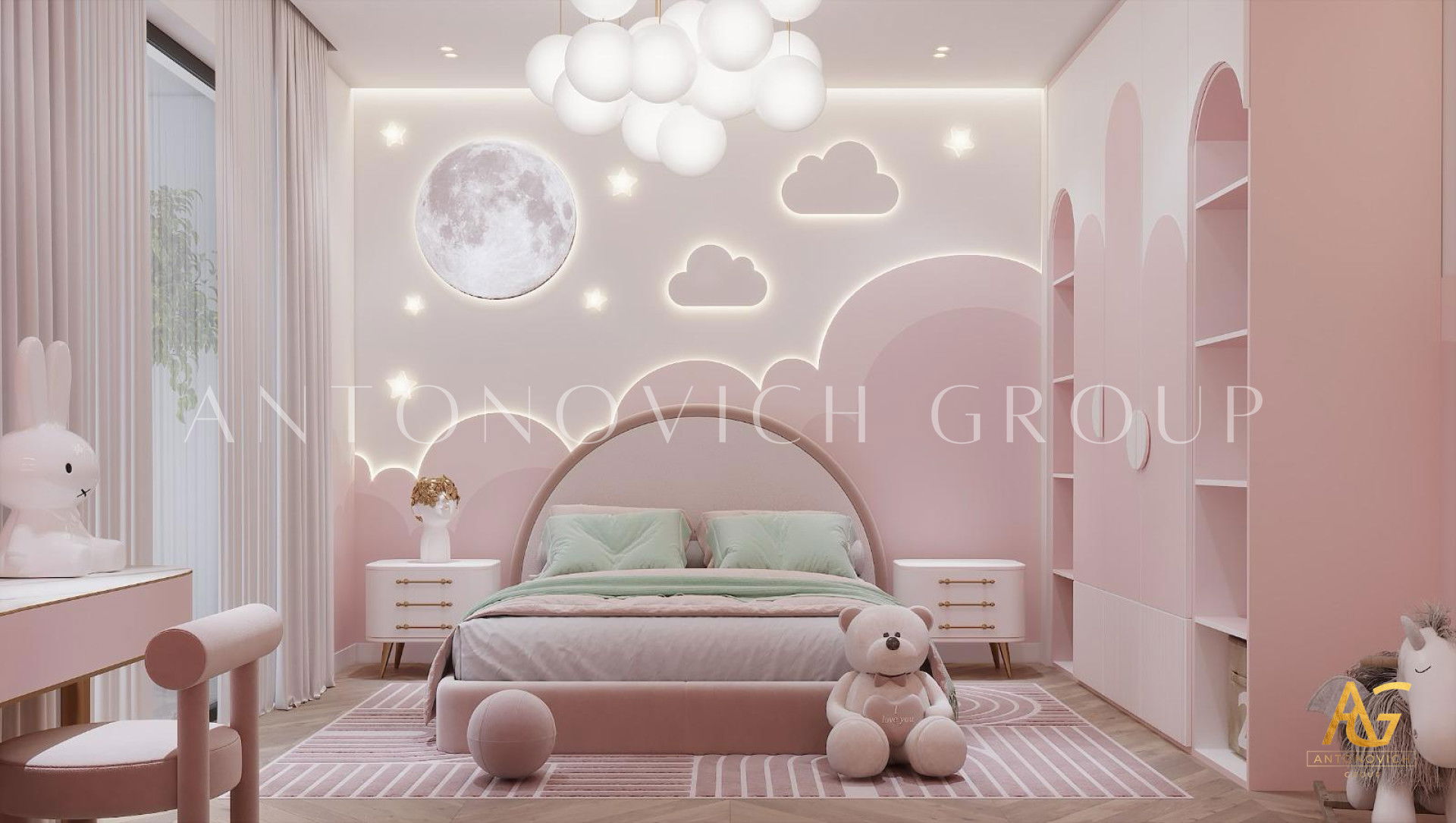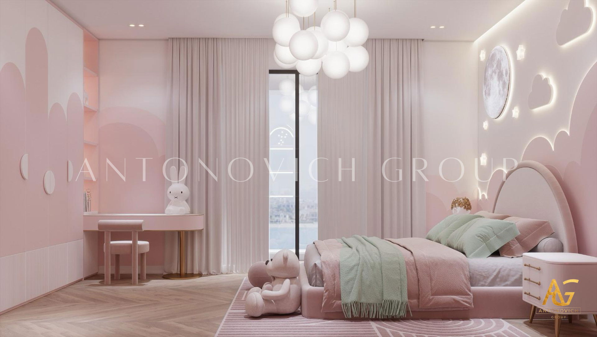 Home Interior Design Dubai reflects the dreams of every member of a large and happy family. The house project included several children's rooms design. This luxurious and charming children's room design was created for the youngest daughter of the owners of the house. The whole luxury interior design is made in the spirit of Dubai respectable classics. In the children's room interior interior designers offered a fascinating interior story with Art Deco accents. Children's room interior design must take into account the child's sex, age, psychology, as well as the enthusiasm of the young home owners. For the young princess the designers created a real fairy-tale palace. The interior is dominated with warm shades of pink palette. The main composition that decorates the child's room interior for a girl, became a comfortable bed. The high headboard made of wood, which is painte in cream and pink shades, is inlaid with carved decor and complement of genuine leather upholstery of pink hue. The bed looks harmoniously at the background of pink volumetric 3D panel. Superb texture of the panel plays a charming light. Ceiling design emphasizes the elegant mood of the children's room interior for a girl. Ornate Chandelier with forged elements, pink shades and crystal pendants perfectly fits into the luxurious interior. Interior design studio Dubai has developed an elite house project, in which every member of a large and happy family feels completely comfortable.