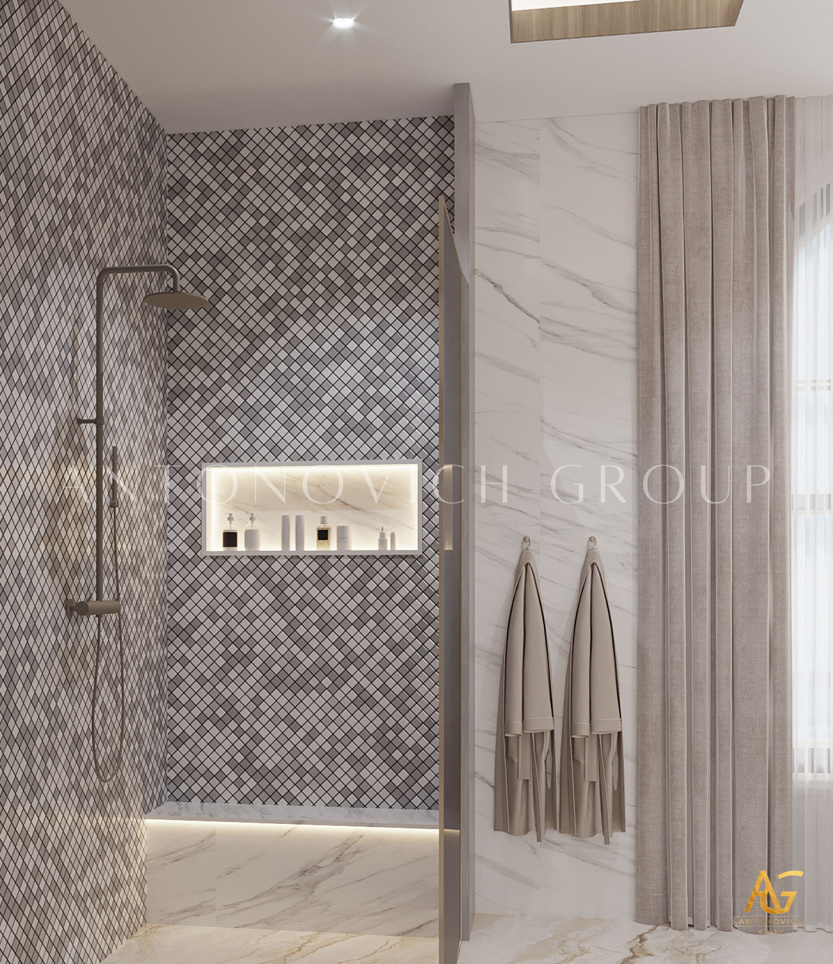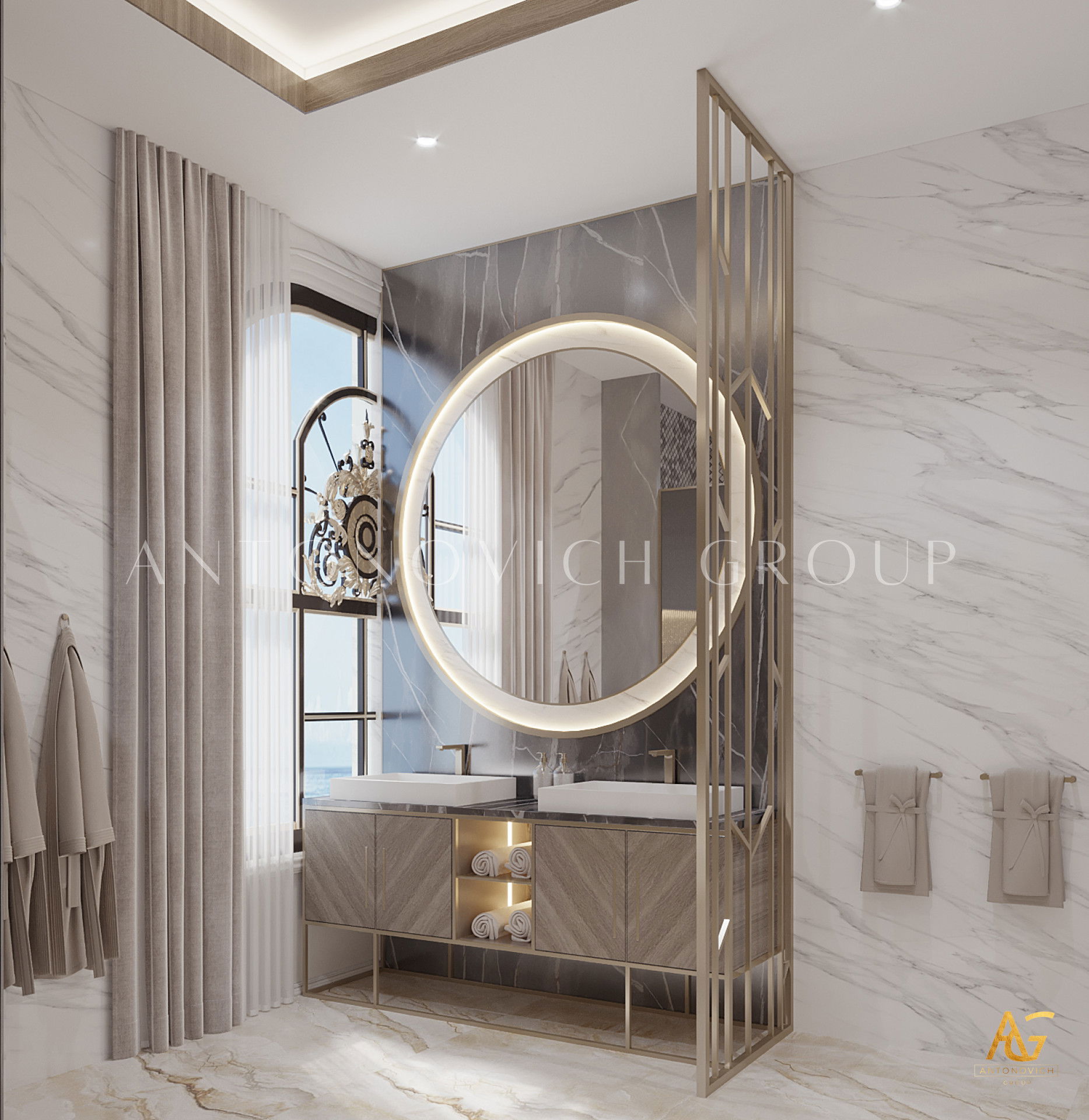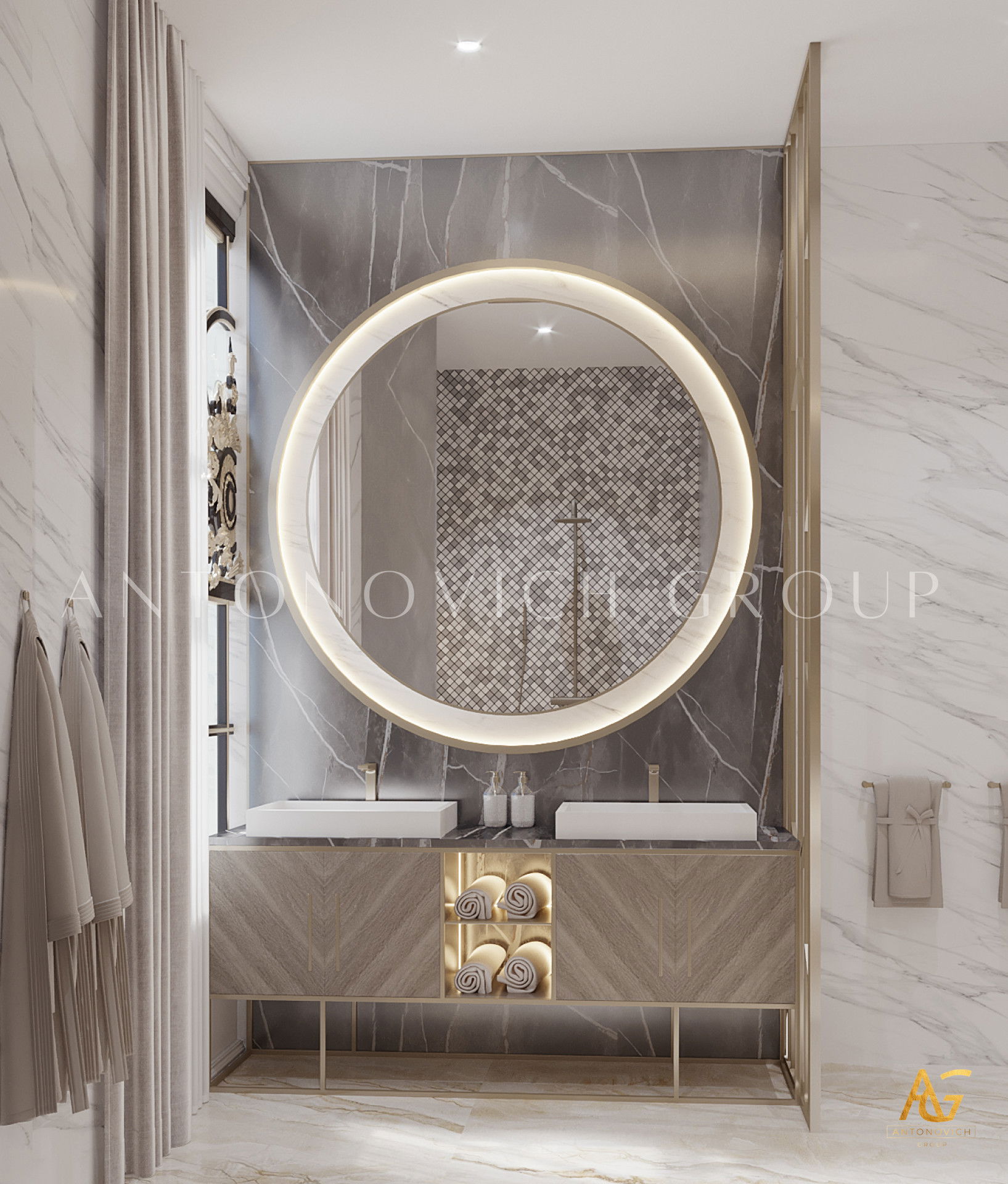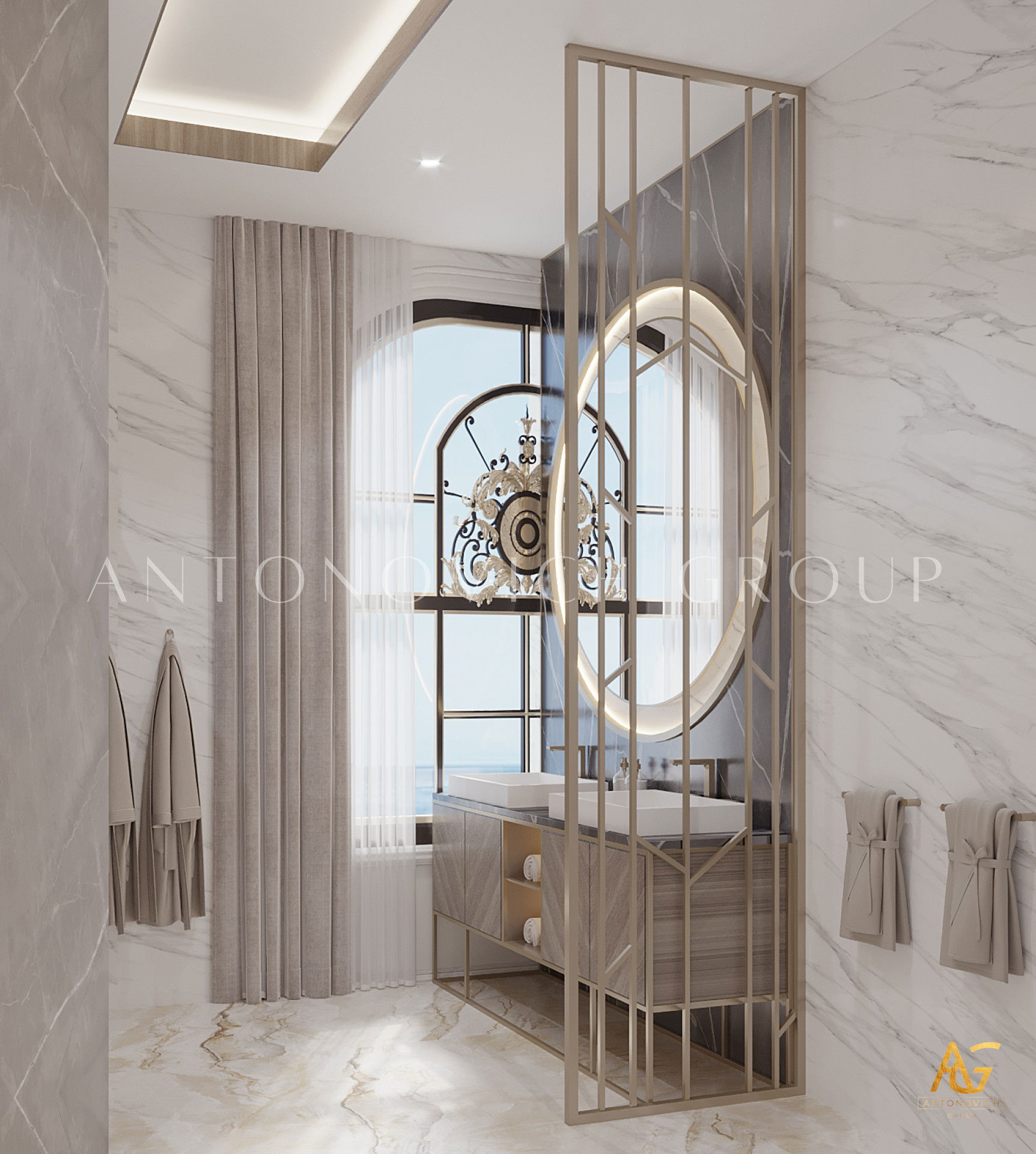 The villa design Abu Dhabi included the design and engineering of several bathrooms. Bright and luxurious character of the interior decoration admires the lush splendor. The bathroom design is full of spectacular decorative techniques that were offered by interior designers Abu Dhabi. Luxury mood inherent in every square meter. The ceiling is decorated with exquisite author chandelier with crystal pendants. The chandelier looks great surrounded by swirls of stucco decoration and additional lighting, which outlines a niche in the ceiling. Oval bath looks luxury, thanks to two graceful marble columns at the sides, which are topped with gilded stucco capitals. Marble tile on the floor is covered with a charming ornament which picks up the outlines of patterns on the shower.