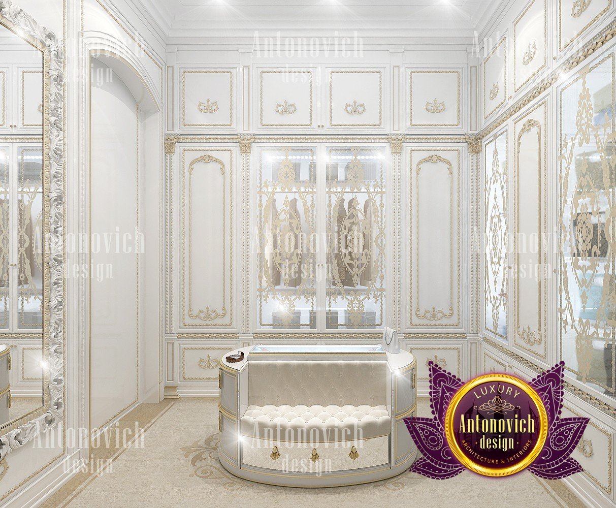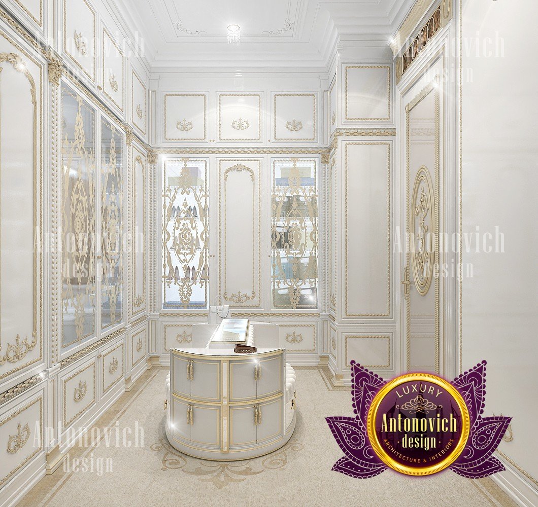 Charming dressing room is located in the attic room in Abu Dhabi. Interior designers masterfully arranged particular architectural layout of the room. Dressing room interior design is very clear and clearly speaks of gentle and refined character of its owner. Slope of the roof is decorated with plaster that gives pearly luster. The window is curtained with white silk. Creamy-pink range of shades in the dressing room interior sets the basis for the romantic mood of the interior. A soft fluffy carpet on the floor of wood looks cozy, warm and charming. Charming boudoir table is illuminated from the inside with soft blue backlight. Round mirror looks cute on a soft wall panel, which is upholstered with natural leather of pink color. Dressing room interior design combines luxury and functionality.