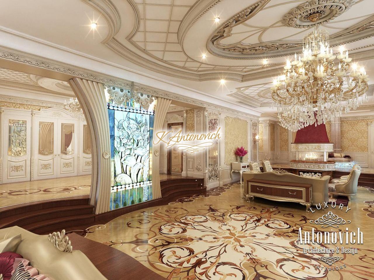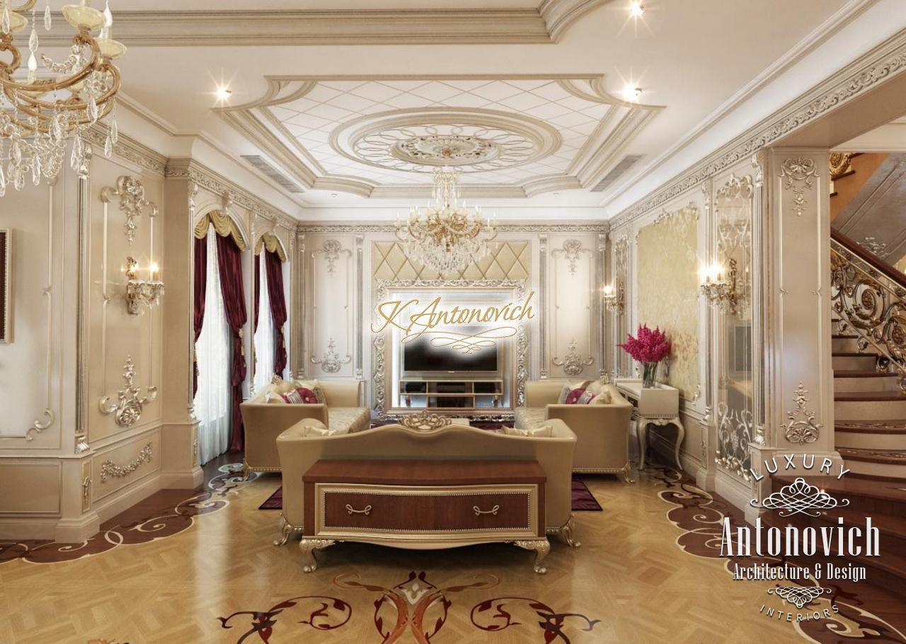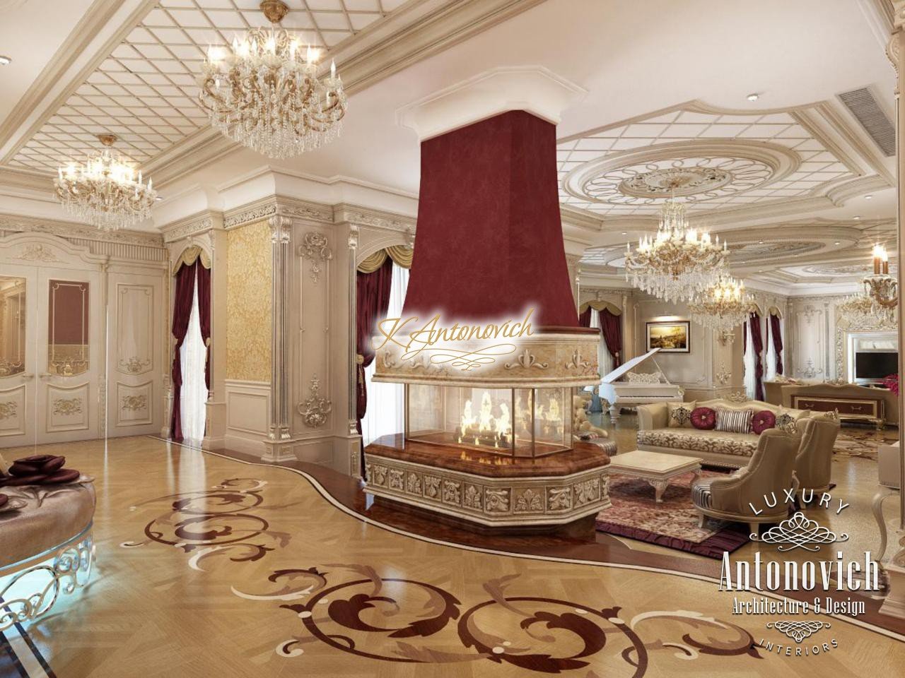 Living room design in neoclassical style is impressive with luxury and extraordinary character. And this impression is excellent from the very first moments of your stay in the house. Interior design Dubai by Luxury Antonovich Design offers its customers the author's projects, which are invariably characterized with unique design solutions. Living room design perfectly reflects the fine taste of home owners, their respectability and hospitality. Very comfortable interior with elegant accents has a wonderful festive mood. Interior Designers Dubai masterfully performed with the space on the first floor of the house. The living room is divided into two zones, as well as combined with a spacious hall. Interior designers Dubai decided to divide the space of the living room and hall via spectacular wall with elegant lines and LED lighting. The highlight of this unique design project of the living room became the floor of carved wood of valuable species with exquisite design. Interior Designers Dubai artfully intertwined ornament on the floor with patterns of carved stucco decoration on the ceiling. The interior design reflects how gorgeous and perfect harmony in the interior can be, thanks to the opportunities of new technologies. The living room design is a complex and multifaceted project, which reflects the luxurious interiors of the future. That wonderful feeling of warmth of the hearth, which is given to joy home owners, is provided with original fireplace. Flames can be enjoyed from almost anywhere in the room.