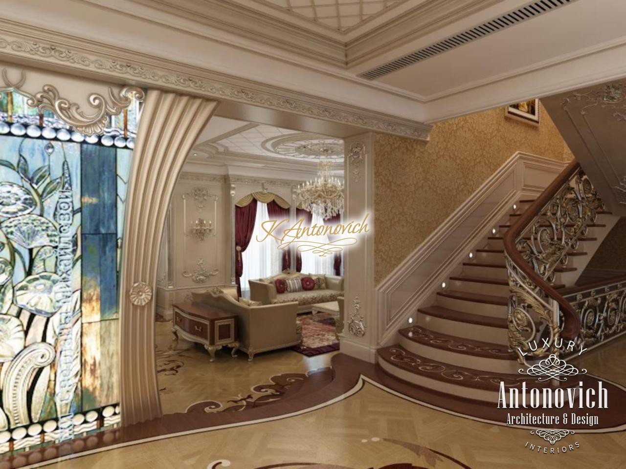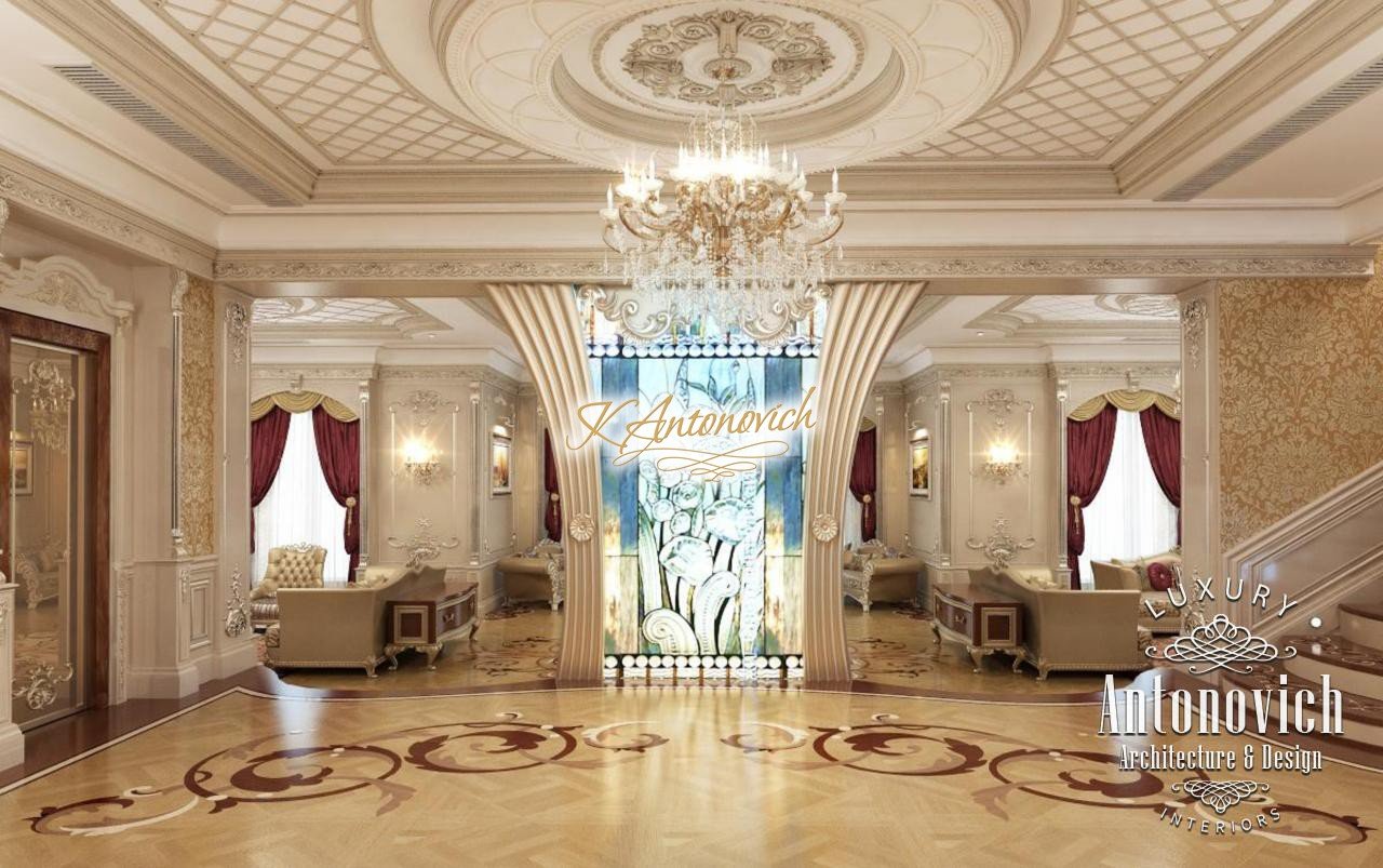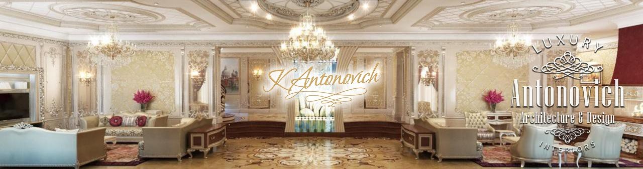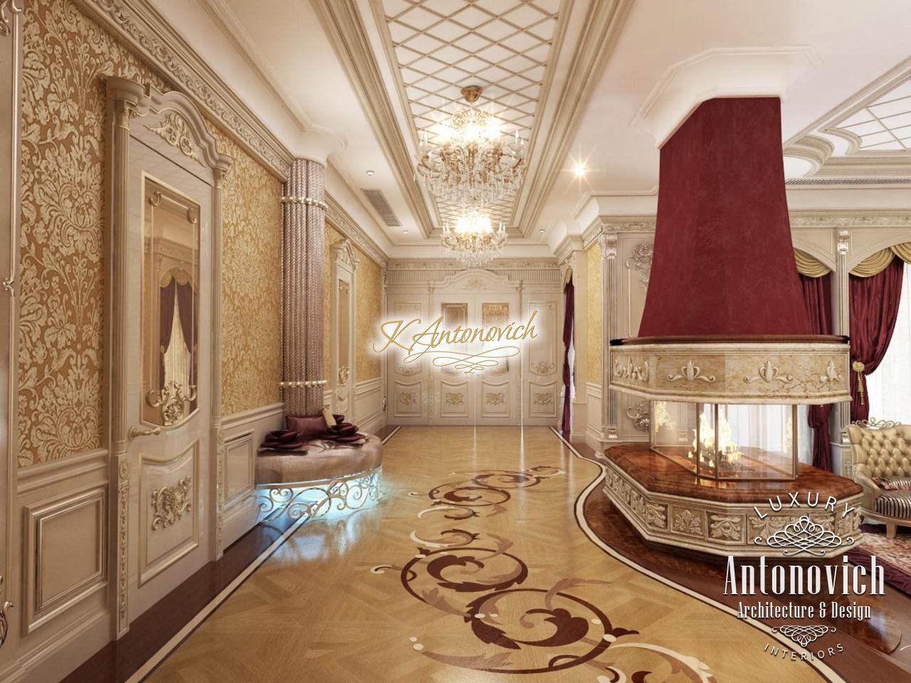 Living room design in neoclassical style is impressive with luxury and extraordinary character. And this impression is excellent from the very first moments of your stay in the house. Interior design Dubai by Luxury Antonovich Design offers its customers the author's projects, which are invariably characterized with unique design solutions. Living room design perfectly reflects the fine taste of home owners, their respectability and hospitality. Very comfortable interior with elegant accents has a wonderful festive mood. Interior Designers Dubai masterfully performed with the space on the first floor of the house. The living room is divided into two zones, as well as combined with a spacious hall. Interior designers Dubai decided to divide the space of the living room and hall via spectacular wall with elegant lines and LED lighting. The highlight of this unique design project of the living room became the floor of carved wood of valuable species with exquisite design. Interior Designers Dubai artfully intertwined ornament on the floor with patterns of carved stucco decoration on the ceiling. The interior design reflects how gorgeous and perfect harmony in the interior can be, thanks to the opportunities of new technologies. The living room design is a complex and multifaceted project, which reflects the luxurious interiors of the future. That wonderful feeling of warmth of the hearth, which is given to joy home owners, is provided with original fireplace. Flames can be enjoyed from almost anywhere in the room.