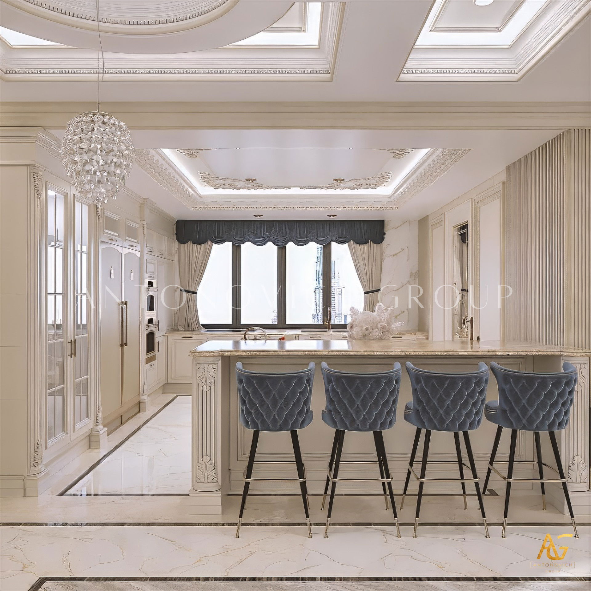 This integrated approach ensures that all aspects of the living room — from architectural elements to the smallest decorative details — are handled with creativity and precision. By managing both design and execution, Antonovich Group guarantees a flawless result that matches the client’s vision.