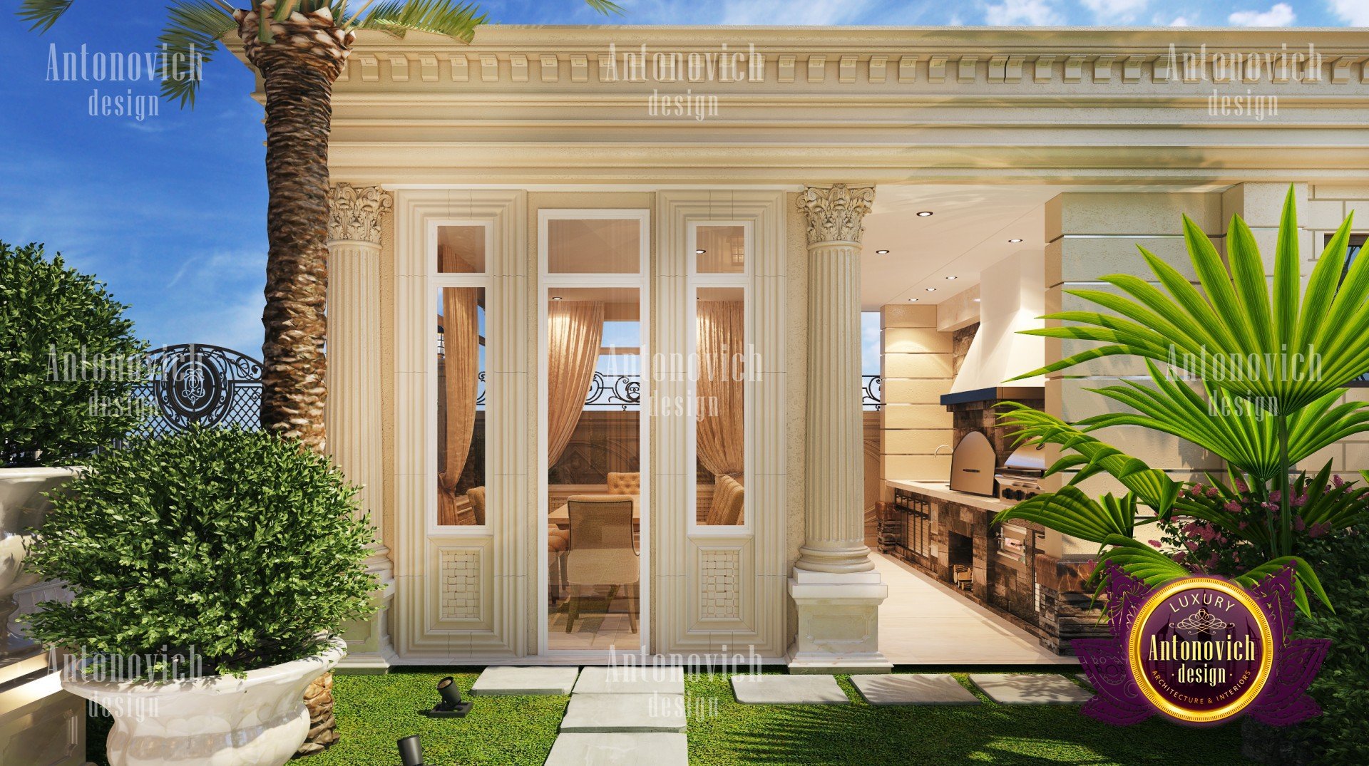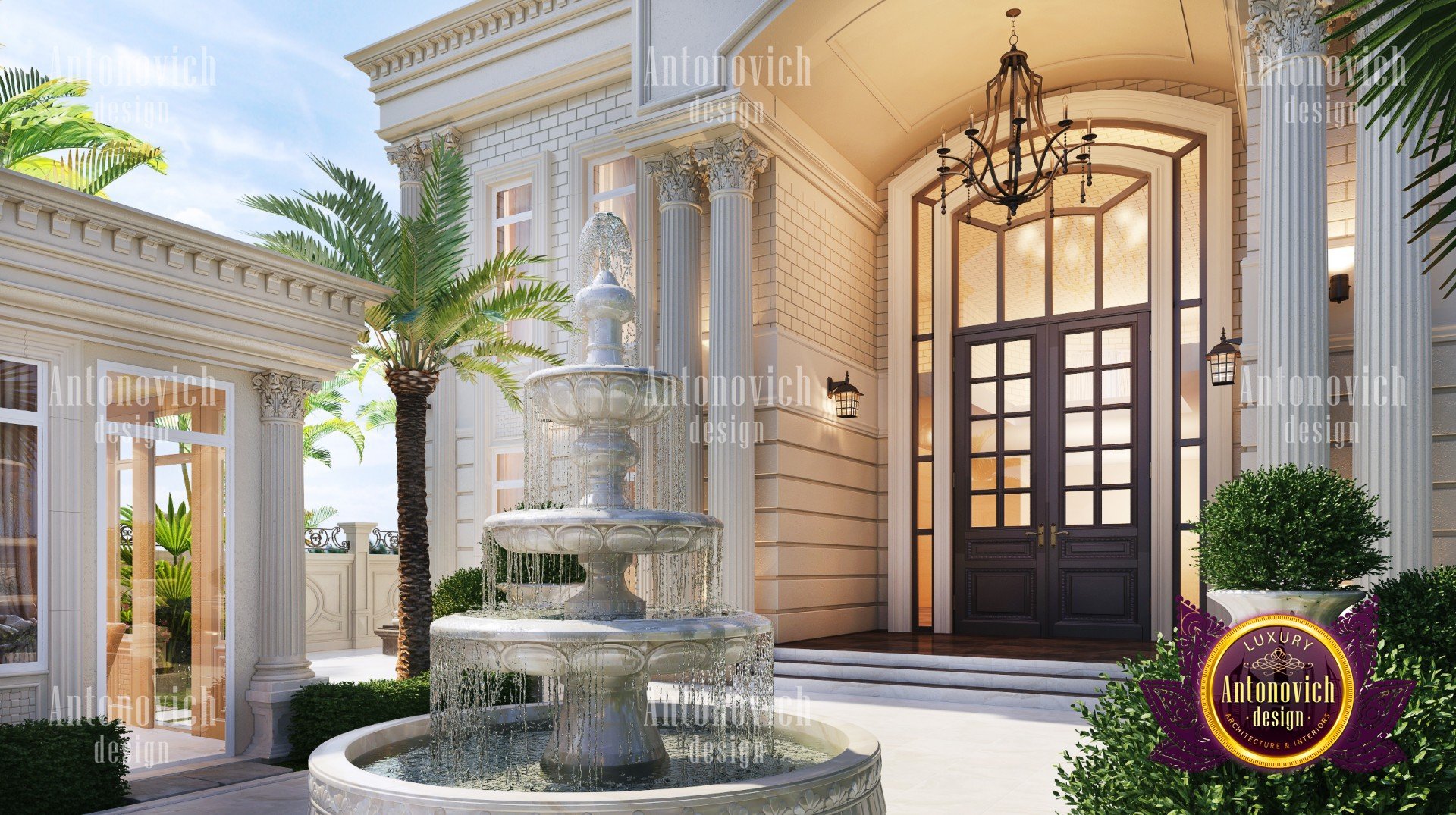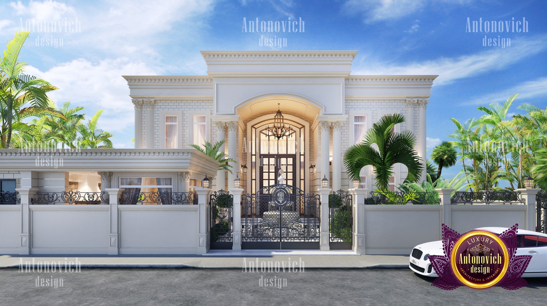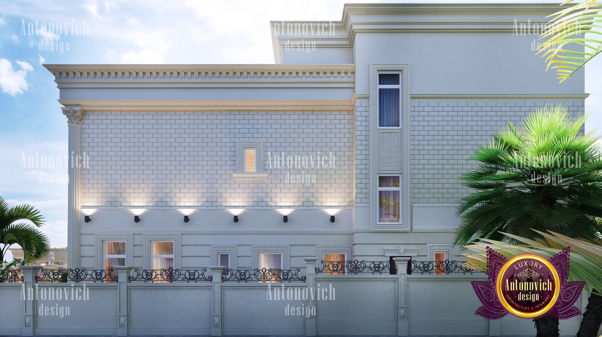 Expressive art images of exteriors that designers of the studio Luxury Antonovich design create, are impressive for their beauty and aesthetic perfection. This perfection is based on the harmonious composition structure of the building, which are connected with the correct proportions and scale of the building. The dimensions of individual parts of the house, their ratio to the whole extent of dissection or generalization of architectural form and detailing the nature and plastics are given to a single variety of beautiful forms. In his works, Design Studio Dubai builds on dreams and wishes of customers. This client becomes the measure of all ideas and solutions. All these solutions are the basis for expression of the building. The design of the exterior as well as interior design takes into account the traditions and modern technology. Round mnogoskatnaya roof darker, as if holding the flight from light and graceful buildings. The exterior design houses - is a work of art, which employ talented designers, architects and sculptors. The entrance portal of the building is decorated with five majestic columns with stucco capitals and marble staircase. Exterior design house also closely related to interior design. High windows of the central portal of the building are the basis for a bright and light interior room, letting in a sufficient amount of daylight. On the facade bas luxurious look and exquisite sculptures. It gives the image of the exterior of the building special pomp and enhances the beautiful game of light and shade of the facade.