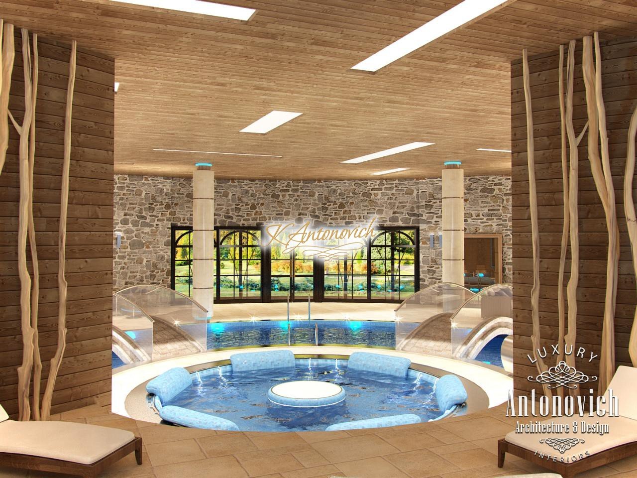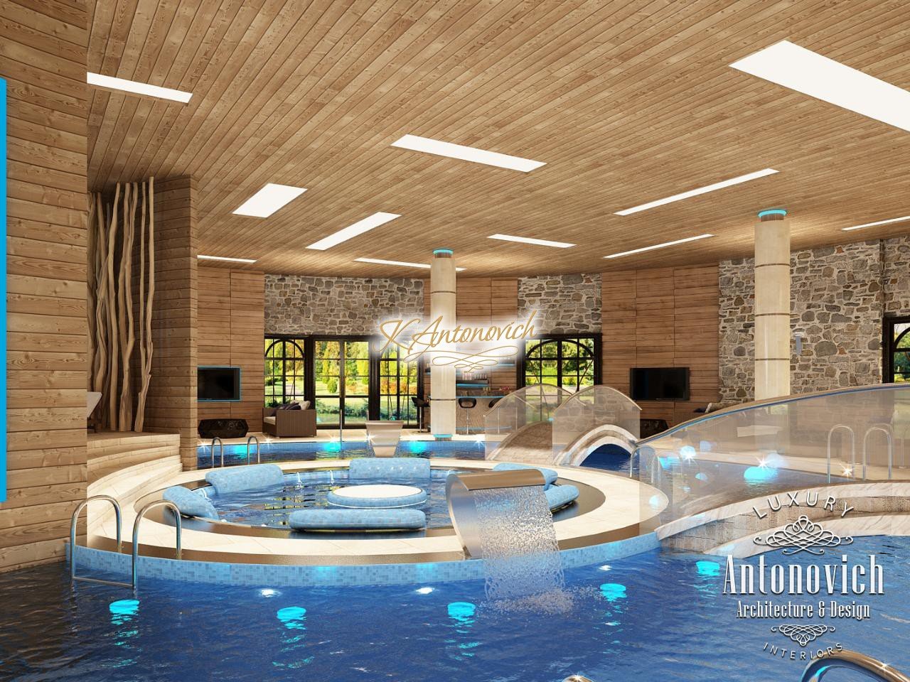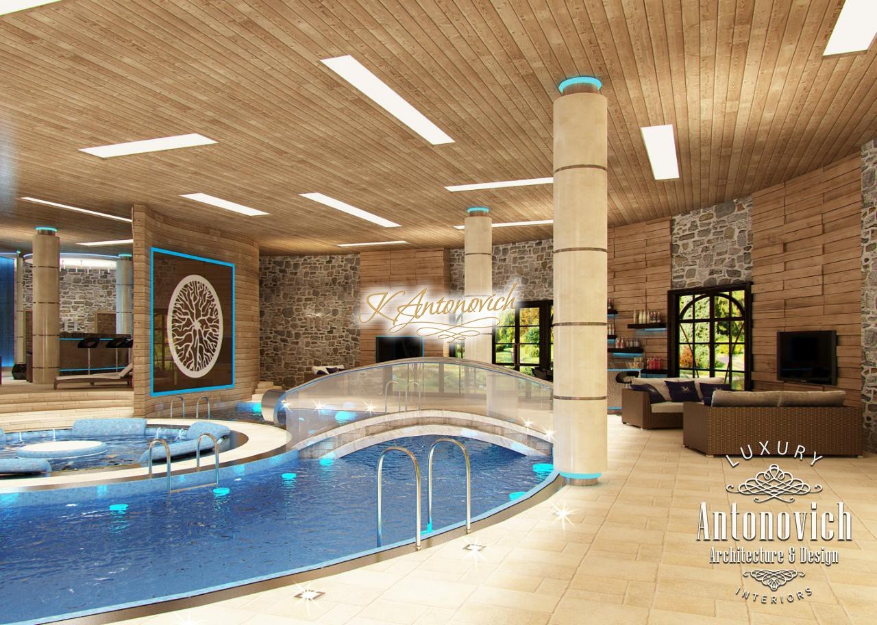 House project Dubai reflects the wishes of the home owners about absolute comfort and warmth of home comfort. Pool design was one of the important parts of the architectural design of the house. For a large swimming pool with sauna it was designed detached building with large windows and a terrace, which is associated with the transition of the main building. Interior Designers Dubai designed the pool that reflects the warmth of nature. It is a pleasant feeling of warmth based on the use of impregnated wood in the walls and ceiling design. The decoration of the walls along with natural wood decor look great in the form of natural stone setting. Bowl of the pool is an original design with a round Jacuzzi pool in the middle. Small arched bridge was the highlight of the pool project.