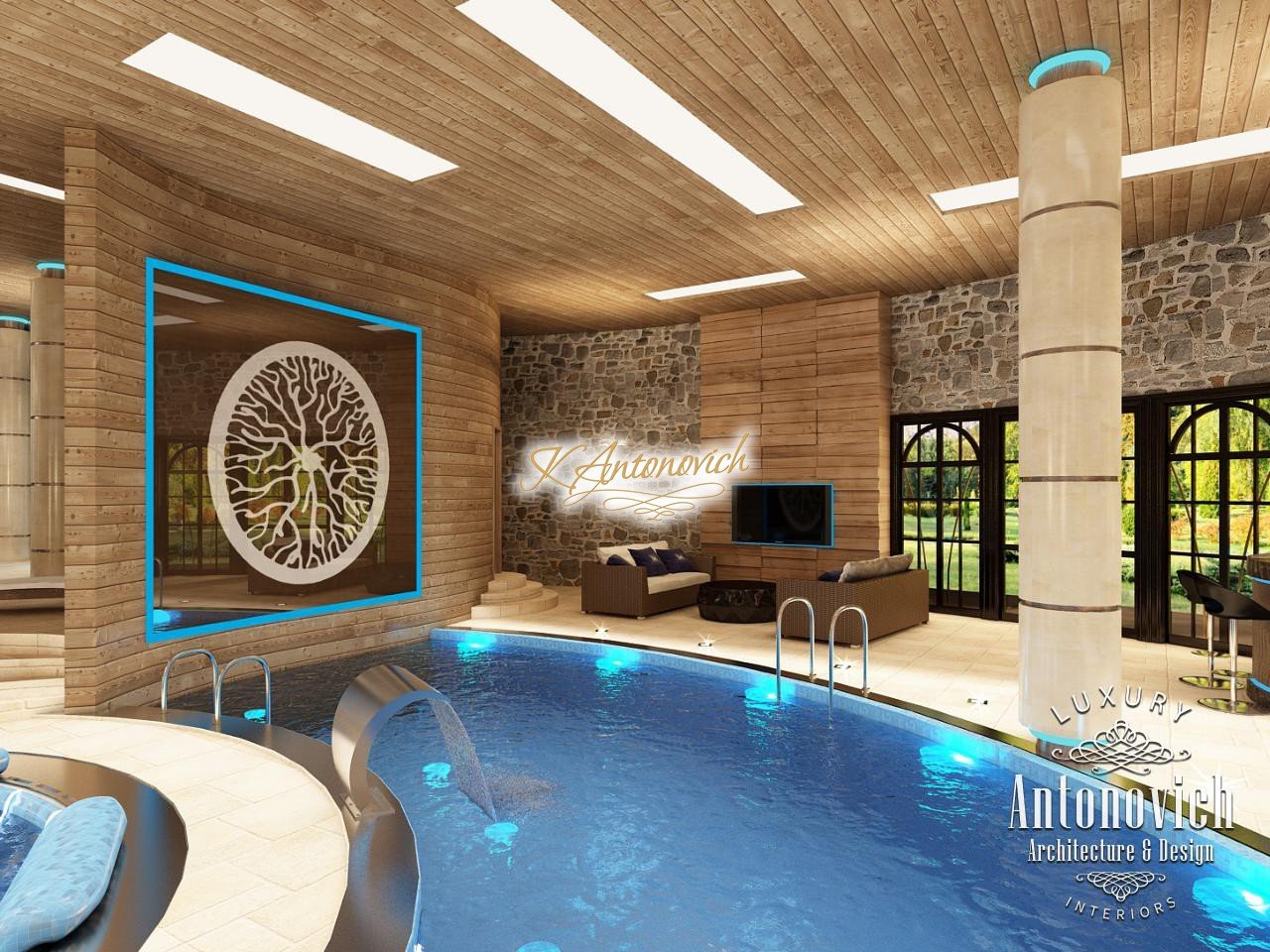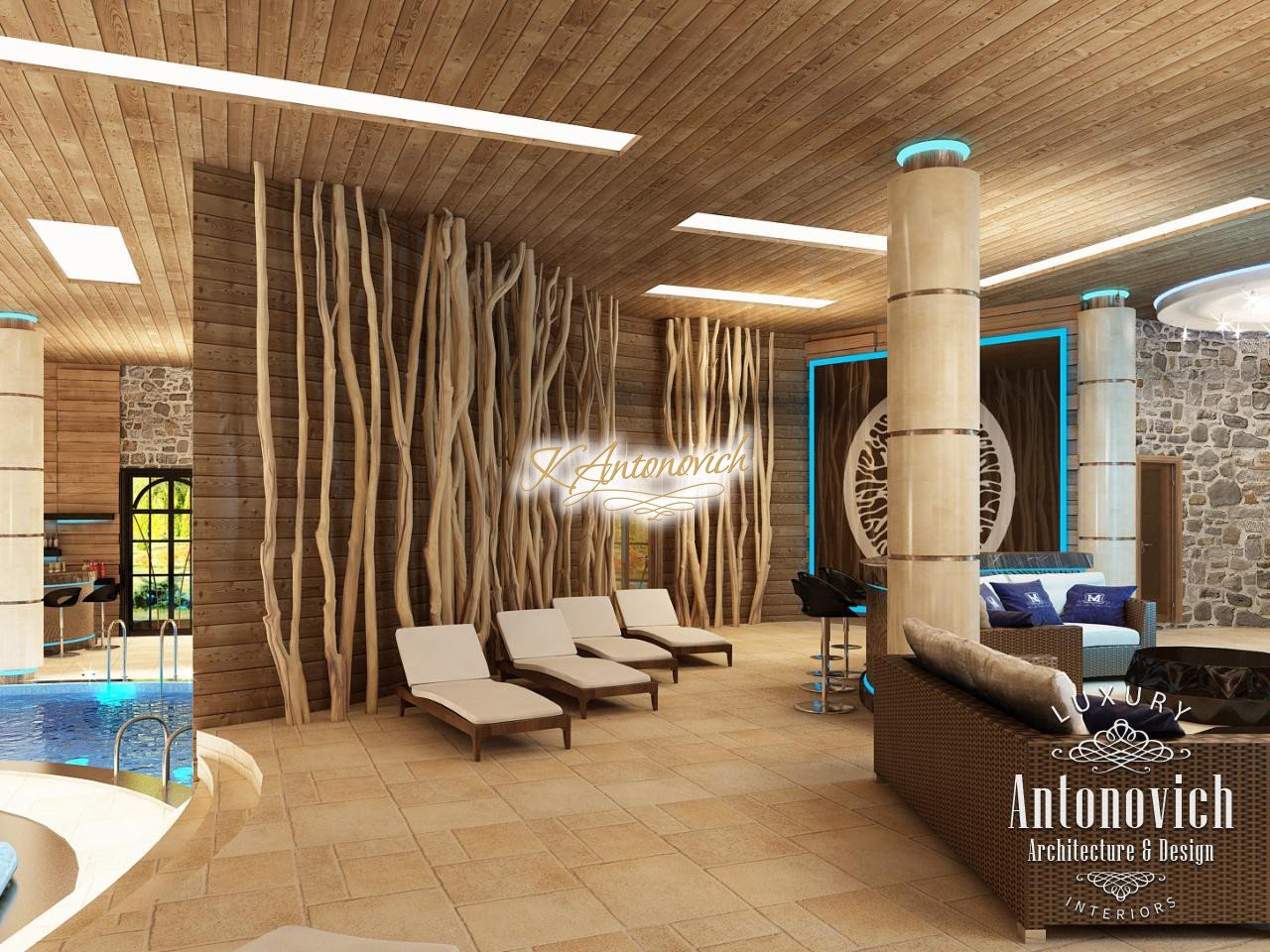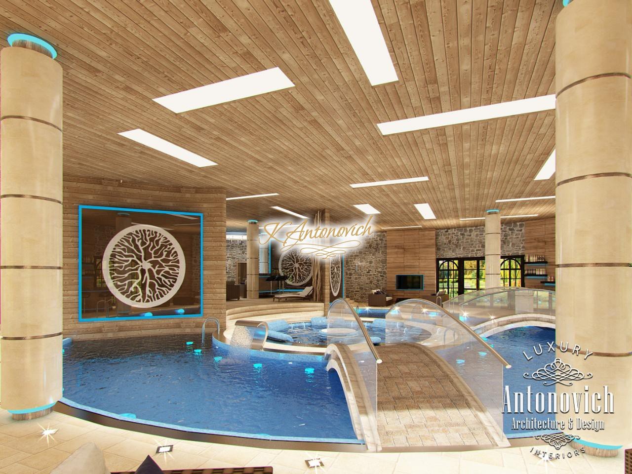 House project Dubai reflects the wishes of the home owners about absolute comfort and warmth of home comfort. Pool design was one of the important parts of the architectural design of the house. For a large swimming pool with sauna it was designed detached building with large windows and a terrace, which is associated with the transition of the main building. Interior Designers Dubai designed the pool that reflects the warmth of nature. It is a pleasant feeling of warmth based on the use of impregnated wood in the walls and ceiling design. The decoration of the walls along with natural wood decor look great in the form of natural stone setting. Bowl of the pool is an original design with a round Jacuzzi pool in the middle. Small arched bridge was the highlight of the pool project.