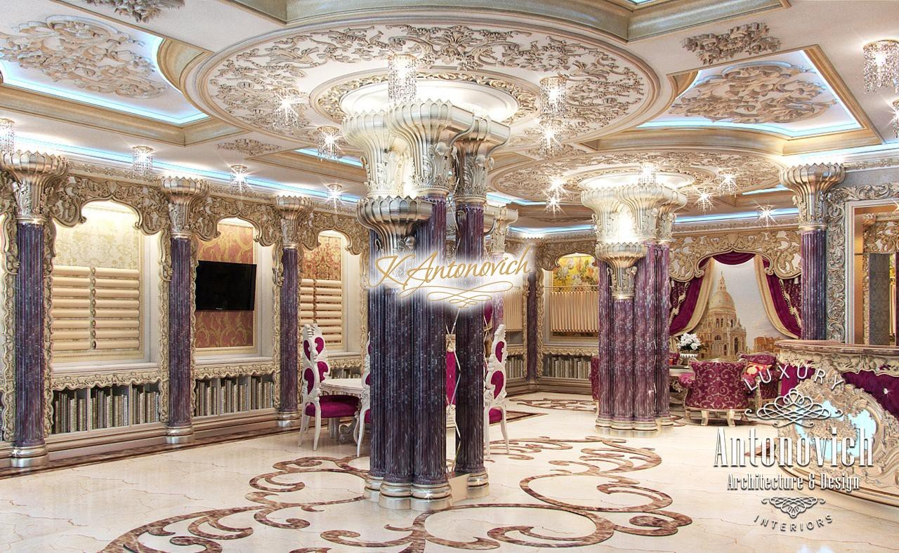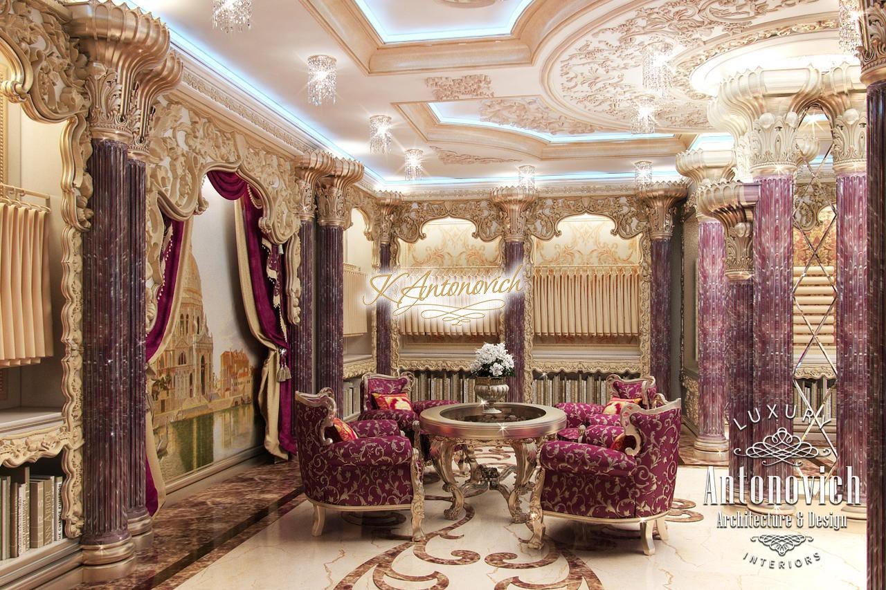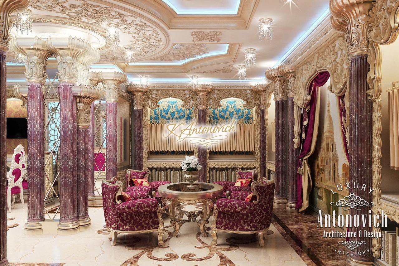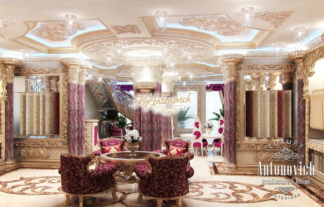 For the most demanding connoisseurs of the world of luxury, for those who can afford the best, talented interior designers from Dubai Studio Luxury Antonovich Design create unique beauty projects. This delightful interior was designed for salon selling luxury wallpaper. Interior Design Abu Dhabi perfectly reflected the wishes of all customers about a cozy and festive interior. In this place, each buyer will feel worthy and comfortable. Surrounded by luxury, on the comfortable furniture you can slowly choose what you really like. The salon interior itself sets a wonderful moments of important purchase. Interior Designers Abu Dhabi in noble classics added trim accents. High ceilings decorated with lush curls of stucco decoration. Luxury reception is decorated with textile panel of juicy pink hue. Exquisite carved decoration and soft blue lights give this part of the interior delightful expressiveness. To demark the elite collections of wallpaper from top brands visually graceful pink marble half-columns with exquisite gilt capitals help. Luxury column helps to zone showroom space, dividing it into several zones. With all its pomp luxurious interior of the salon for the sale of luxury wallpaper looks homely. In the recreation area and negotiating area interior is decorated with luxurious furniture. In the walls decor bright accent became a romantic art painting with exquisite curtains of velvet ruby and golden hue.