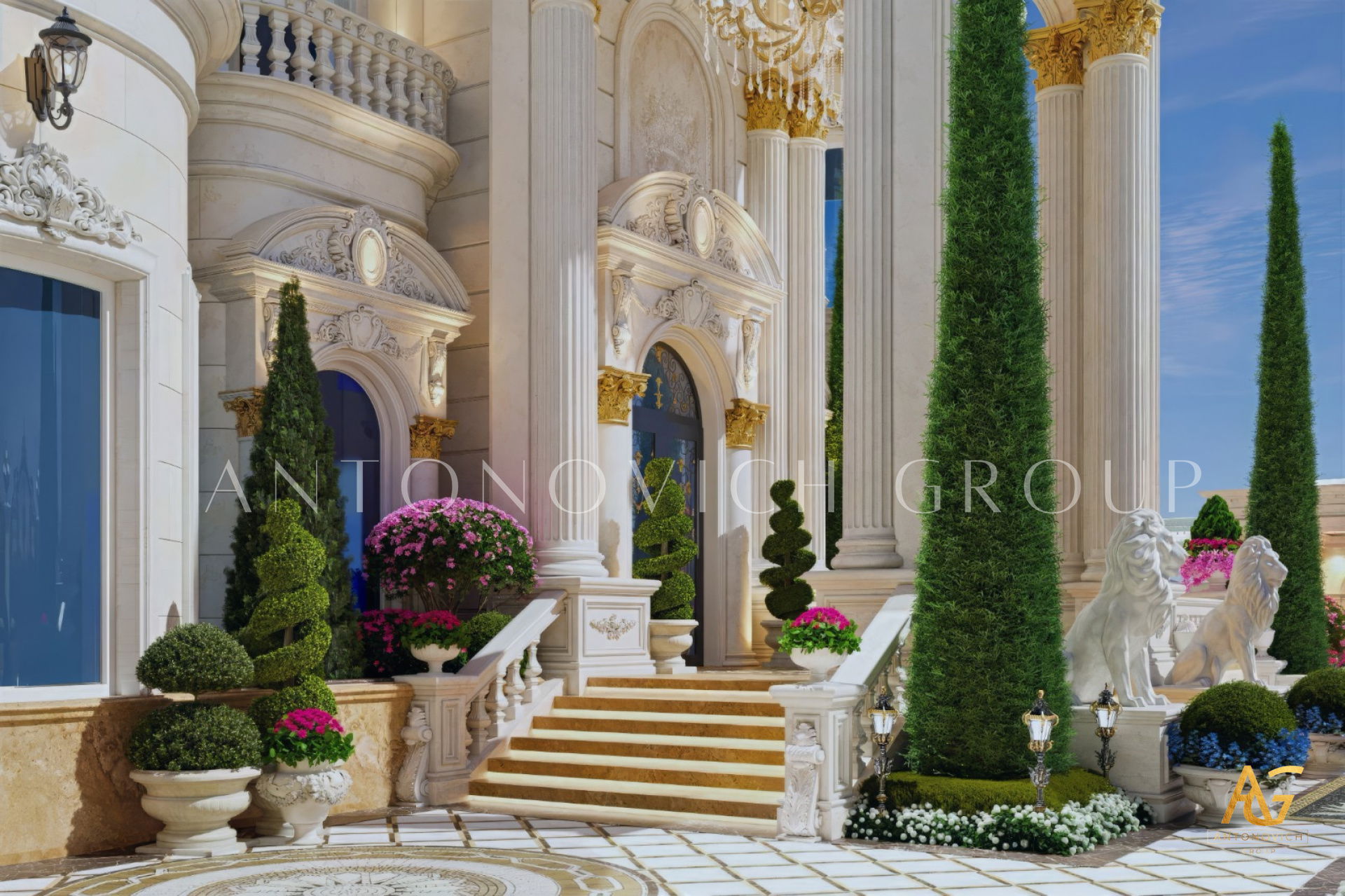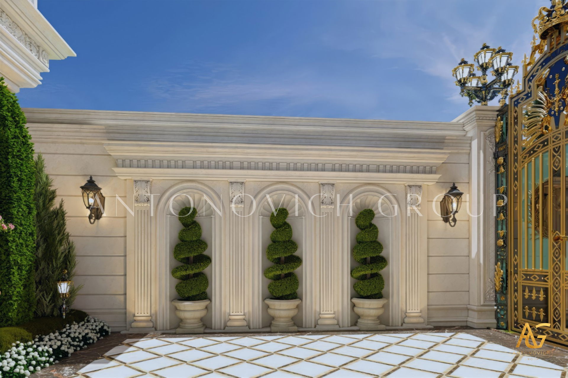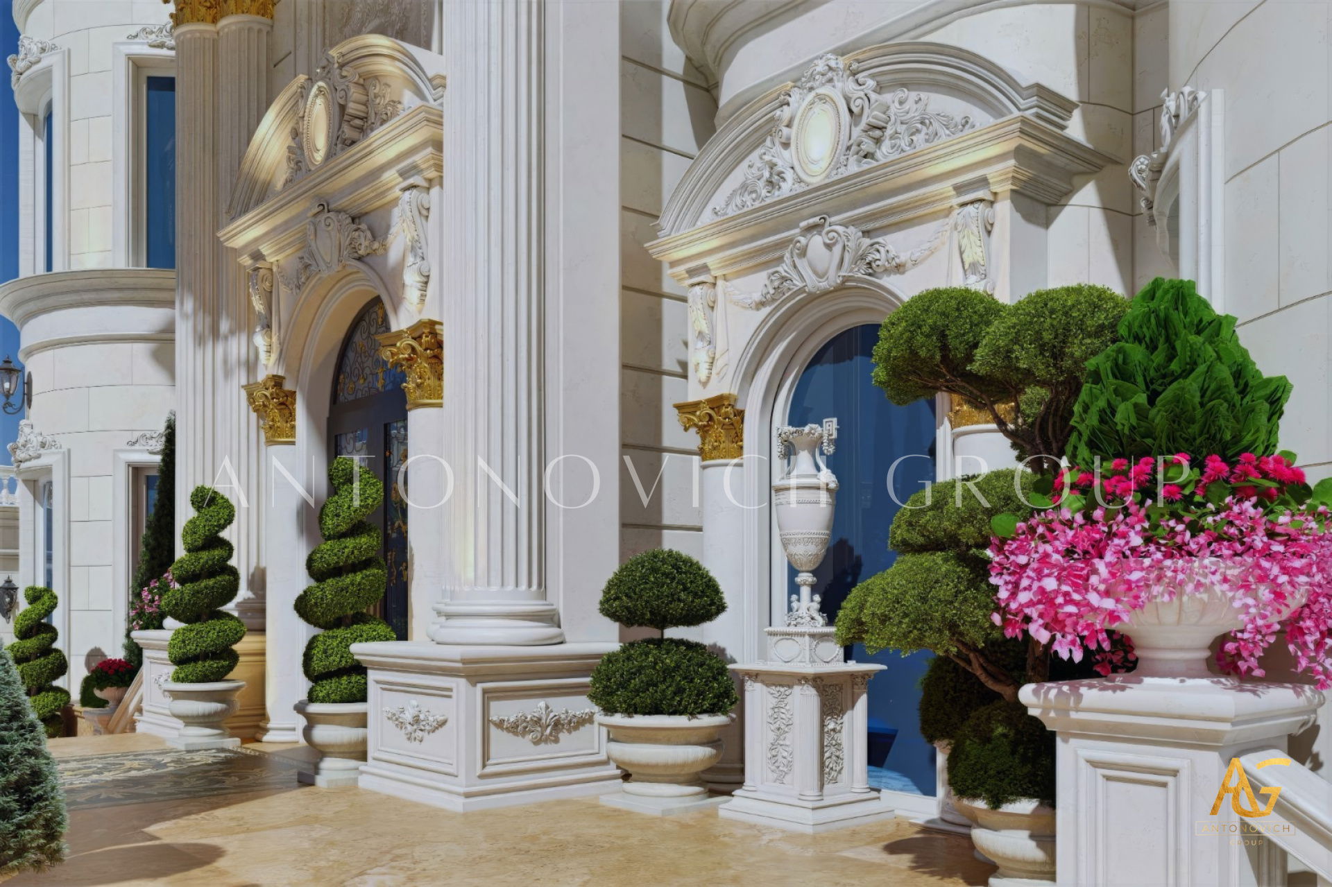 A luxury house façade is defined by its architectural composition. Antonovich Group pays meticulous attention to proportions, alignment, and visual rhythm. Entrances are designed as focal points, often enhanced with grand doors, sculptural elements, or refined canopy structures.