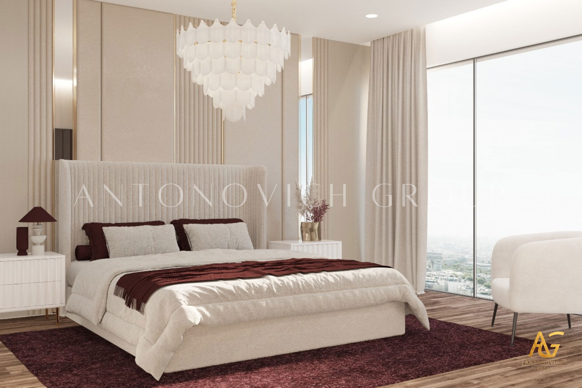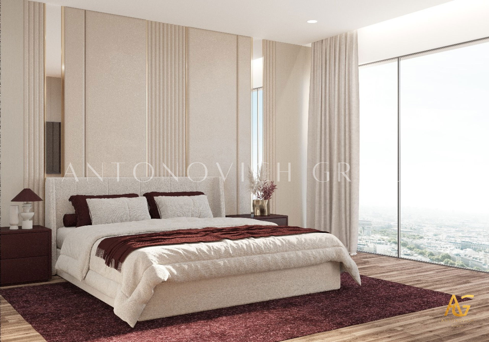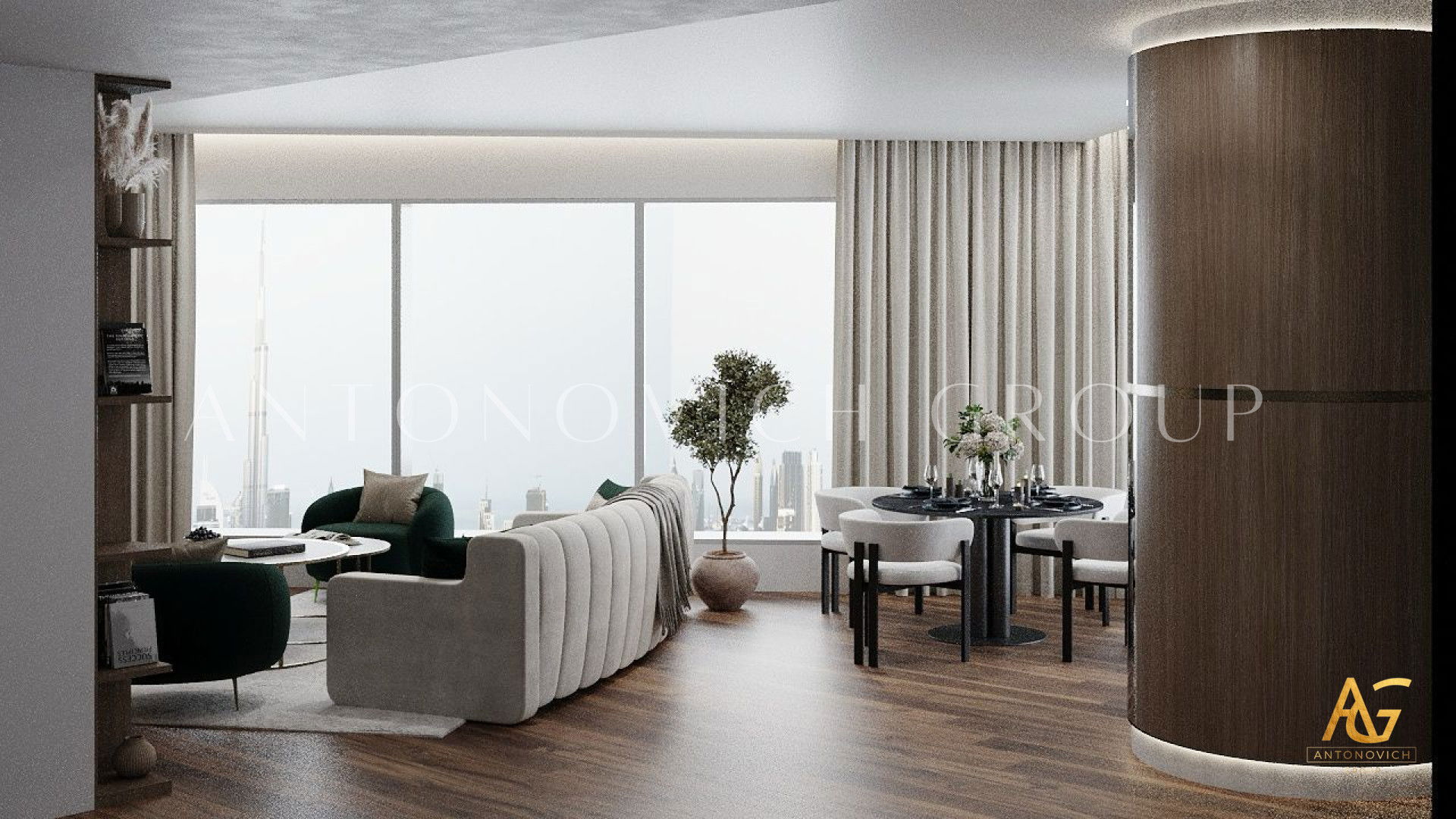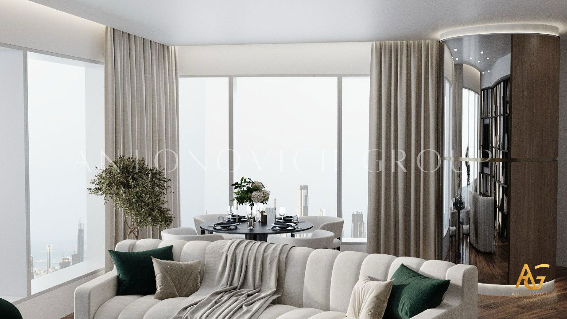 Each member of a large and happy family is a person with a bright and extraordinary personality. And interior designers UAE beautifully reflected this uniqueness and originality in the authors apartment project. The most striking and eye-catching is a living room interior. Luxurious upholstered furniture of noble velvet in burgundy hue contributes to this. Apartment design as a whole is made in the best traditions of modern classics. As befits a modern stylish interior, a living room and dining area are a single space. The cozy dining area with a large dining table surrounded by padded chairs with noble backs is located at a large window. The dark velvet upholstery contrasts stylishly with a warm shade of beige silk in windows decoration. Apartment interior design is full of elegant and bright accents. So kitchen design has a bright and stylish character. Against the background of laconic kitchen furniture facades high upholstered chairs look luxury and catchy. Interior designers have paid special attention to childrens room design for two daughters of the homeowners. Childrens room design perfectly contributes to the harmonious development of children and education of their sense of beauty. In a pleasant pastel shades of childrens room interior decorative painting on the wall behind headboards looks luxurious. Bedrooms interiors are in a style of Art Deco, with its bright and elegant character. Mirrored panels, canopies, soft wall panels and silk wallpaper. All these are bright accents of luxurious apartment interior.