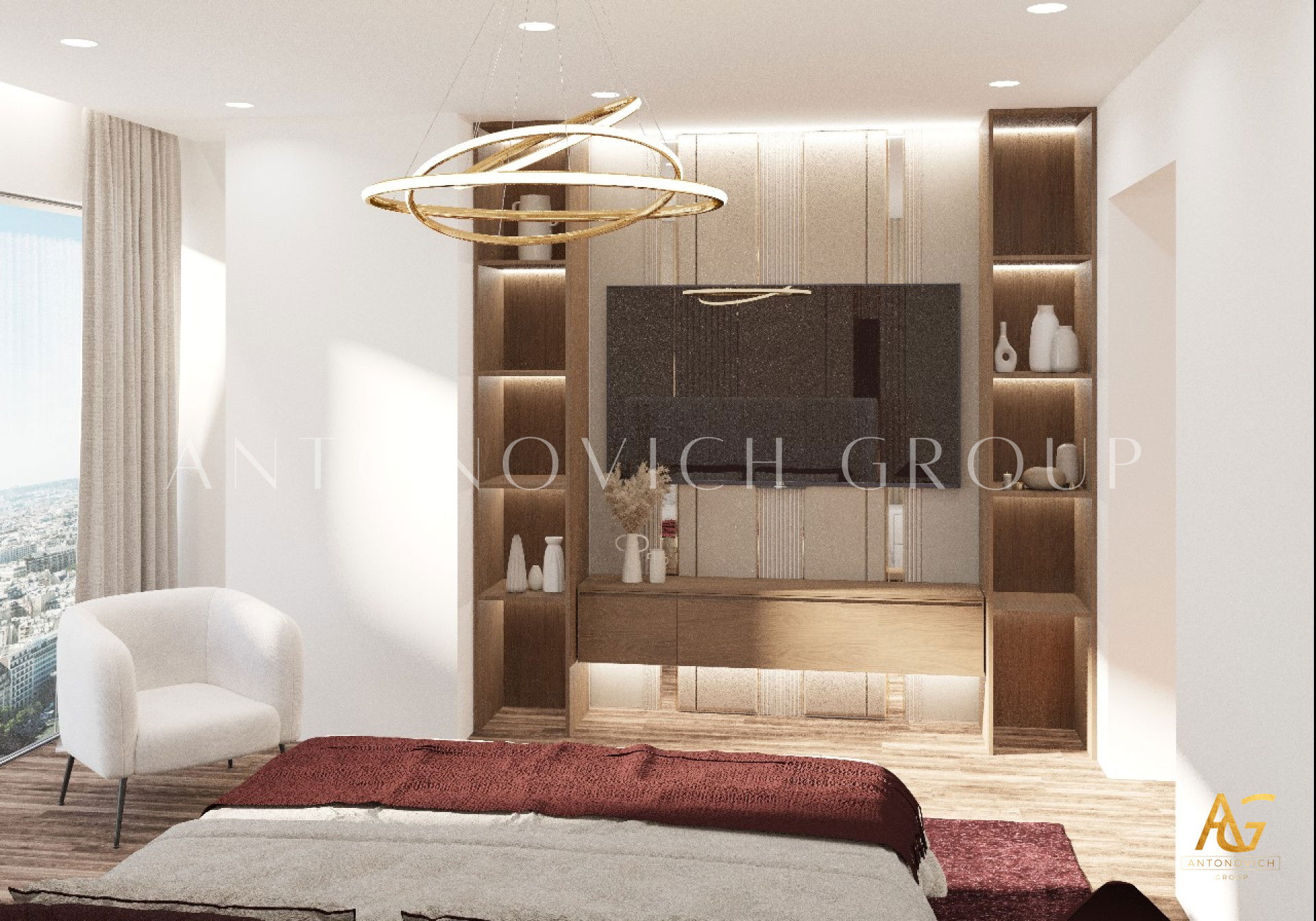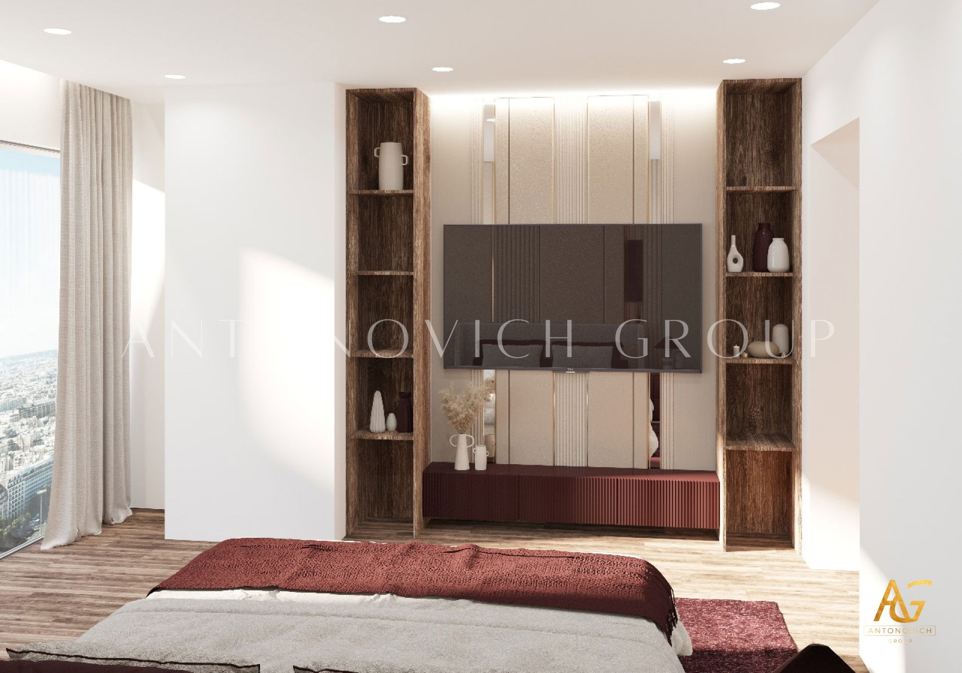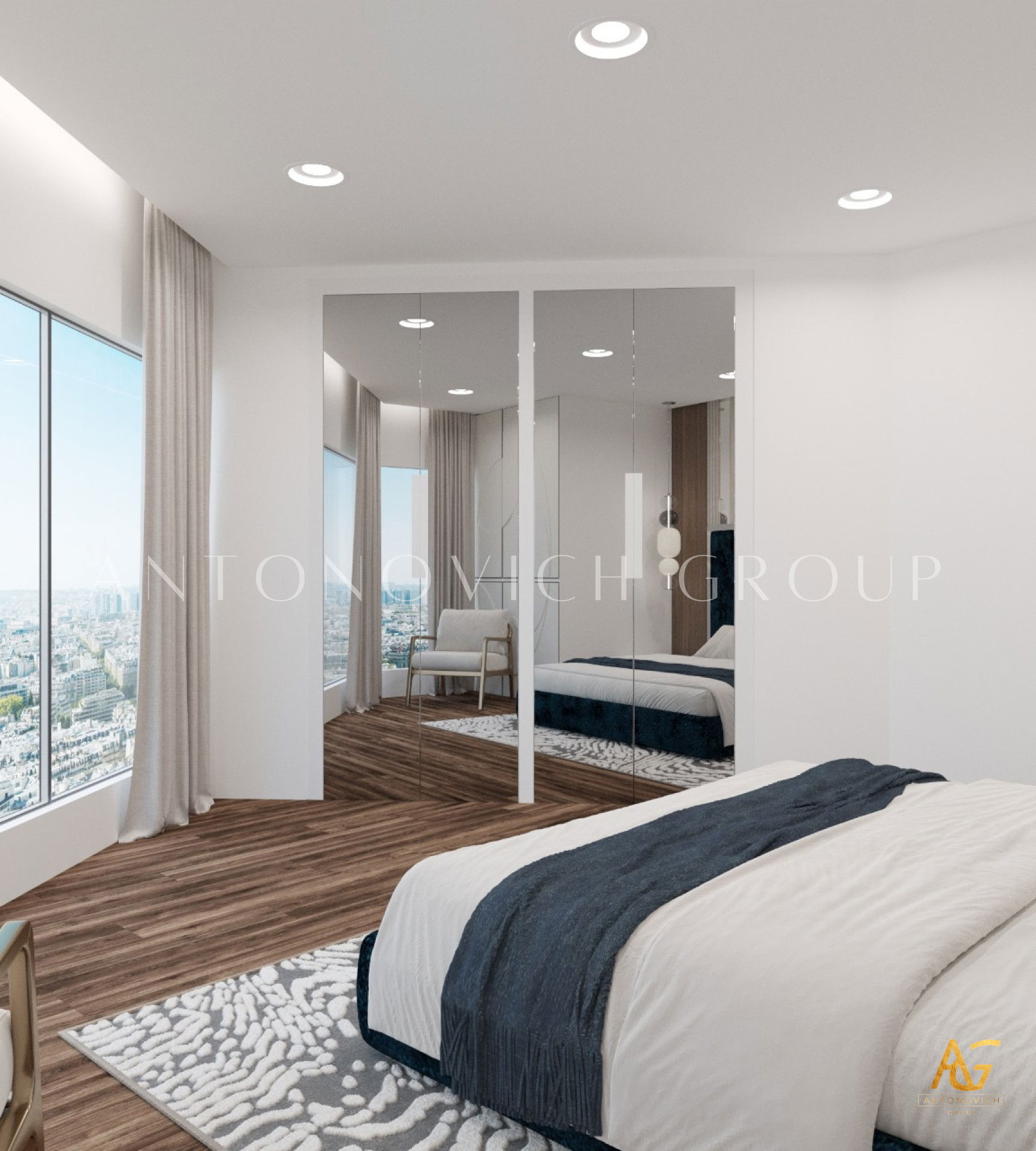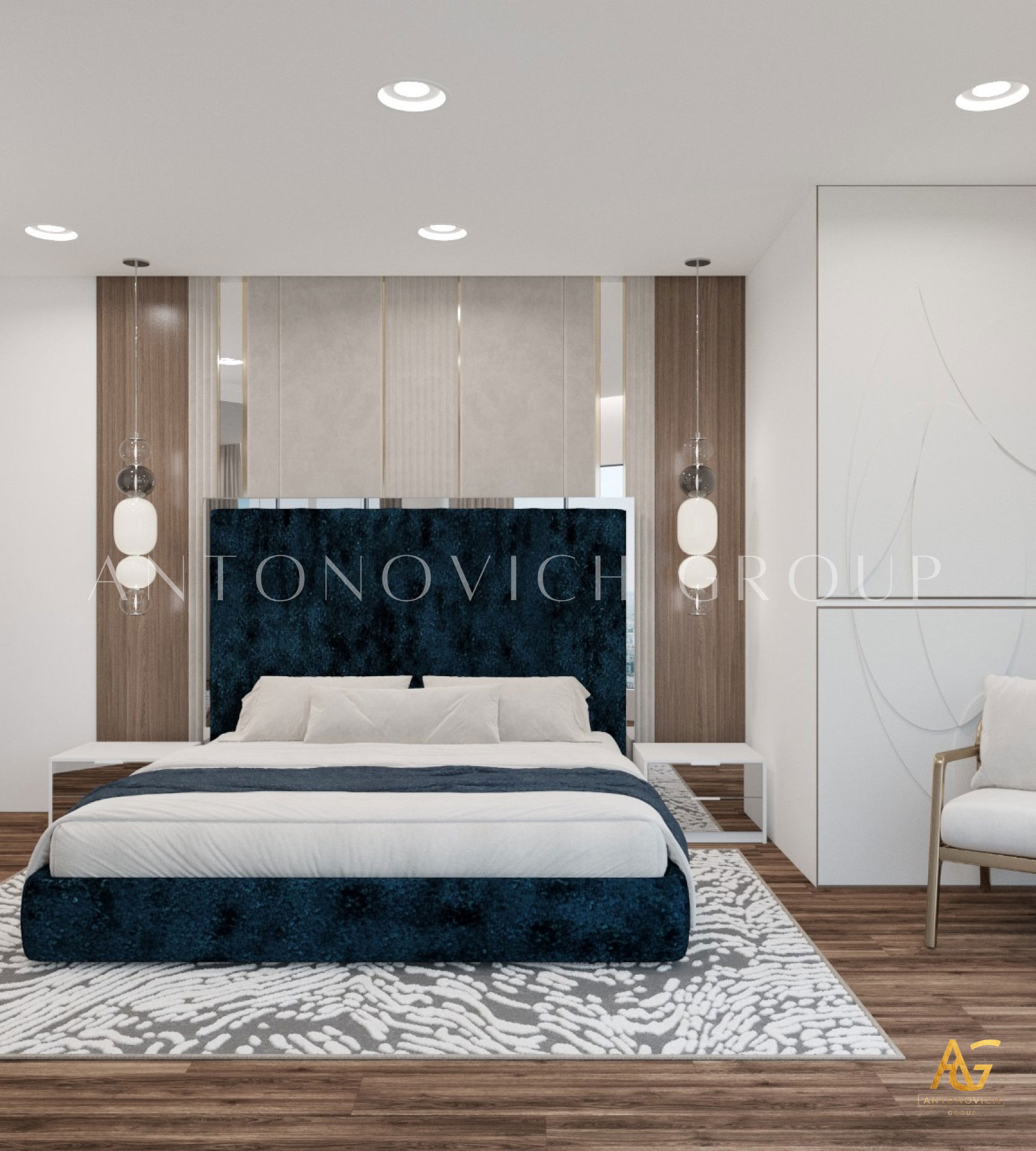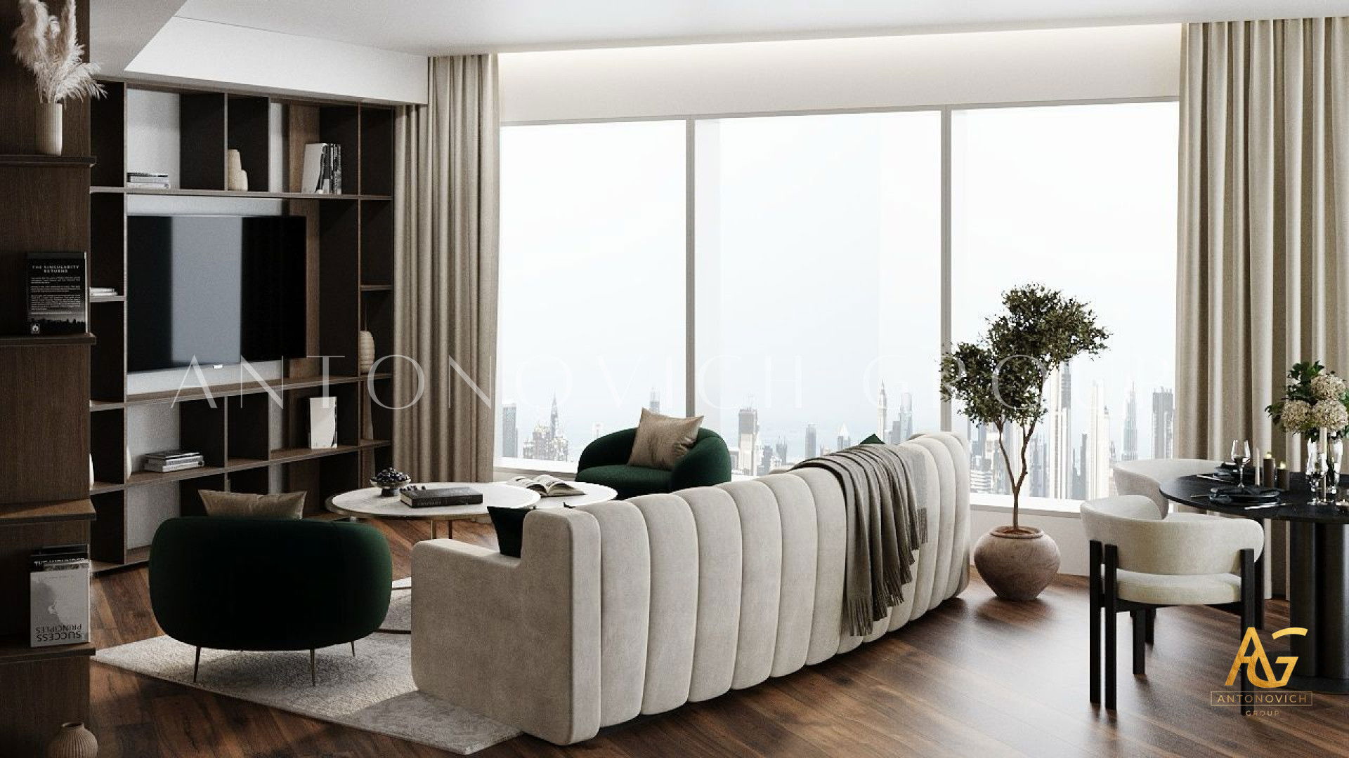 Each member of a large and happy family is a person with a bright and extraordinary personality. And interior designers UAE beautifully reflected this uniqueness and originality in the authors apartment project. The most striking and eye-catching is a living room interior. Luxurious upholstered furniture of noble velvet in burgundy hue contributes to this. Apartment design as a whole is made in the best traditions of modern classics. As befits a modern stylish interior, a living room and dining area are a single space. The cozy dining area with a large dining table surrounded by padded chairs with noble backs is located at a large window. The dark velvet upholstery contrasts stylishly with a warm shade of beige silk in windows decoration. Apartment interior design is full of elegant and bright accents. So kitchen design has a bright and stylish character. Against the background of laconic kitchen furniture facades high upholstered chairs look luxury and catchy. Interior designers have paid special attention to childrens room design for two daughters of the homeowners. Childrens room design perfectly contributes to the harmonious development of children and education of their sense of beauty. In a pleasant pastel shades of childrens room interior decorative painting on the wall behind headboards looks luxurious. Bedrooms interiors are in a style of Art Deco, with its bright and elegant character. Mirrored panels, canopies, soft wall panels and silk wallpaper. All these are bright accents of luxurious apartment interior.
