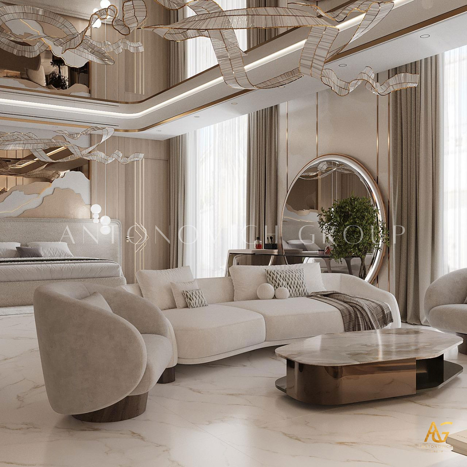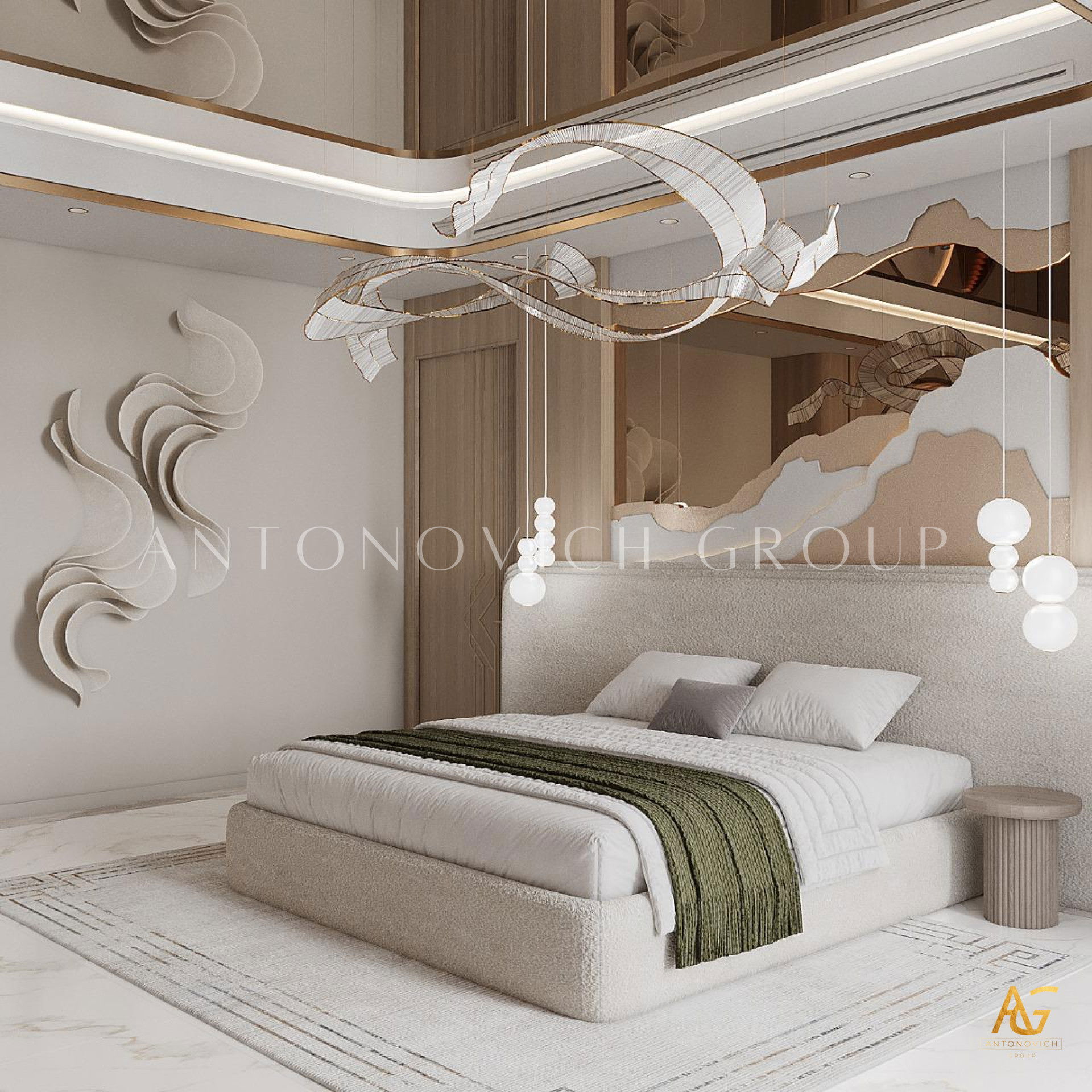 Bedroom Interior design is in a contemporary style. Harmony and cozy laconism inherent in the concept of interior design continues in the rest of the apartment. The interior bedroom is dominated by pleasant beige shades. Interior Designers Dubai perfectly organized space and highlighted the benefits of the architectural plan. Bedroom design combines the warmth of home comfort and a wonderful atmosphere for a relaxing stay at the luxurious surroundings. Interior design in a modern style best reflects how wonderful influence of modern technology on interiors is. New materials and new lighting techniques in conjunction with the author's ingenious design ideas become the basis for each new project and its bright individual image. The bedroom interior design radiates a pleasant warmth of nature. Wonderful natural wood of valuable species contributes to it, that designers use in the decoration of walls and floors. To emphasize the fact that in the bedroom interior a major role is played with a comfortable bed, interior designers Dubai make other furnishings as a wonderful addition of the bed. Functionality of the interior is added with a large sliding door wardrobe, which, thanks to the smooth glossy façade literally dissolves in the space of the cozy bedroom. High soft headboard, as if gently hugs its contours and visually keeps exquisite bedside tables with elegant sconces. In the wall decor interior designers Dubai use glossy panel of milk chocolate color, which complements the cozy mood of the bedroom interior.