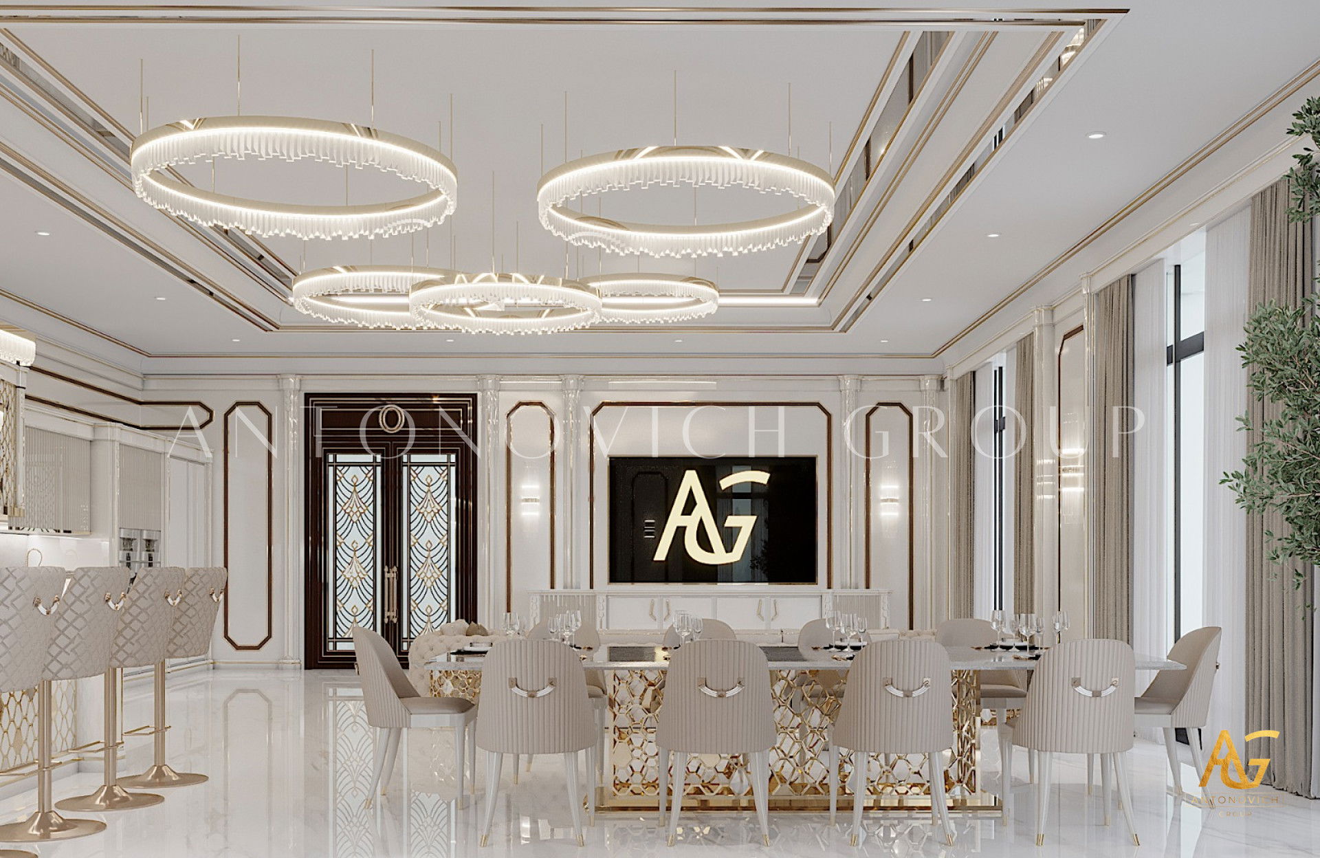Villa interior design in Dubai reflects how boundless talent and a flight of imagination of designers from Luxury Antonovich Design is. Each style in their luxury interiors gets own special character. Villa design in Dubai is in a contemporary style. There is an amazing combination of warmth of home comfort, luxury and laconism. Kitchen interior design become a harmonious continuation of the interior design of the living room and dining room. Dining area conventionally separates the living room and kitchen area. House Design Dubai largely emphasizes the warmth and hospitality of the owners of the house. In the dining area there is a large dining table surrounded by many soft chairs with original shapes and smooth curves. Interior Designers Dubai achieved pleasant feeling of warmth of home comfort using warm range of shades, cream, chocolate and coffee. The perfect geometry of shapes and lines, which is inherent in every square meter, just fascinates with its harmonies. Dining area is delineated by a wide strip of brown marble. This item is in harmony with the outlines of a niche in the ceiling. Modern chandeliers became a highlight of the interior. Many pendants on thin wires create a feeling of floating in space. Precious silk curtains of milk chocolate shade look very cozy. Kitchen interior design complements the stylish luxurious space of the house.