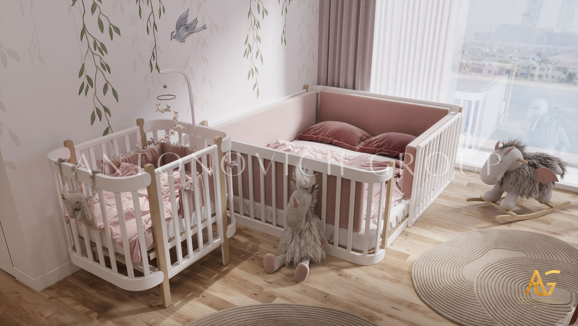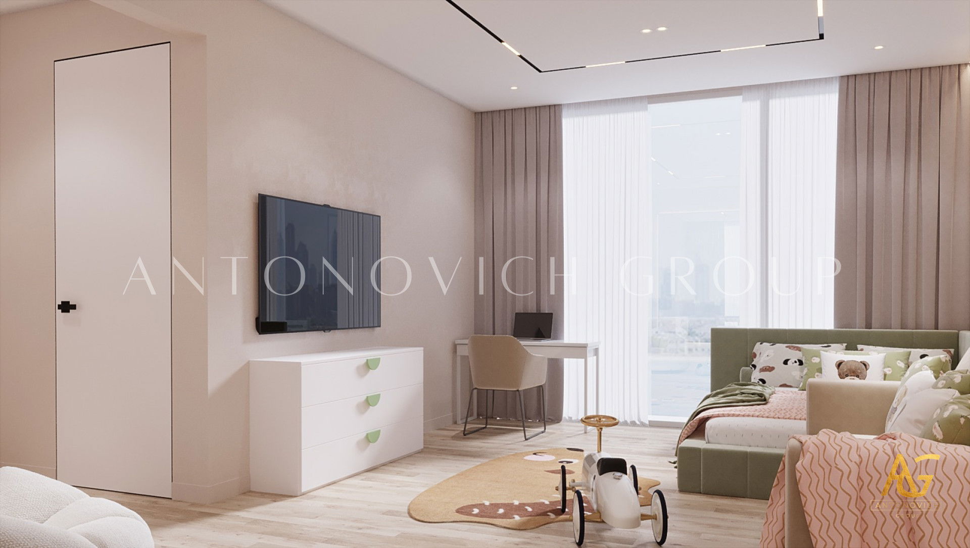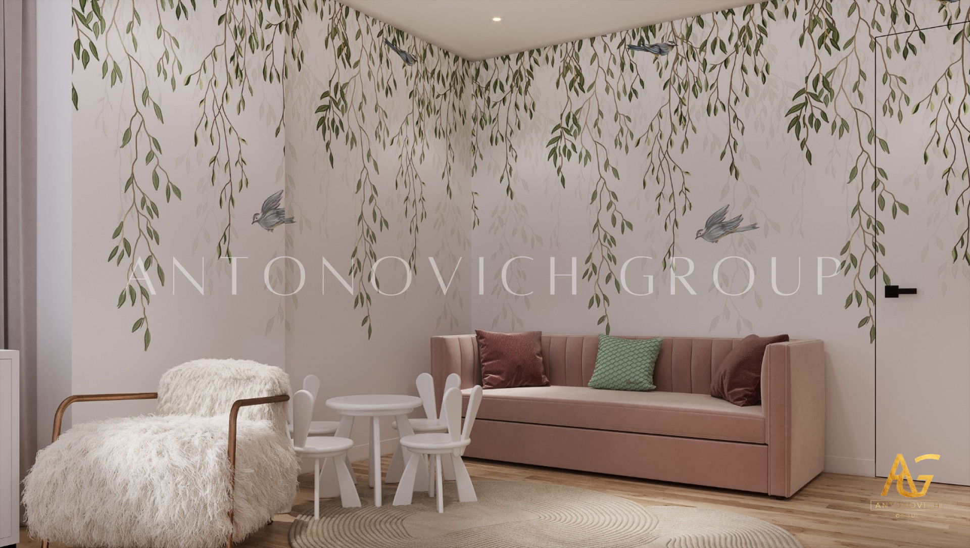 Childrens room interior design just fascinates with its gentle and comfortable image. Childrens room design is subject to certain rules and regulations as a separate direction in the studio Antonovich Group. In work on the childrens room project, we certainly consider the childs age, character traits, and hobbies. Childrens room interior design for the youngest considers the comfort zone for adults, and at this stage spend a lot of time with the child. For a luxurious and comfortable childrens room interior designers in Dubai offered a neoclassical style with an elegant and stylish touch. A nice range of shades with accents of pale yellow, green, and blue became the basis of the sunny and light mood of the childrens room interior design. The window is decorated with curtains of charming noble silk of cream shade, trimmed with a green braid. In the ceiling decoration tension element of the milky hue looks exquisite, which gently reflects the cozy space of the childrens room interior. Childrens room design also must take into account the use of noble materials. In the wall decor wallpaper of large strips in pastel colors has got an elegant and graceful look. The furniture fits perfectly into the gentle and warm mood of the interior. By the window for the comfort of adults a nice sofa, which is upholstered in milky fabric with a nice ornament in the form of small blue butterflies, is provided. The floor of natural wood is complemented by a natural carpet in a blue hue.