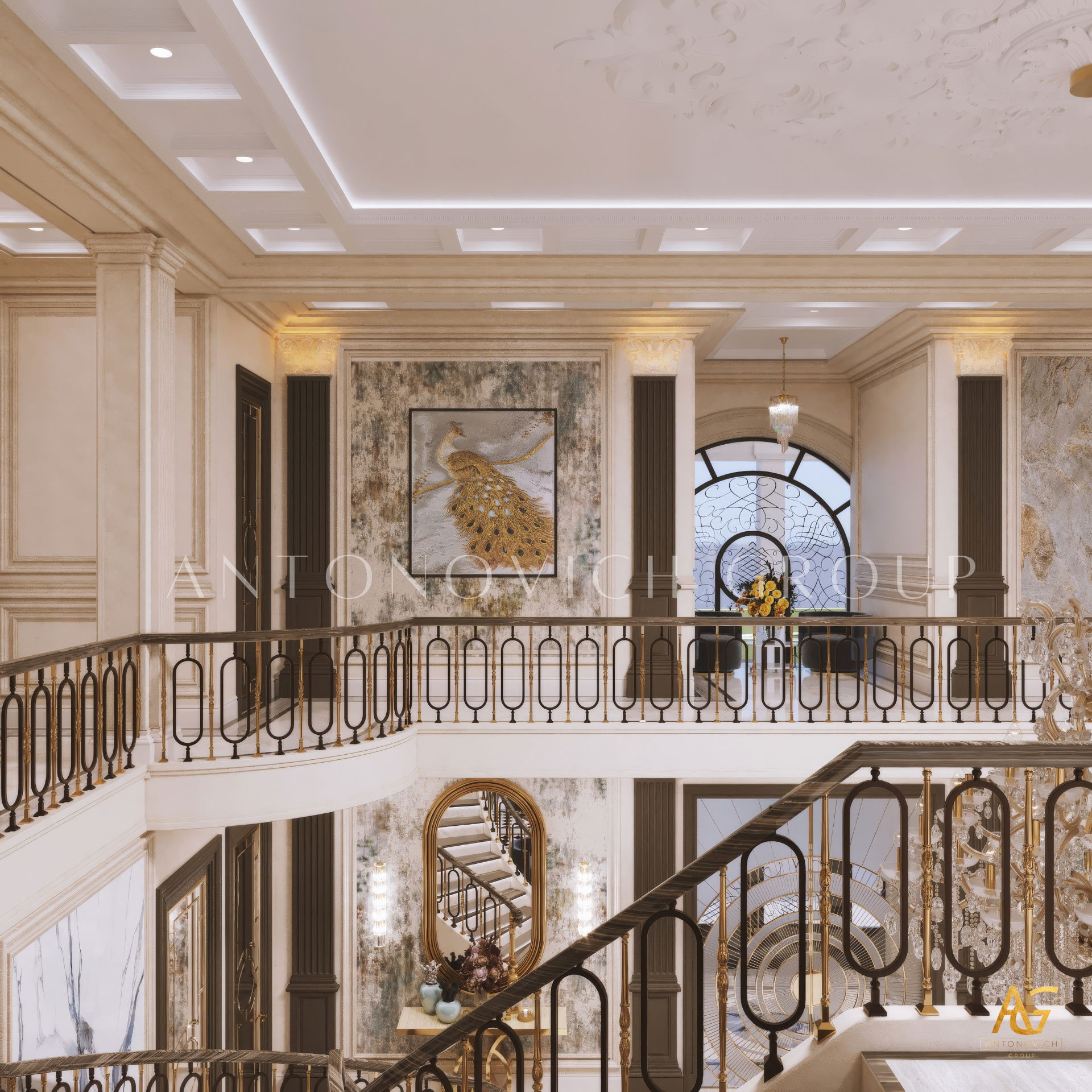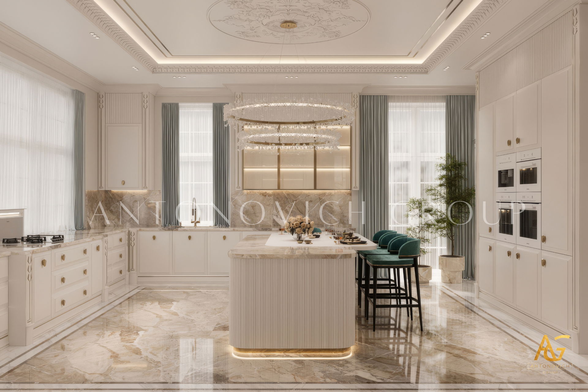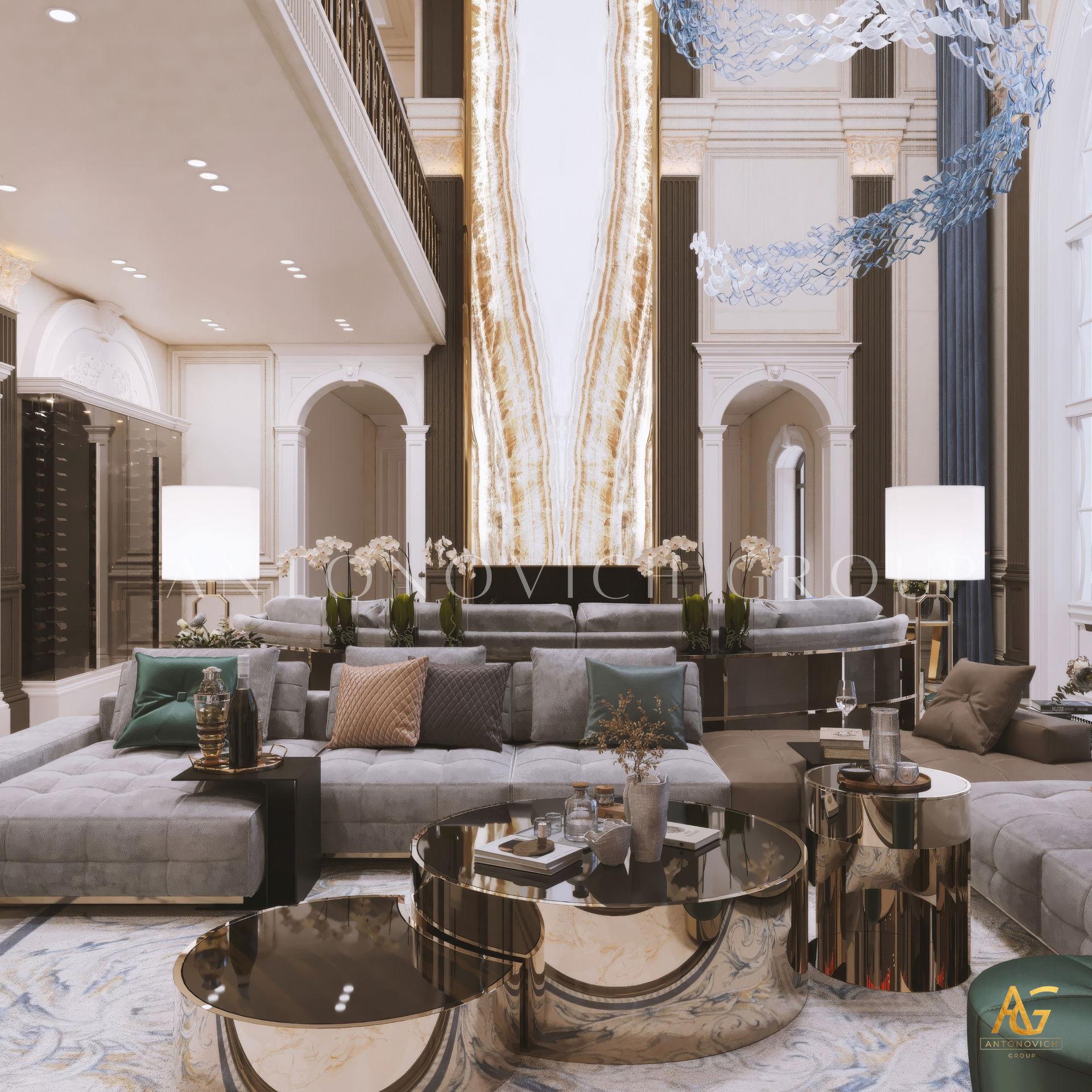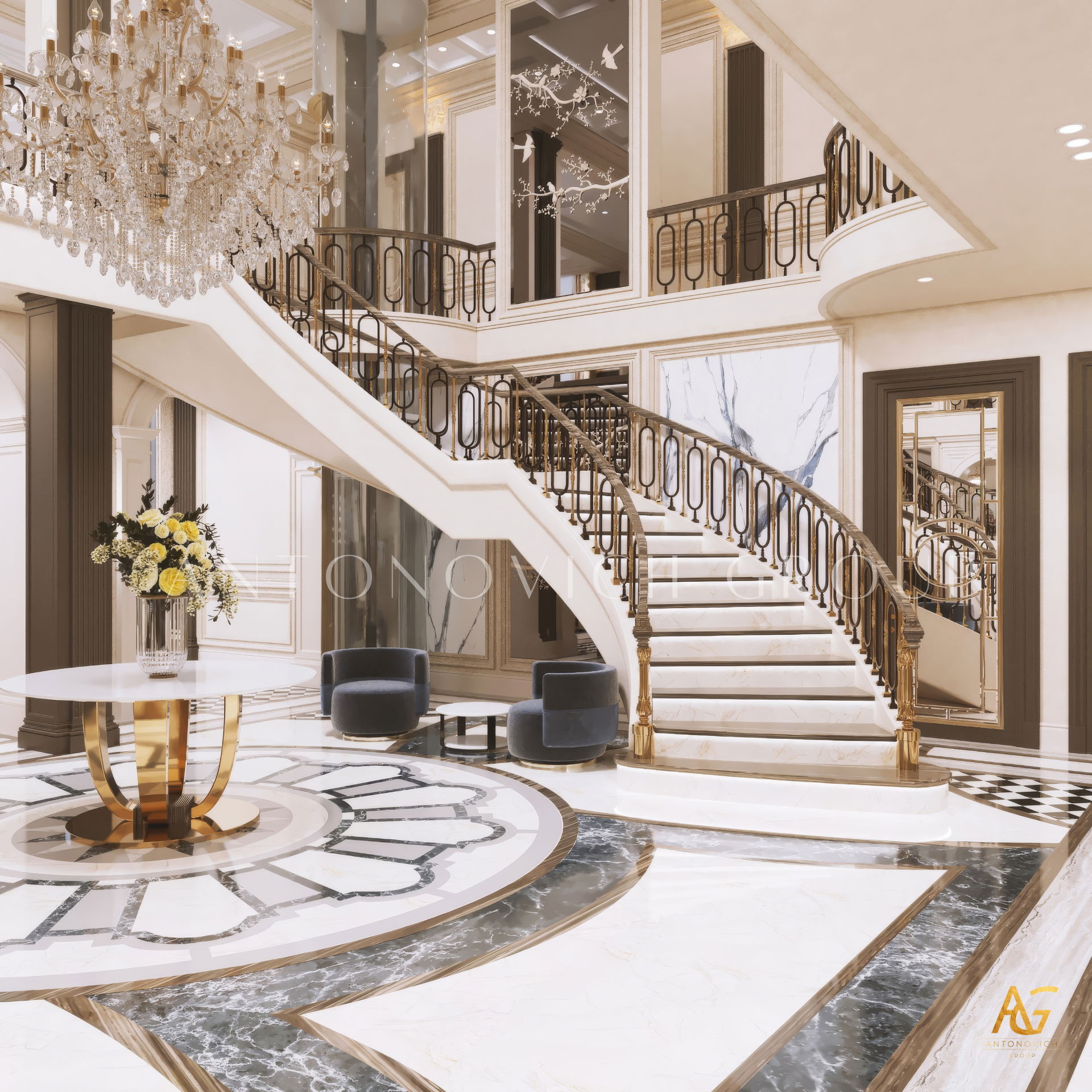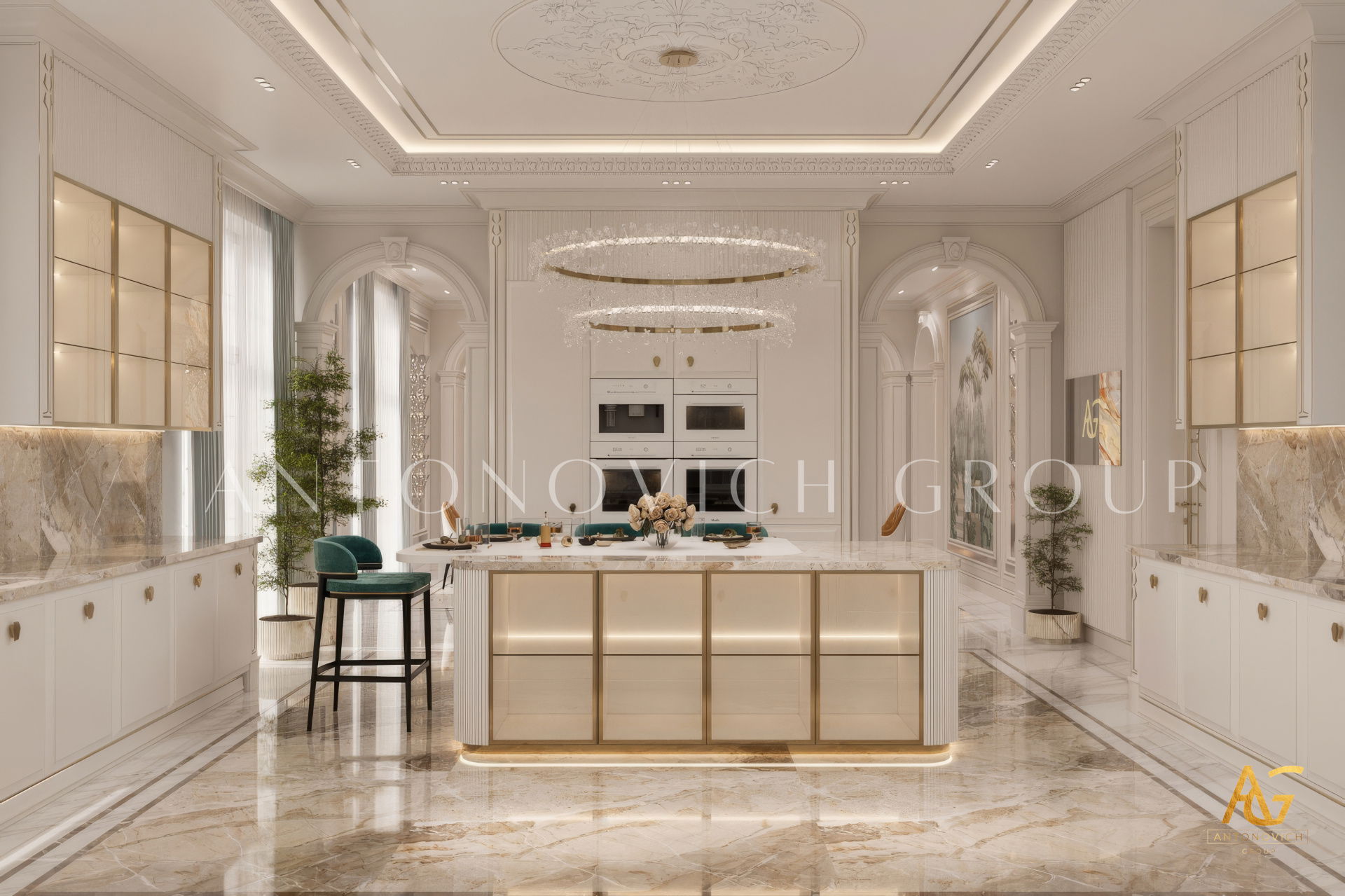 The grand and majestic villa project in Abu Dhabi is a masterpiece of creativity of talented interior designers from design studio Luxury Antonovich Design. The interior, which can be enjoyed forever. The interior, which gives a sense of aesthetic pleasure. The interior, about which you can write a poem or a symphony. A large and close family with aristocratic roots is lucky to have such a luxurious villa interior Abu Dhabi. Interior designers skillfully twist the classical style, Baroque and Rococo, complementing the subtle hints of Oriental style. The floor is made of natural marble with carved patterns, like a painting of a great artist. Thr floor on the ground floor can be admired from the height of the balustrade of the second floor. A delightful fireplace composition looks luxurious. Majestic image of the interior is complemented with rich decor of walls and ceilings. Interior designers perfectly organized a large spaceof the house, emphasizing the benefits of the architectural plan. The interior design combines stunning grandeur of the palace with the warmth of contemporary comfort. Furniture upholstered in noble creamy velvet and luxurious drapes of silk in soft blue hues look home-warm and cozy. Massive crystal chandelier fills the interior with festive mood. Noble status of respectable apartment is perfectly emphasized with the art of painting in the decoration of the walls and ceiling in the best traditions of the Renaissance. The interior design from the studio Luxury Antonovich Design is a fine art that will go in history and will delight more than one generation.