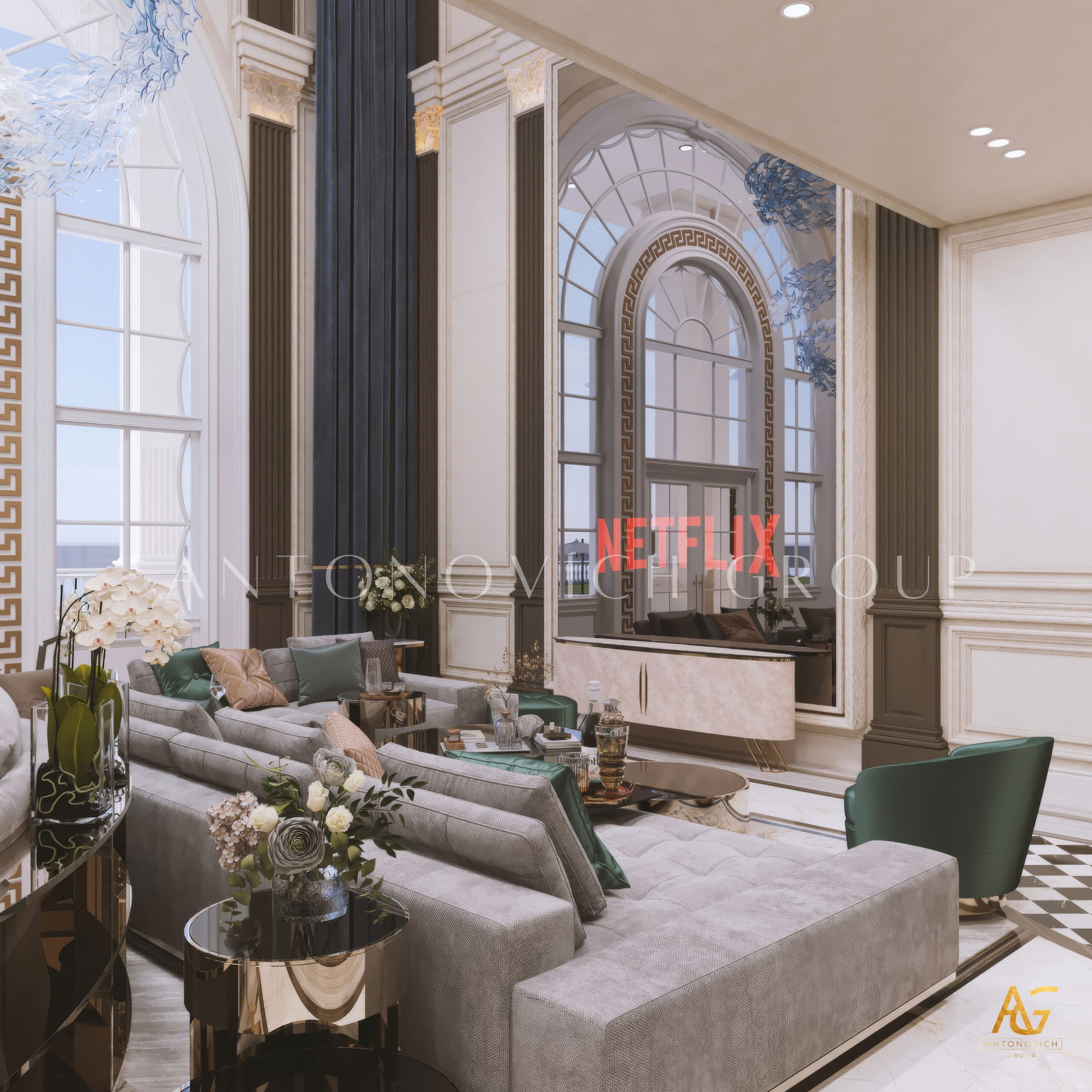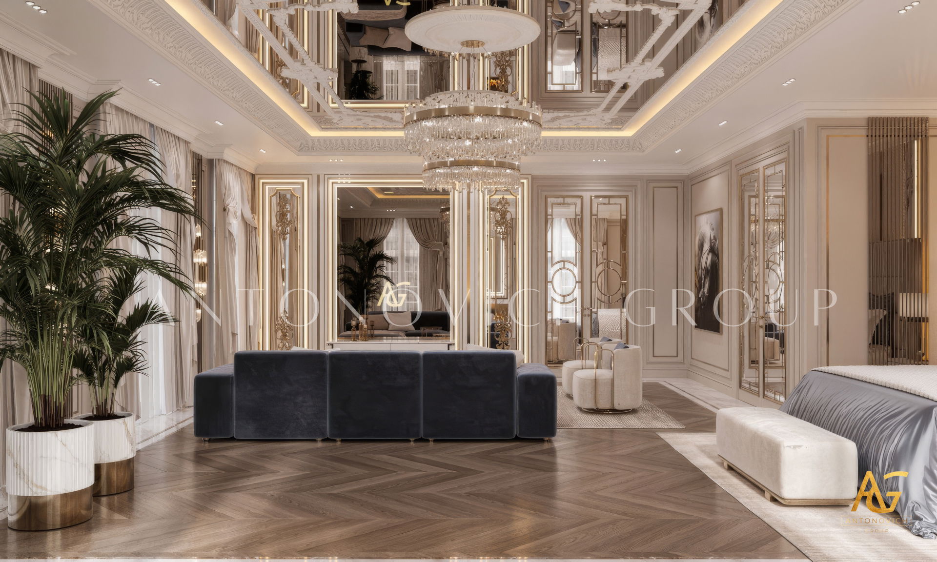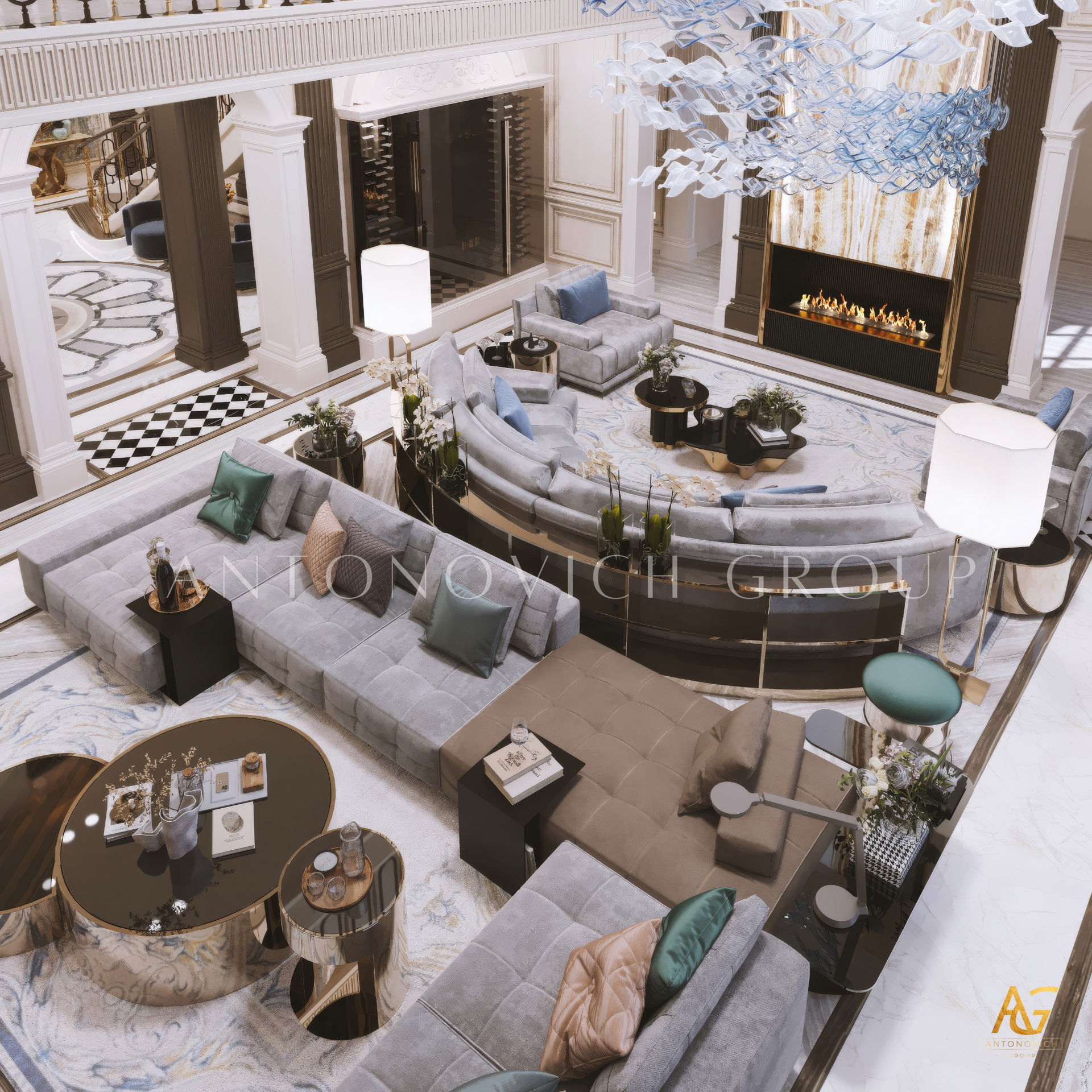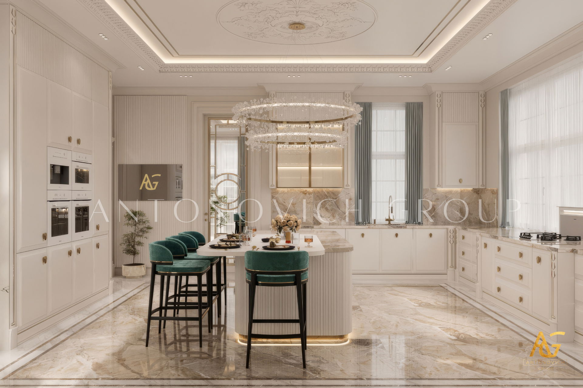 The grand and majestic villa project in Abu Dhabi is a masterpiece of creativity of talented interior designers from design studio Luxury Antonovich Design. The interior, which can be enjoyed forever. The interior, which gives a sense of aesthetic pleasure. The interior, about which you can write a poem or a symphony. A large and close family with aristocratic roots is lucky to have such a luxurious villa interior Abu Dhabi. Interior designers skillfully twist the classical style, Baroque and Rococo, complementing the subtle hints of Oriental style. The floor is made of natural marble with carved patterns, like a painting of a great artist. Thr floor on the ground floor can be admired from the height of the balustrade of the second floor. A delightful fireplace composition looks luxurious. Majestic image of the interior is complemented with rich decor of walls and ceilings. Interior designers perfectly organized a large spaceof the house, emphasizing the benefits of the architectural plan. The interior design combines stunning grandeur of the palace with the warmth of contemporary comfort. Furniture upholstered in noble creamy velvet and luxurious drapes of silk in soft blue hues look home-warm and cozy. Massive crystal chandelier fills the interior with festive mood. Noble status of respectable apartment is perfectly emphasized with the art of painting in the decoration of the walls and ceiling in the best traditions of the Renaissance. The interior design from the studio Luxury Antonovich Design is a fine art that will go in history and will delight more than one generation.