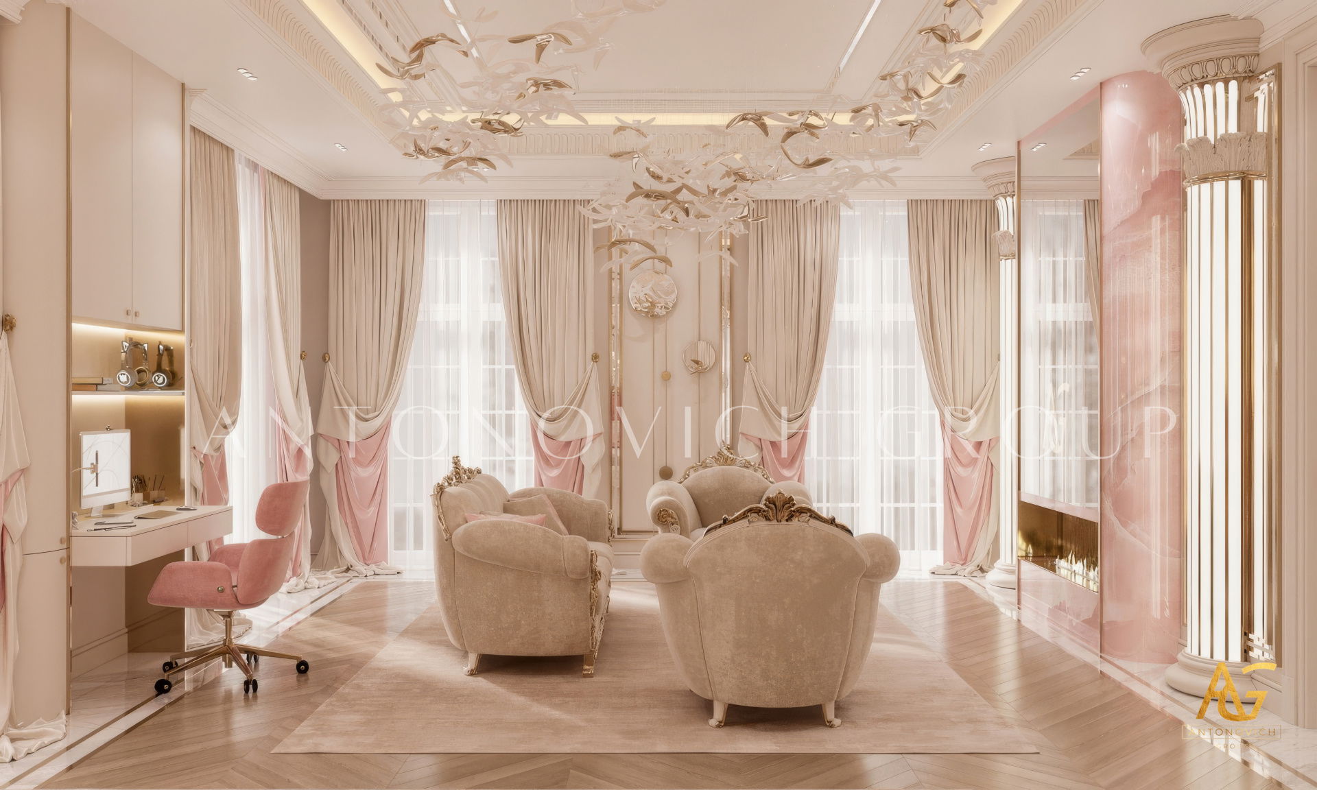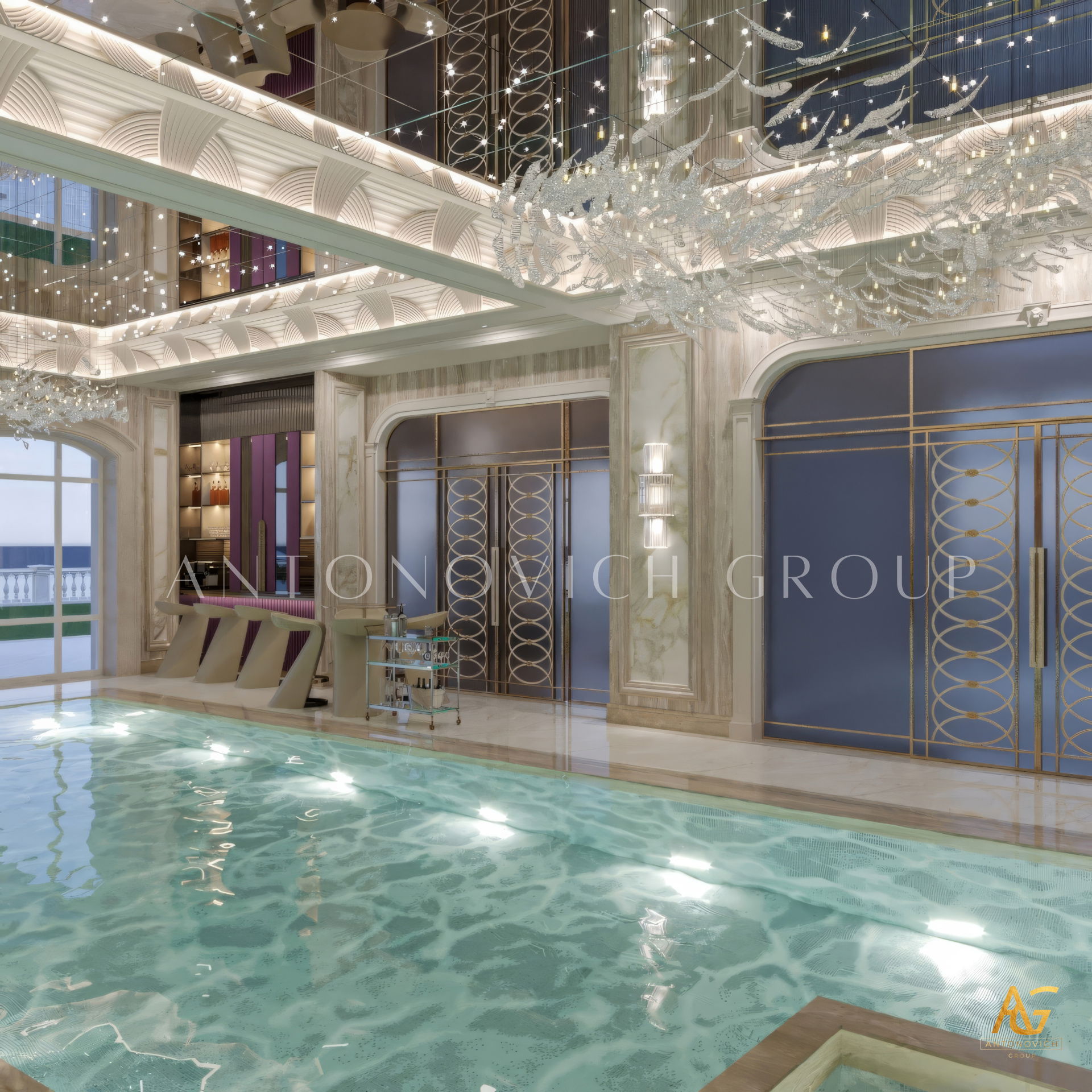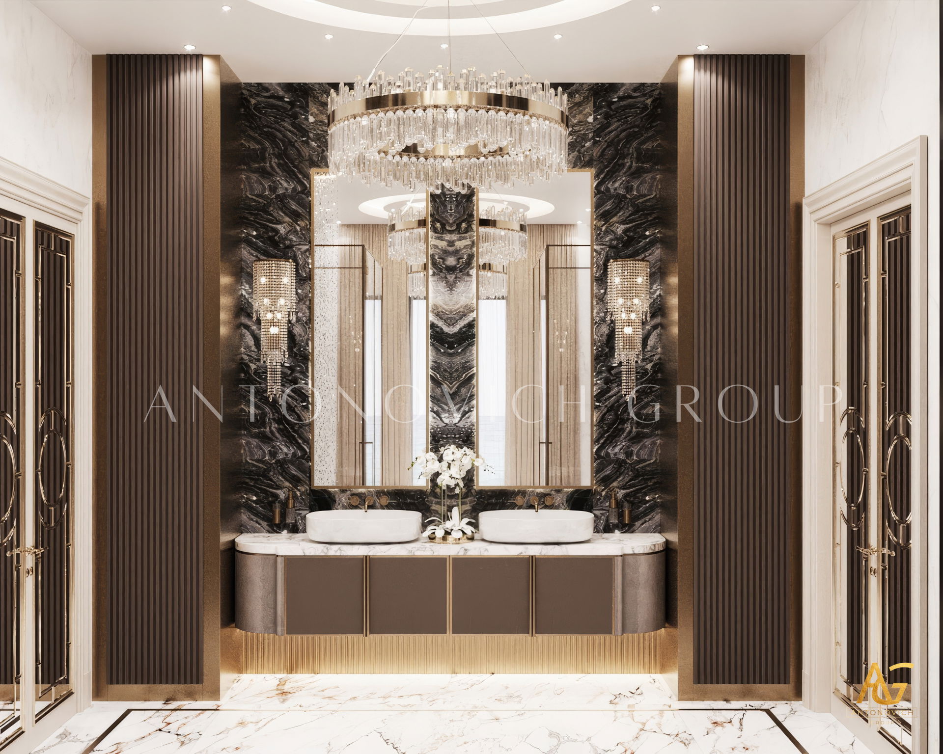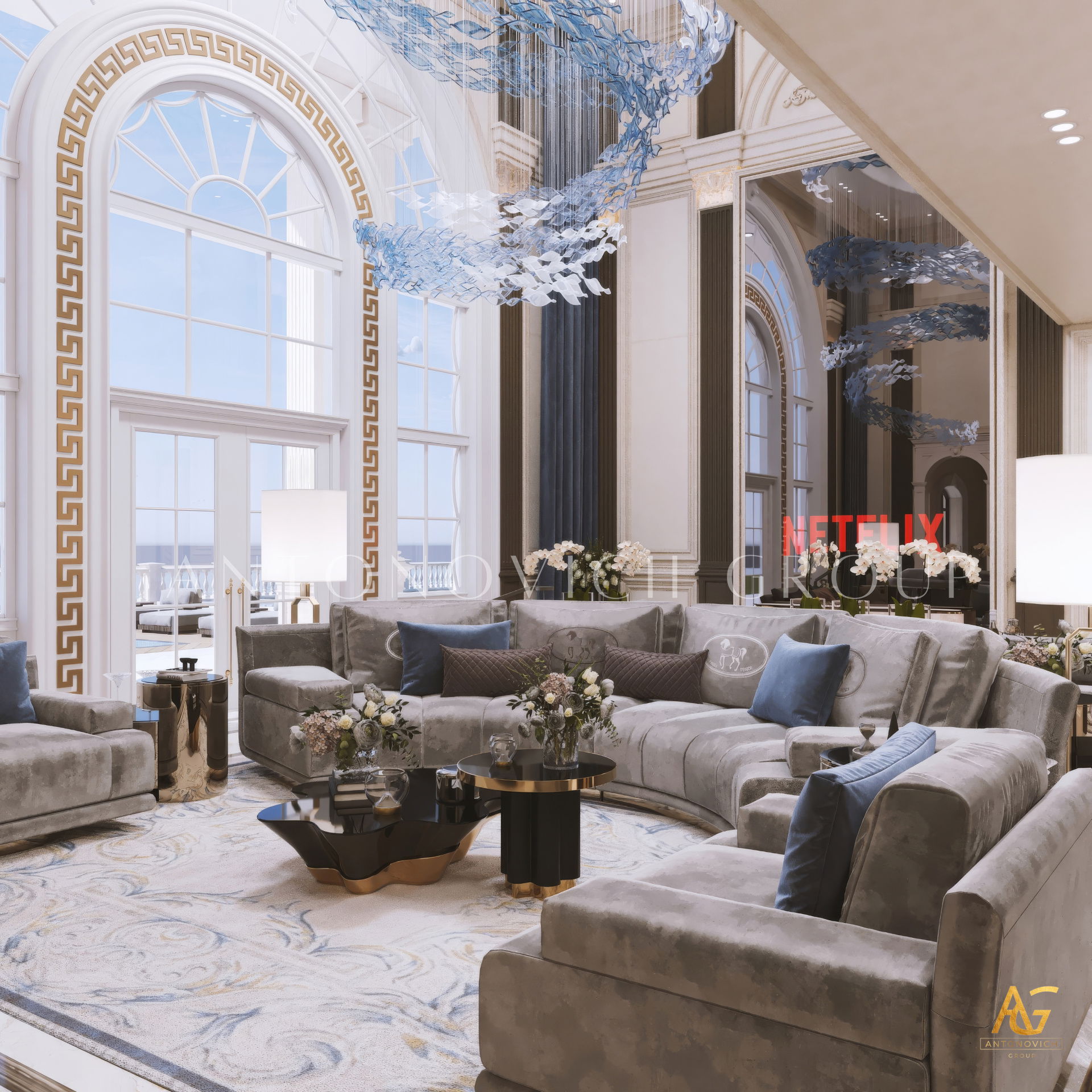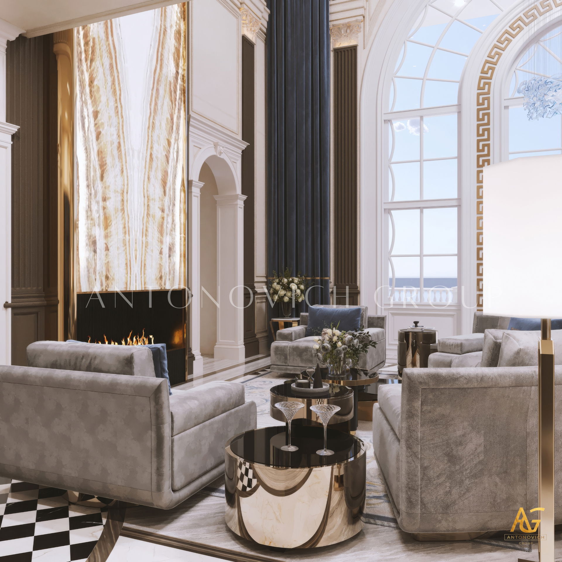 The grand and majestic villa project in Abu Dhabi is a masterpiece of creativity of talented interior designers from design studio Luxury Antonovich Design. The interior, which can be enjoyed forever. The interior, which gives a sense of aesthetic pleasure. The interior, about which you can write a poem or a symphony. A large and close family with aristocratic roots is lucky to have such a luxurious villa interior Abu Dhabi. Interior designers skillfully twist the classical style, Baroque and Rococo, complementing the subtle hints of Oriental style. The floor is made of natural marble with carved patterns, like a painting of a great artist. Thr floor on the ground floor can be admired from the height of the balustrade of the second floor. A delightful fireplace composition looks luxurious. Majestic image of the interior is complemented with rich decor of walls and ceilings. Interior designers perfectly organized a large spaceof the house, emphasizing the benefits of the architectural plan. The interior design combines stunning grandeur of the palace with the warmth of contemporary comfort. Furniture upholstered in noble creamy velvet and luxurious drapes of silk in soft blue hues look home-warm and cozy. Massive crystal chandelier fills the interior with festive mood. Noble status of respectable apartment is perfectly emphasized with the art of painting in the decoration of the walls and ceiling in the best traditions of the Renaissance. The interior design from the studio Luxury Antonovich Design is a fine art that will go in history and will delight more than one generation.